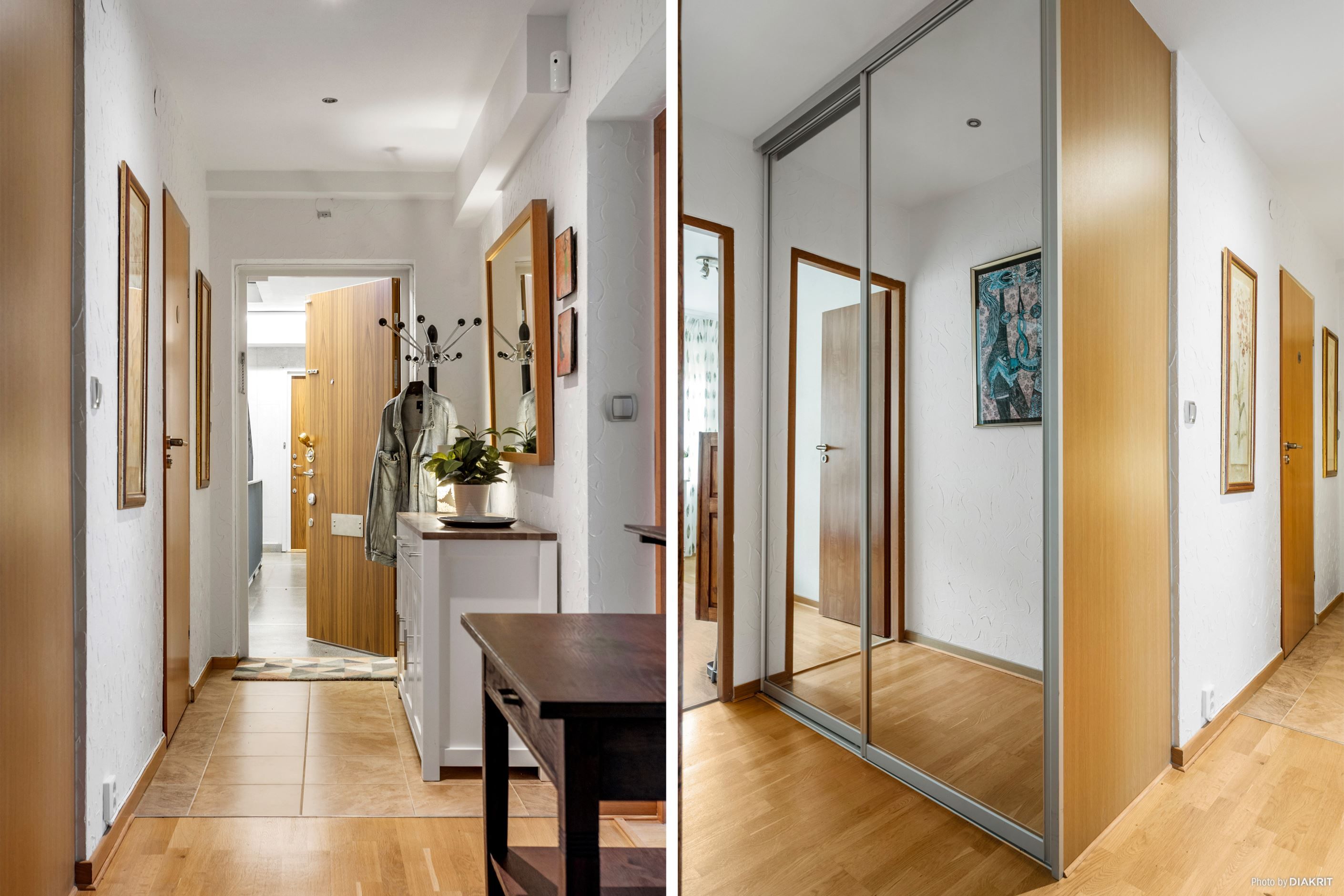 Redan i hallen möts du av en ljus och välkomnande atmosfär med gott om förvaring och ett snyggt stengolv som både är praktiskt och stilrent.