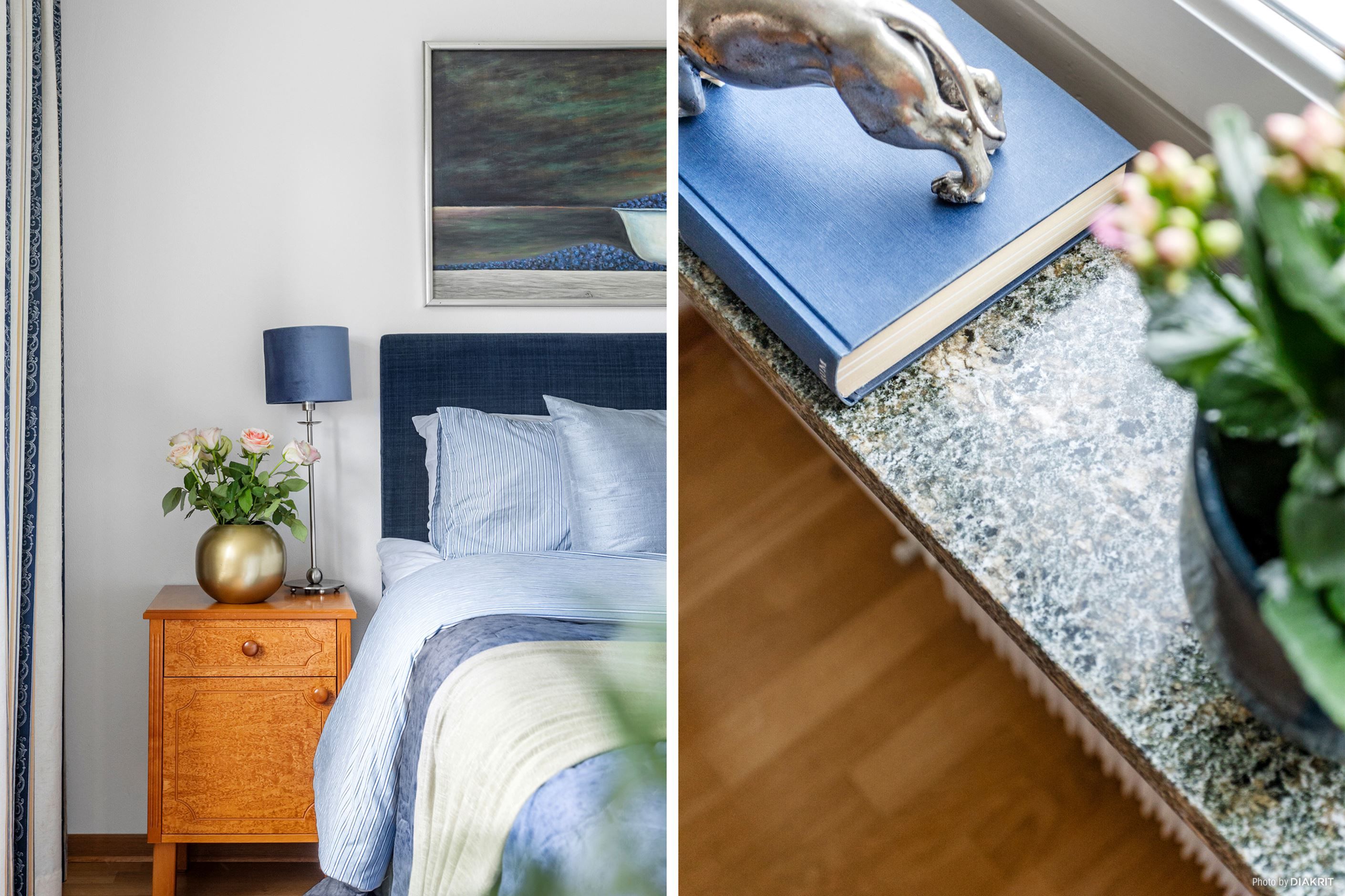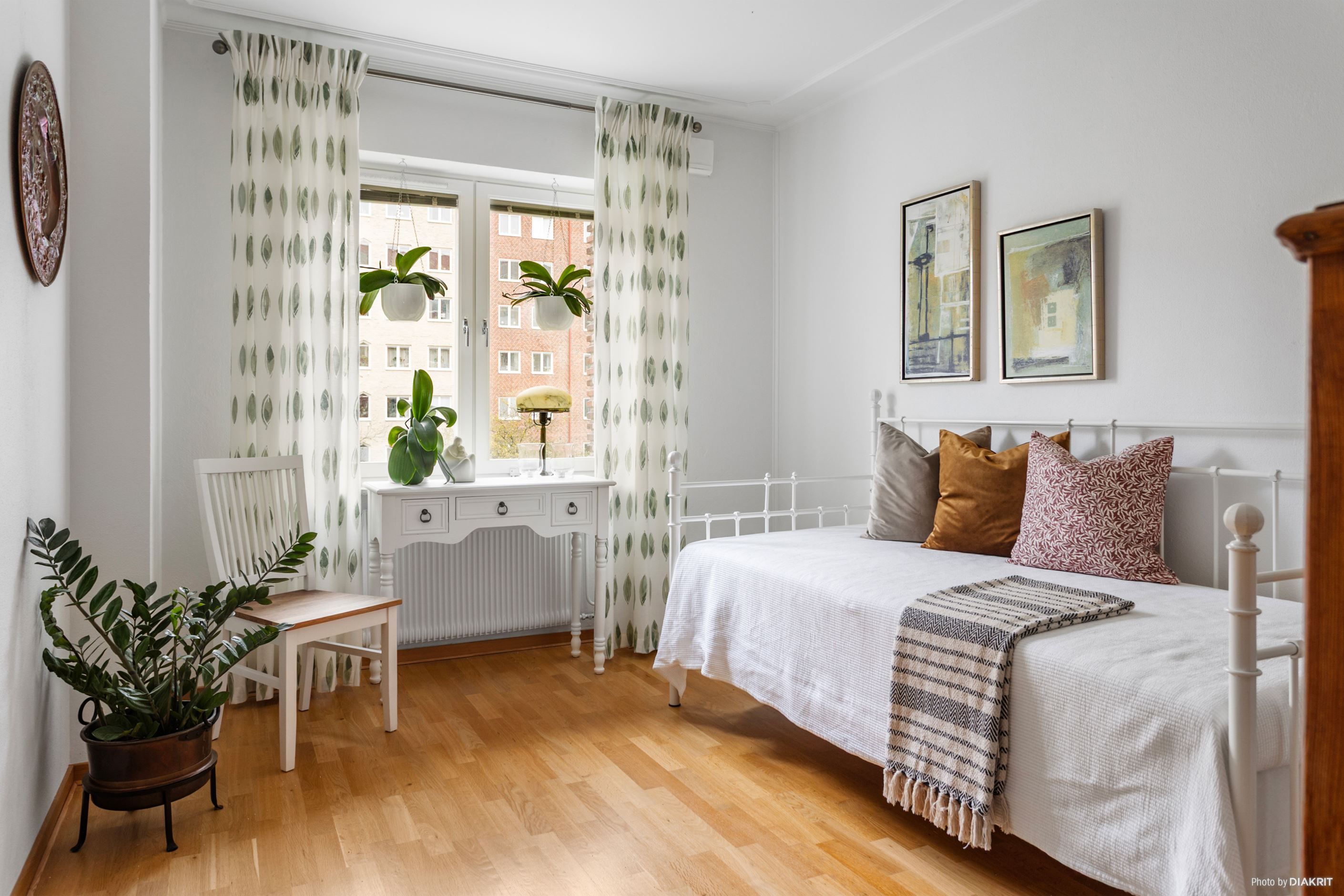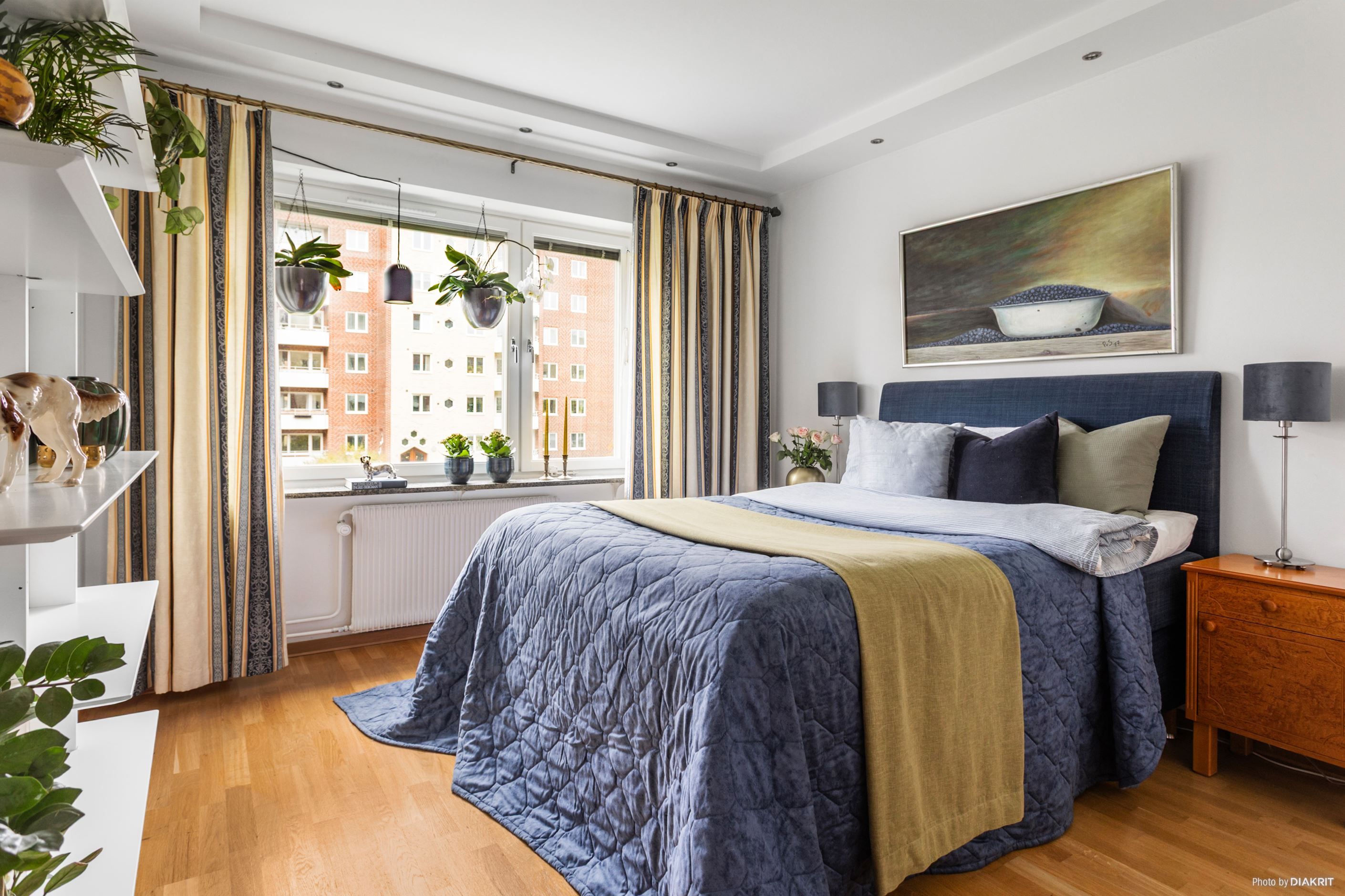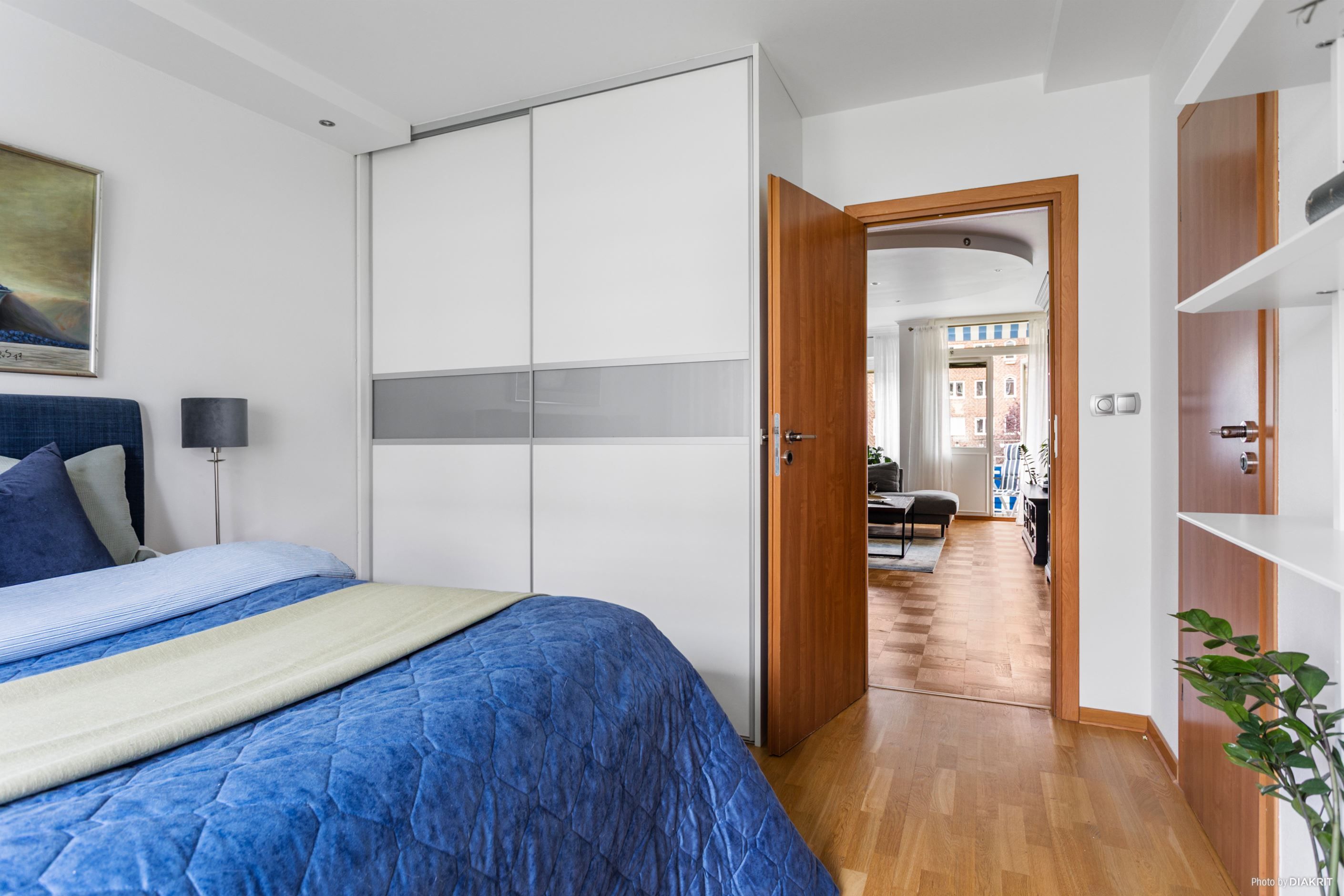 Sovrummet är generöst tilltaget och erbjuder både klädkammare och garderob – perfekt för dig som uppskattar gott om förvaring. Vita väggar, fint parkettgolv och infällda spotlights skapar en lugn och harmonisk miljö.