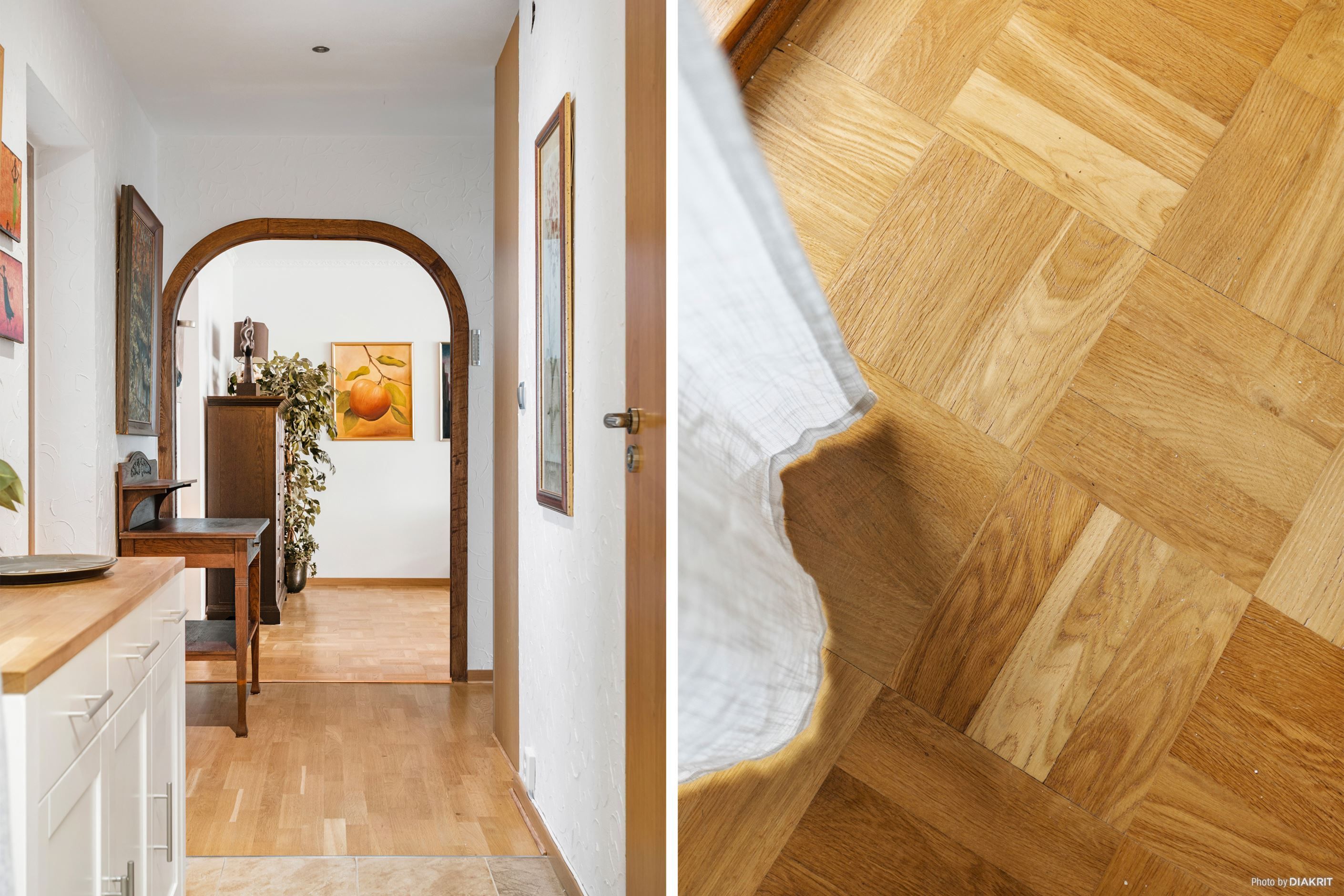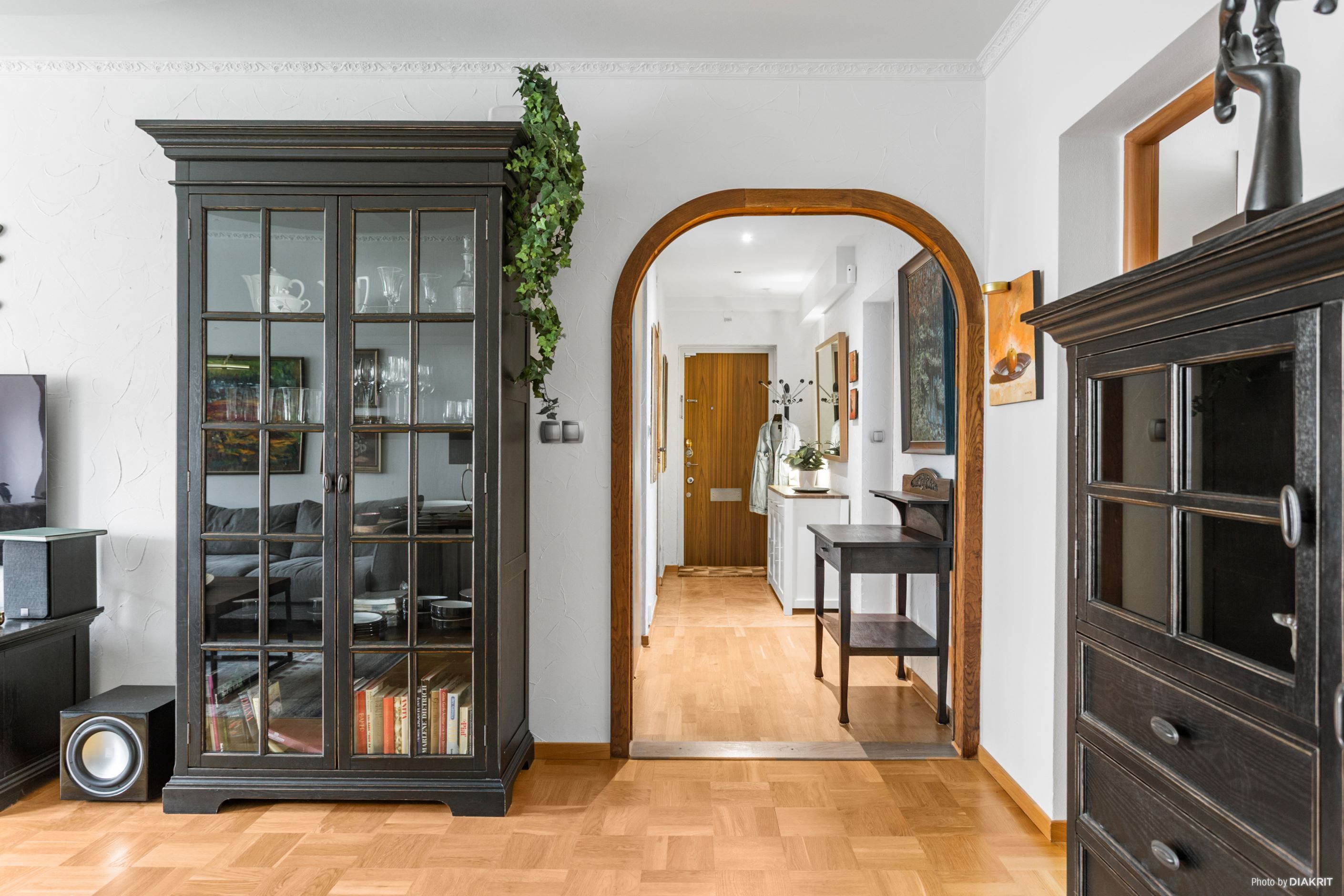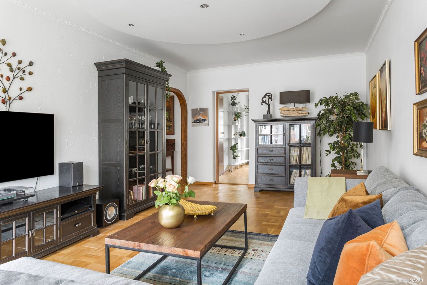 Det rymliga vardagsrummet bjuder på vackert parkettgolv, stuckaturer och inbyggda spotlights som sätter stämningen. Härifrån når du även den härliga balkongen, där du kan njuta av morgonkaffet eller kvällssolen.