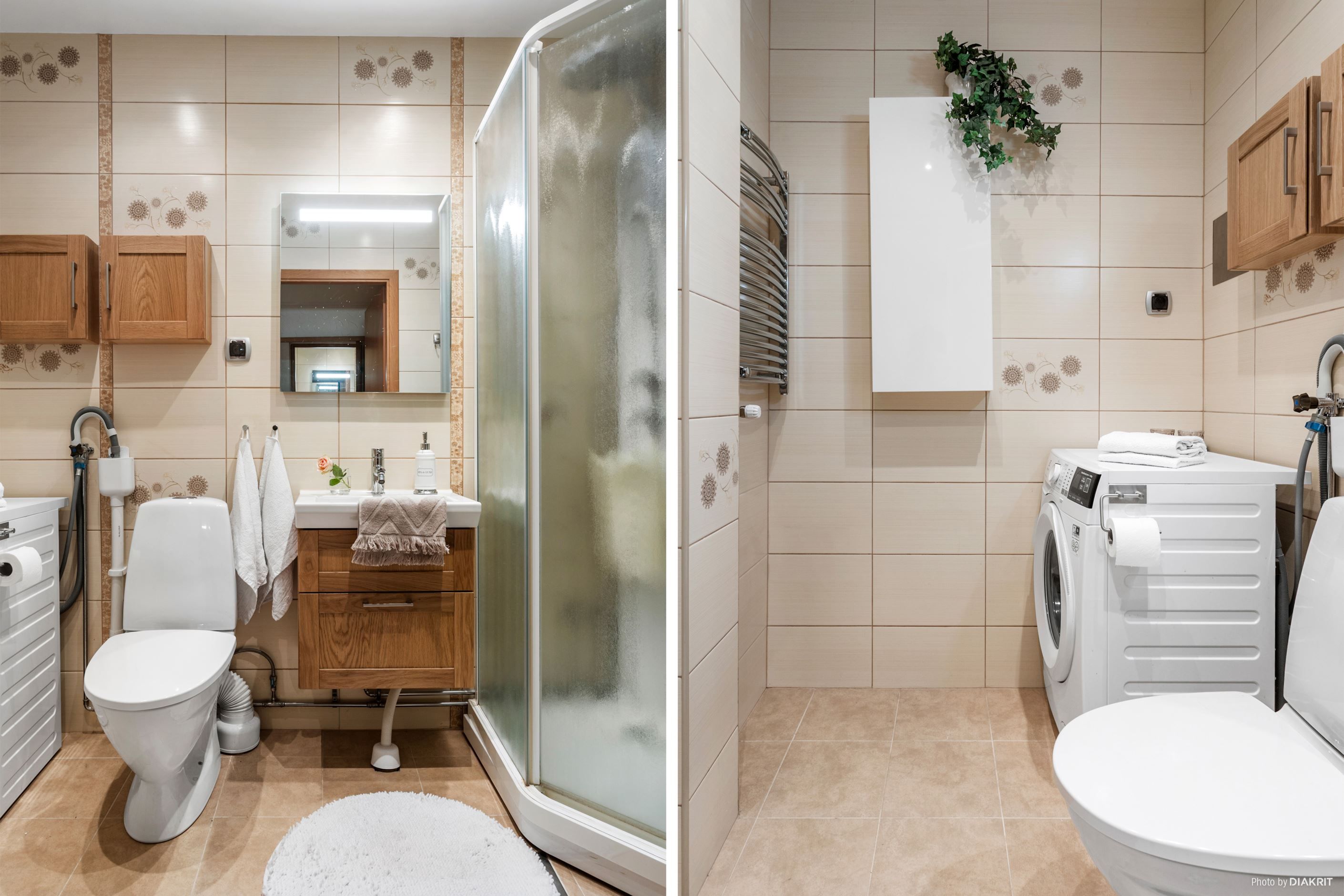 Det helkaklade badrummet är fräscht och praktiskt utrustat med duschkabin, wc, kommod med handfat och tvättmaskin.