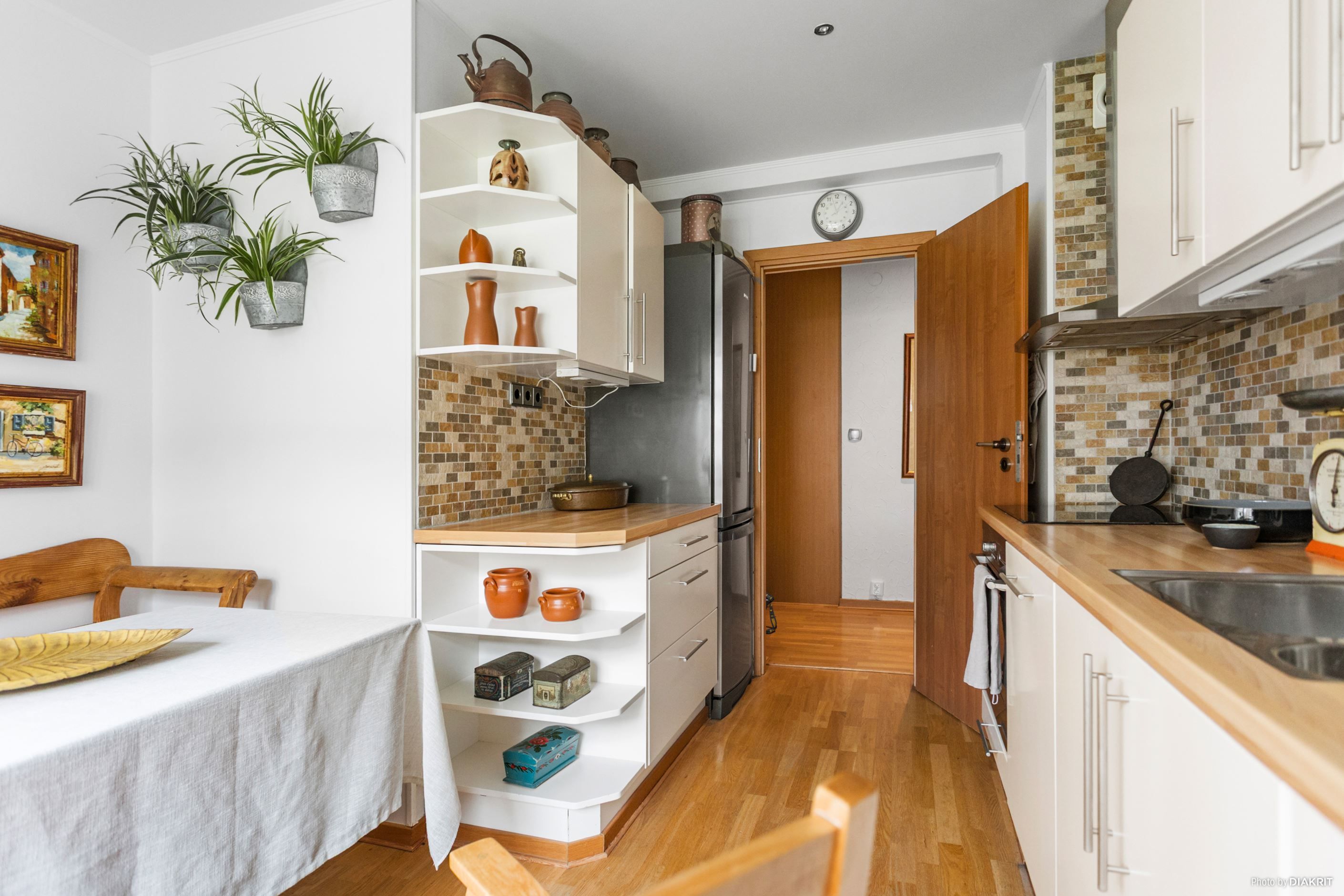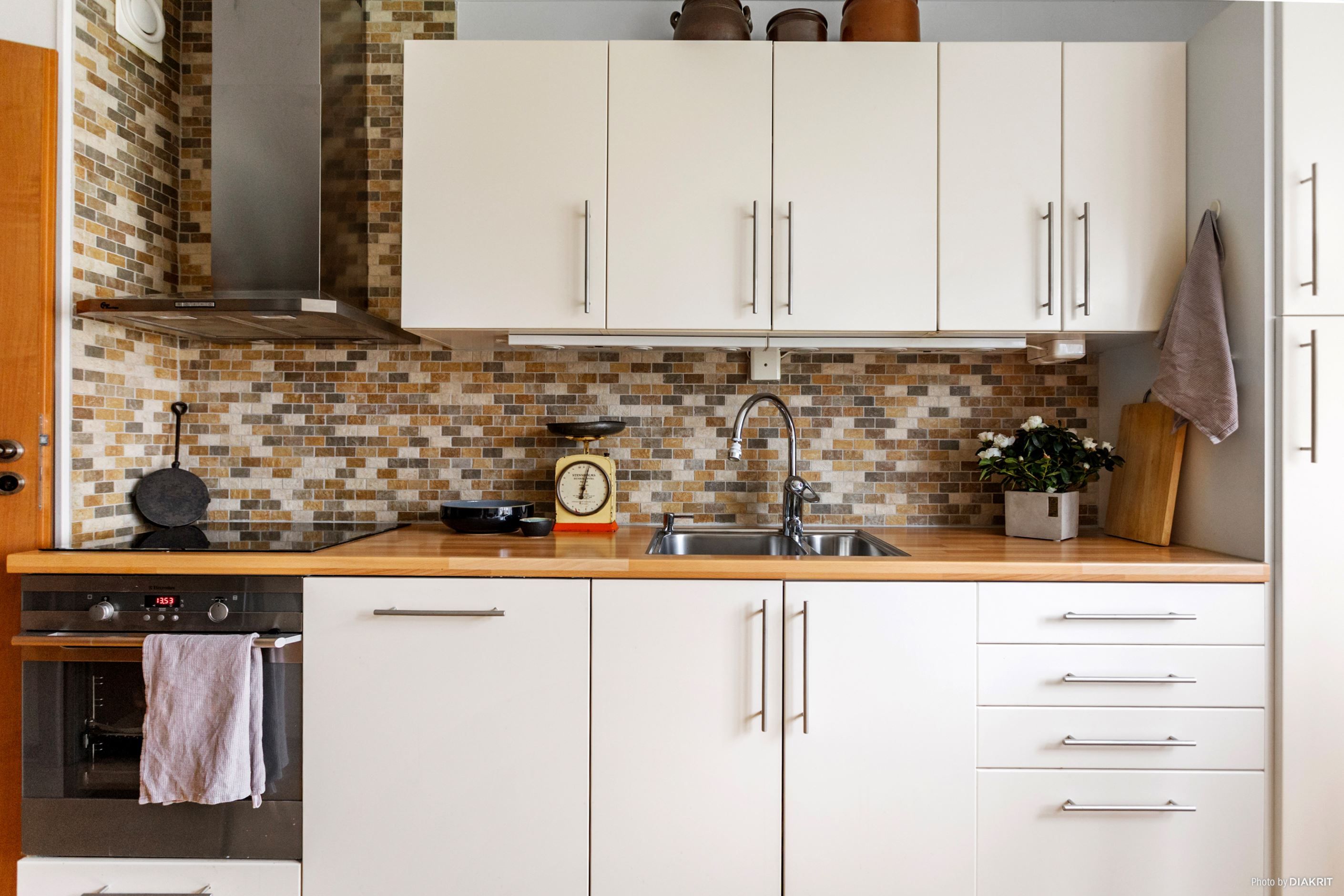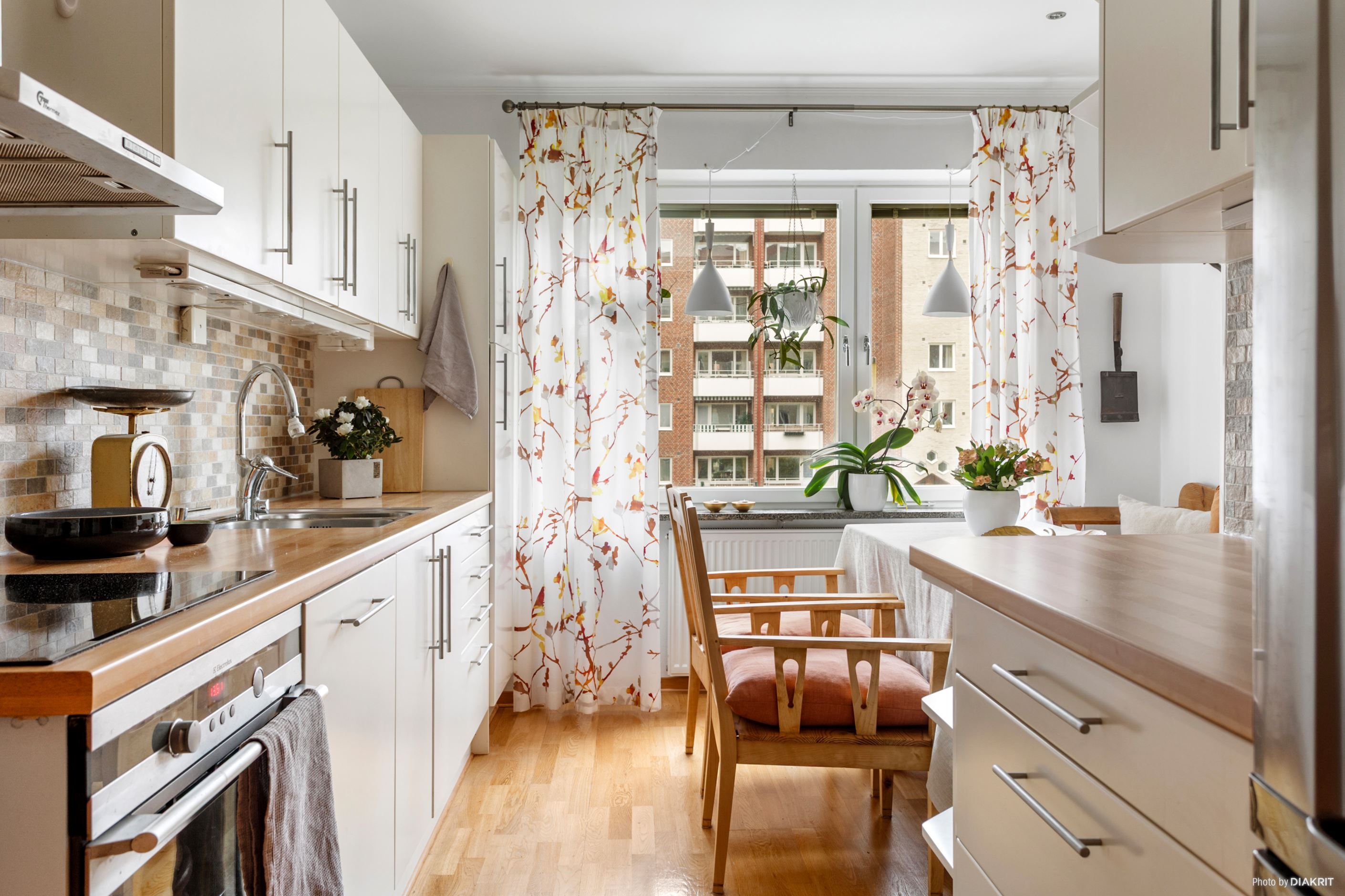 Det fräscha köket är utrustat med allt du behöver: spishäll, ugn, fläkt, kyl/frys och diskmaskin. Det stilrena kaklet i kombination med träbänkskivan skapar en varm och modern känsla. Här finns gott om förvaring och plats för matbord, perfekt för både vardag och umgänge.