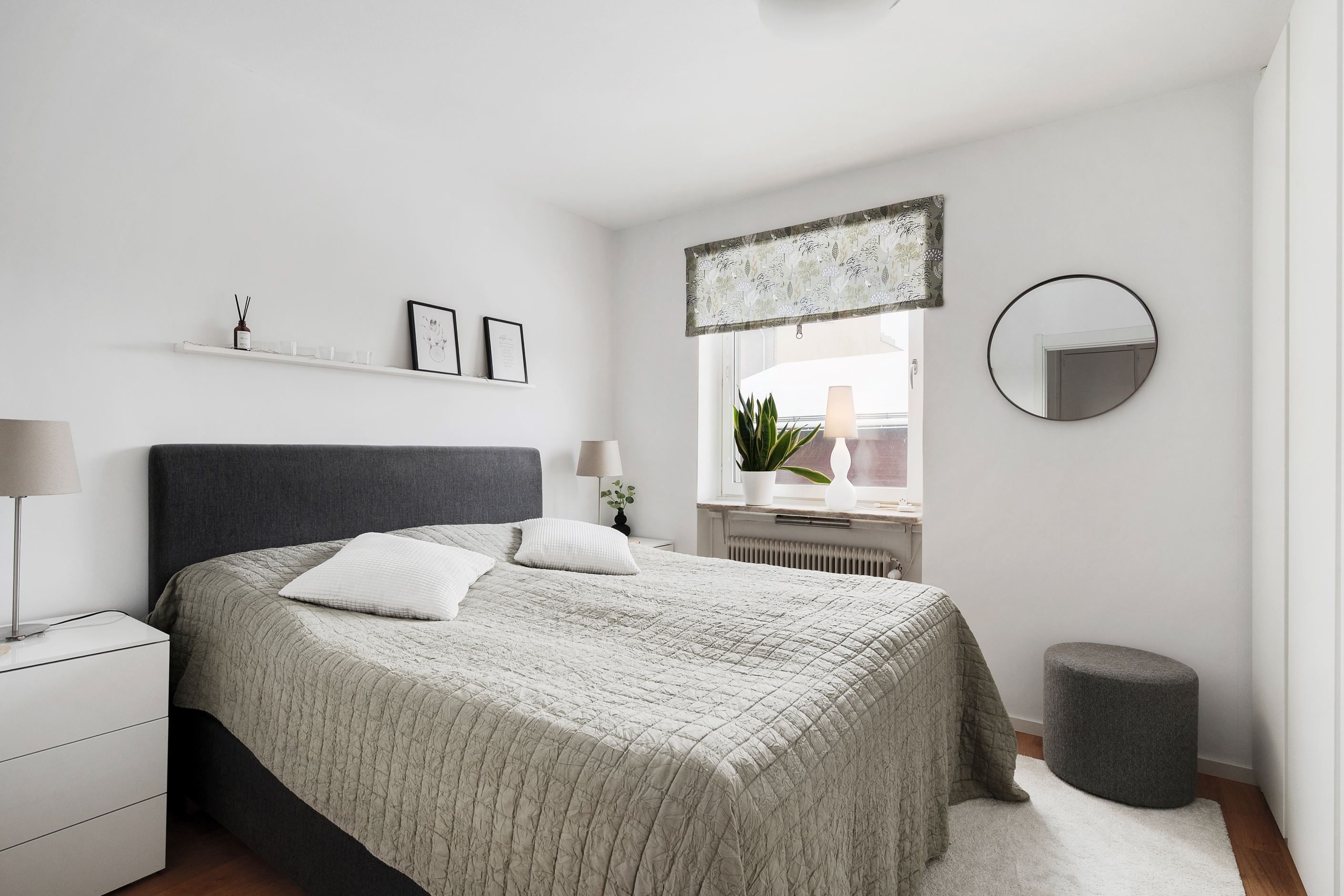Sovrummet är rofyllt och rymligt med plats för dubbelsäng och kompletterande möblemang. Praktiska, inbyggda garderober ger god förvaring och bidrar till ett harmoniskt intryck. Badrummet är stilrent med mörkt klinkergolv, ljusa väggar och modern utrustning som skapar en elegant och funktionell miljö.