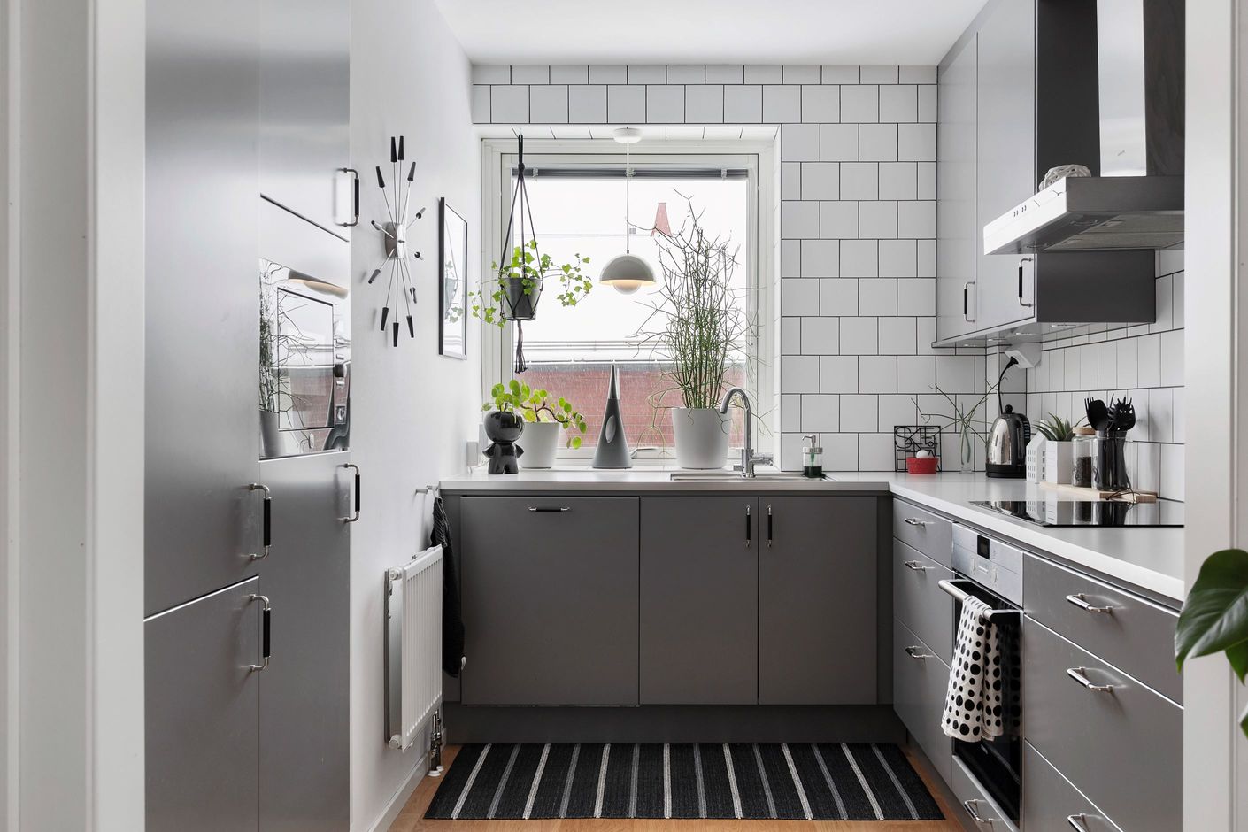 Det smakfullt renoverade köket går i stilrena, mörkgrå toner med släta luckor som möter ljus bänkskiva och vitt kakel. Här finns gott om arbetsyta och modern maskinell utrustning, vilket gör det lika naturligt att laga vardagsmiddag som att bjuda in till sociala kvällar med vänner.