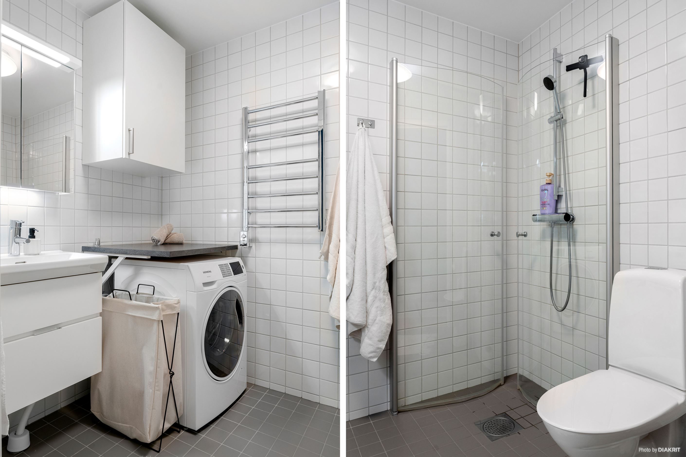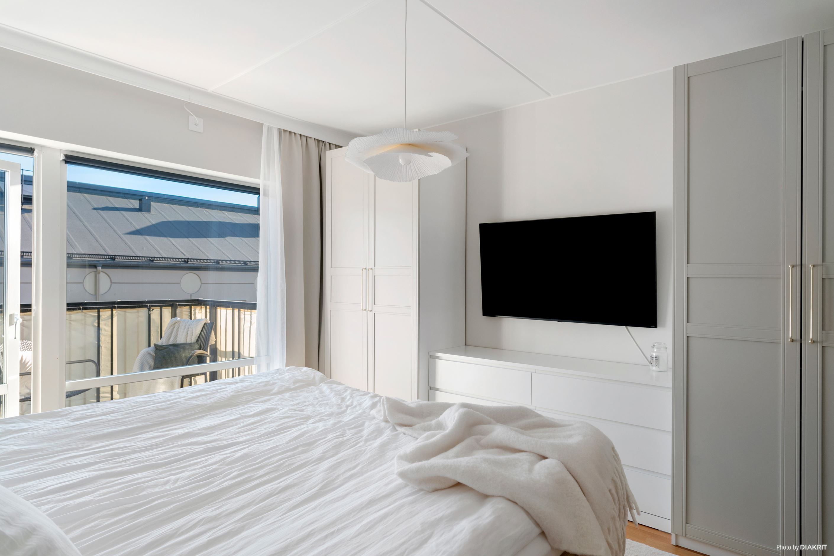 Sovrummet är rofyllt och erbjuder goda förvaringsmöjligheter, medan det helkaklade badrummet i vitt håller en stilren och tidlös design och är utrustat med kombimaskin som underlättar vardagen.