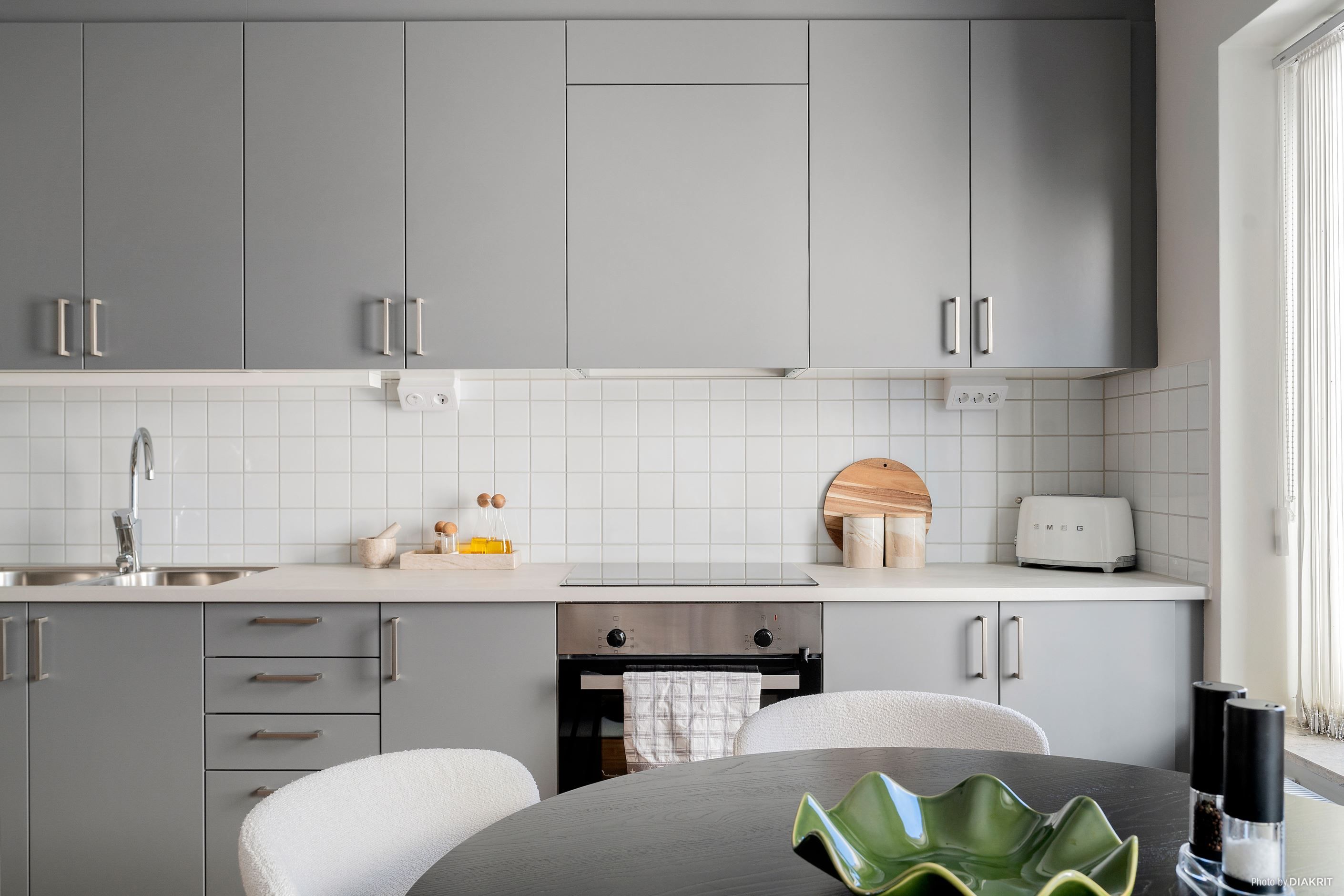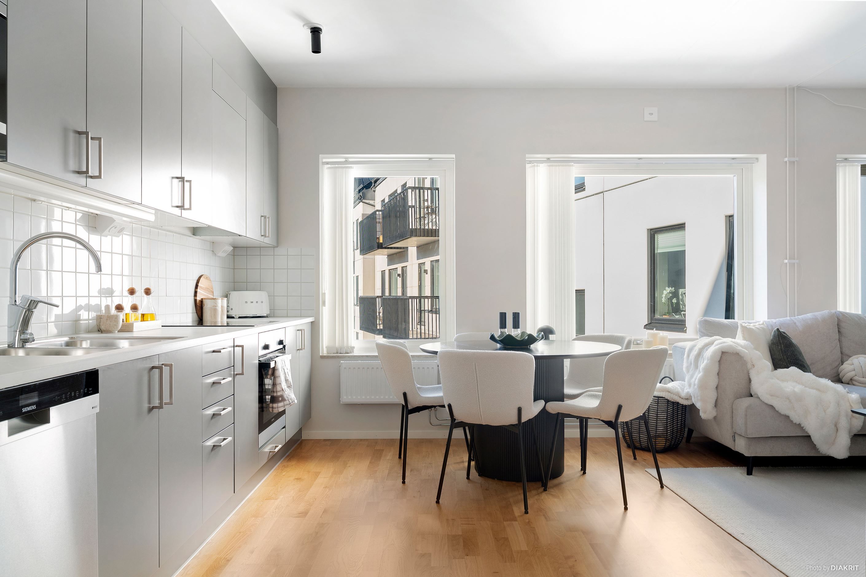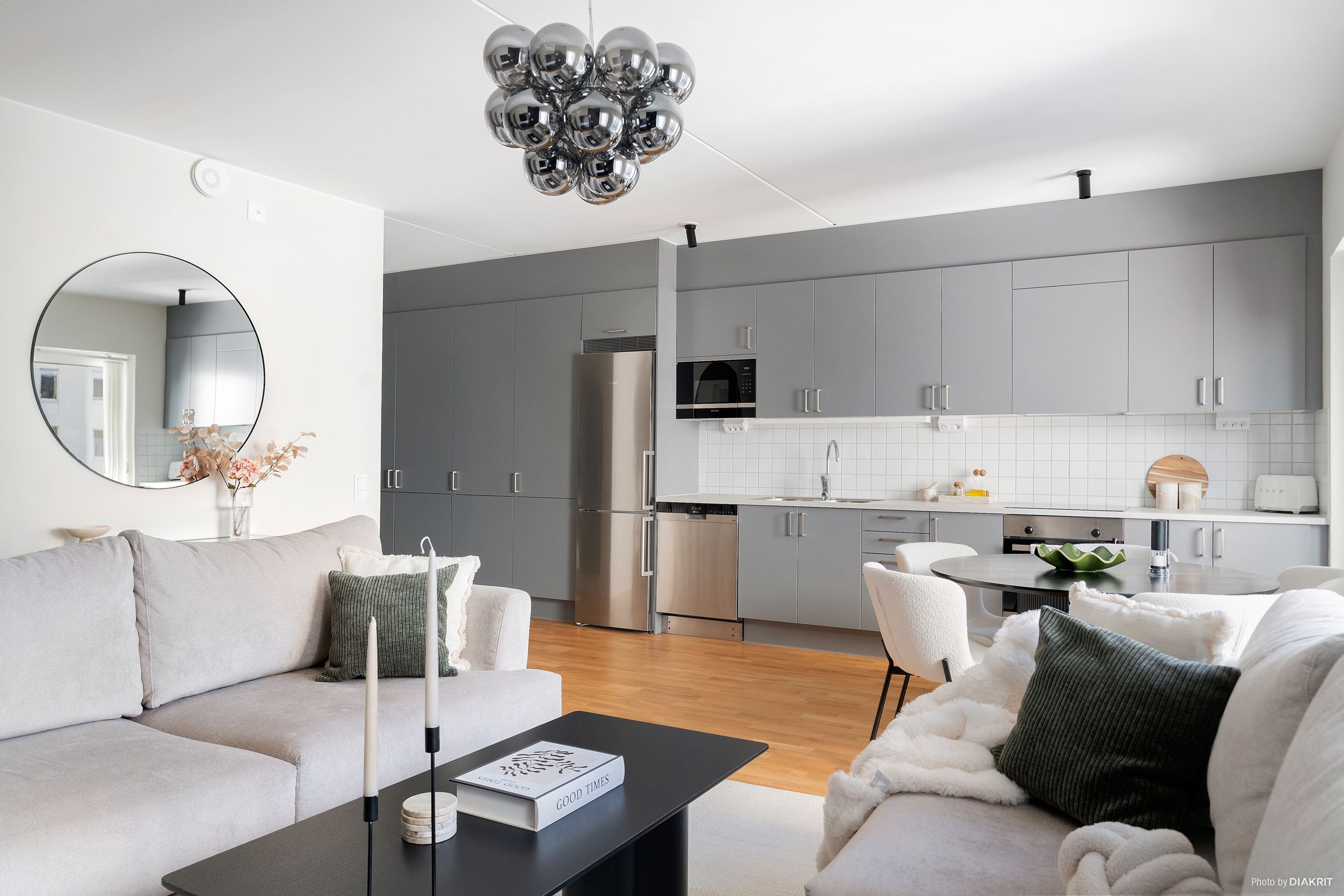 Bostaden präglas av genomgående hög standard med enhetligt parkettgolv och smakfulla materialval. Det moderna köket från Marbodal i grå kulör kombineras med vitt kakel ovan arbetsytorna och erbjuder generösa förvaringsmöjligheter samt bra arbetsytor. Köket ligger i öppen planlösning mot vardagsrummet vilket skapar en social och trivsam yta med gott om plats för både matgrupp och soffdel. Från vardagsrummet nås den soliga balkongen som blir en naturlig förlängning av bostaden under årets varmare månader.