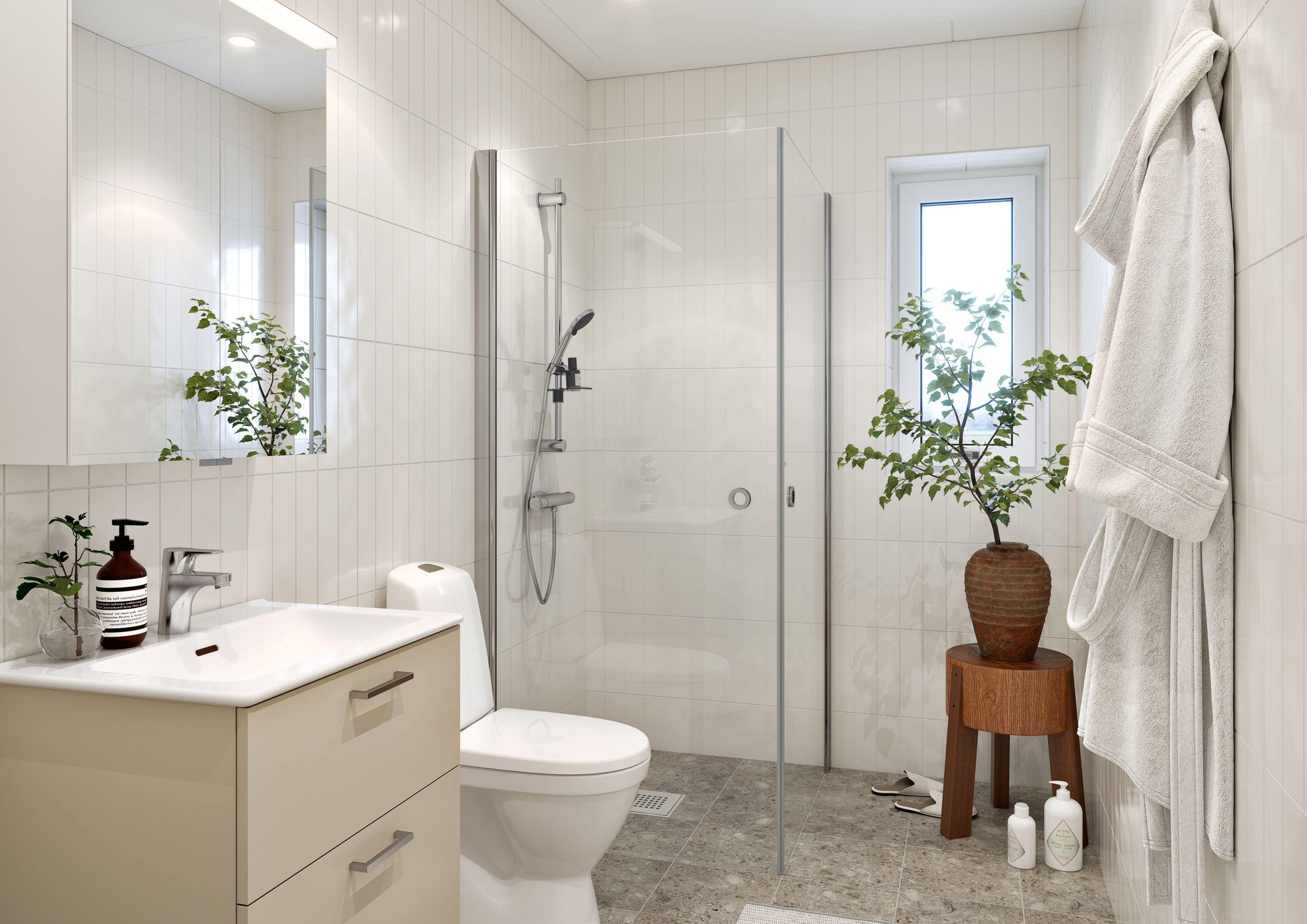 Båda badrummen är smakfullt inredda med kakel och klinker samt badrumsinredning från Svedbergs, där design och funktion samspelar i tidlös stil. Även tvättstugan är välutrustad med tvättmaskin och torktumlare från Siemens, vilket förenklar vardagens logistik.