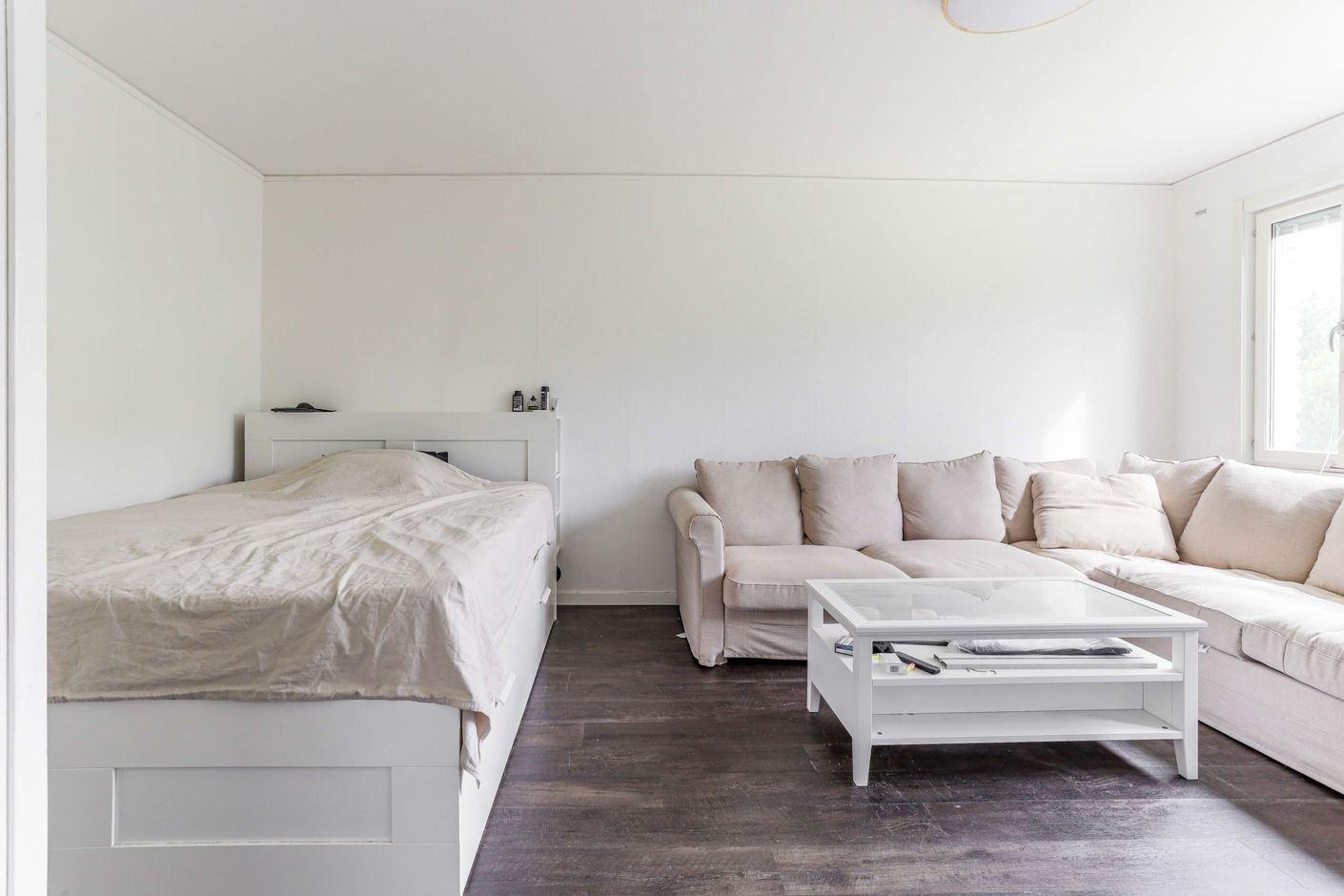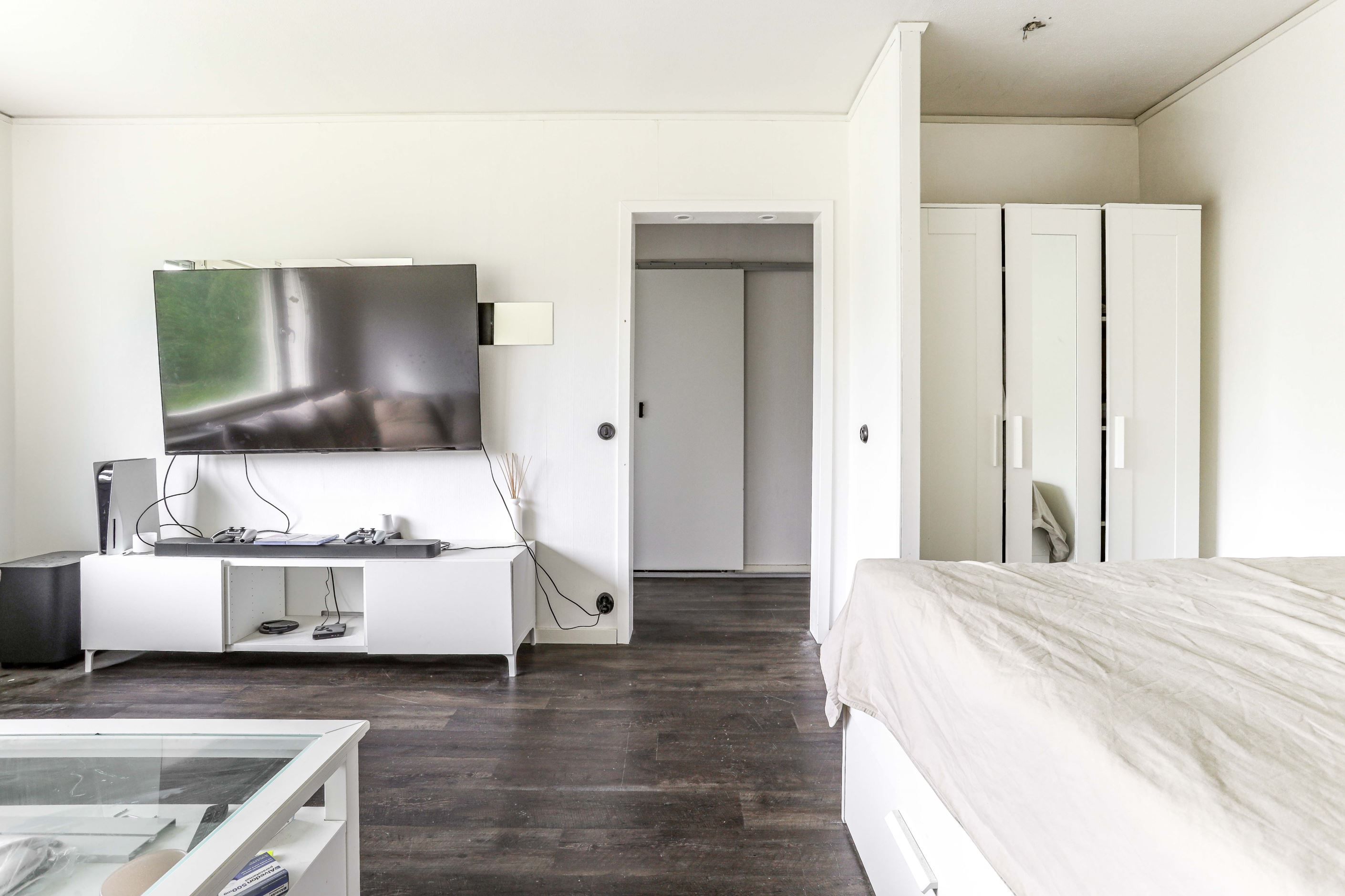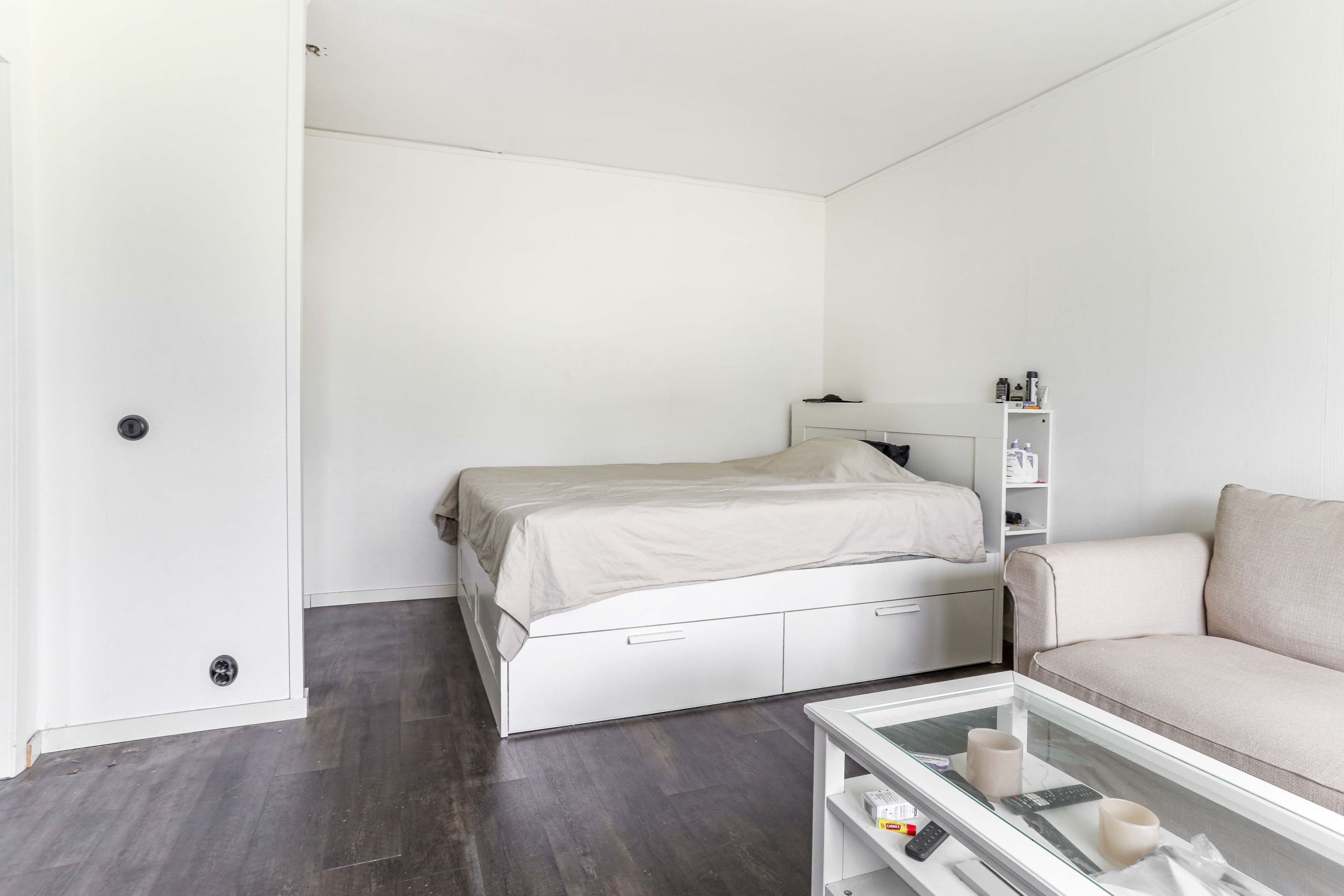 Allrummet är luftigt och lätt att möblera, med plats för en generös soffgrupp samt en mer avskild del för en bredare säng. Två stora fönster ger ett rikt ljusflöde som förstärker känslan av rymd och bidrar till bostadens lugna och harmoniska atmosfär.
