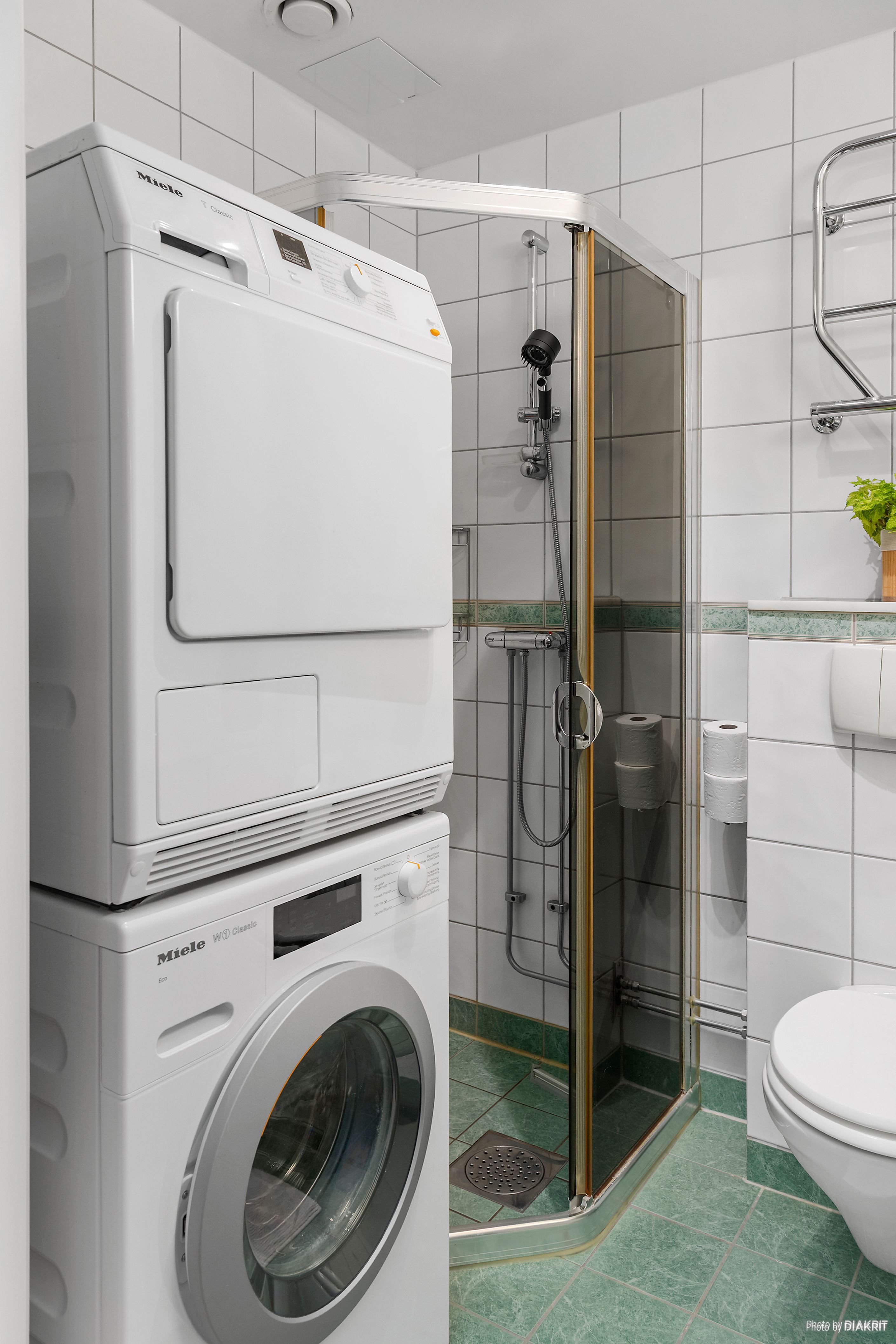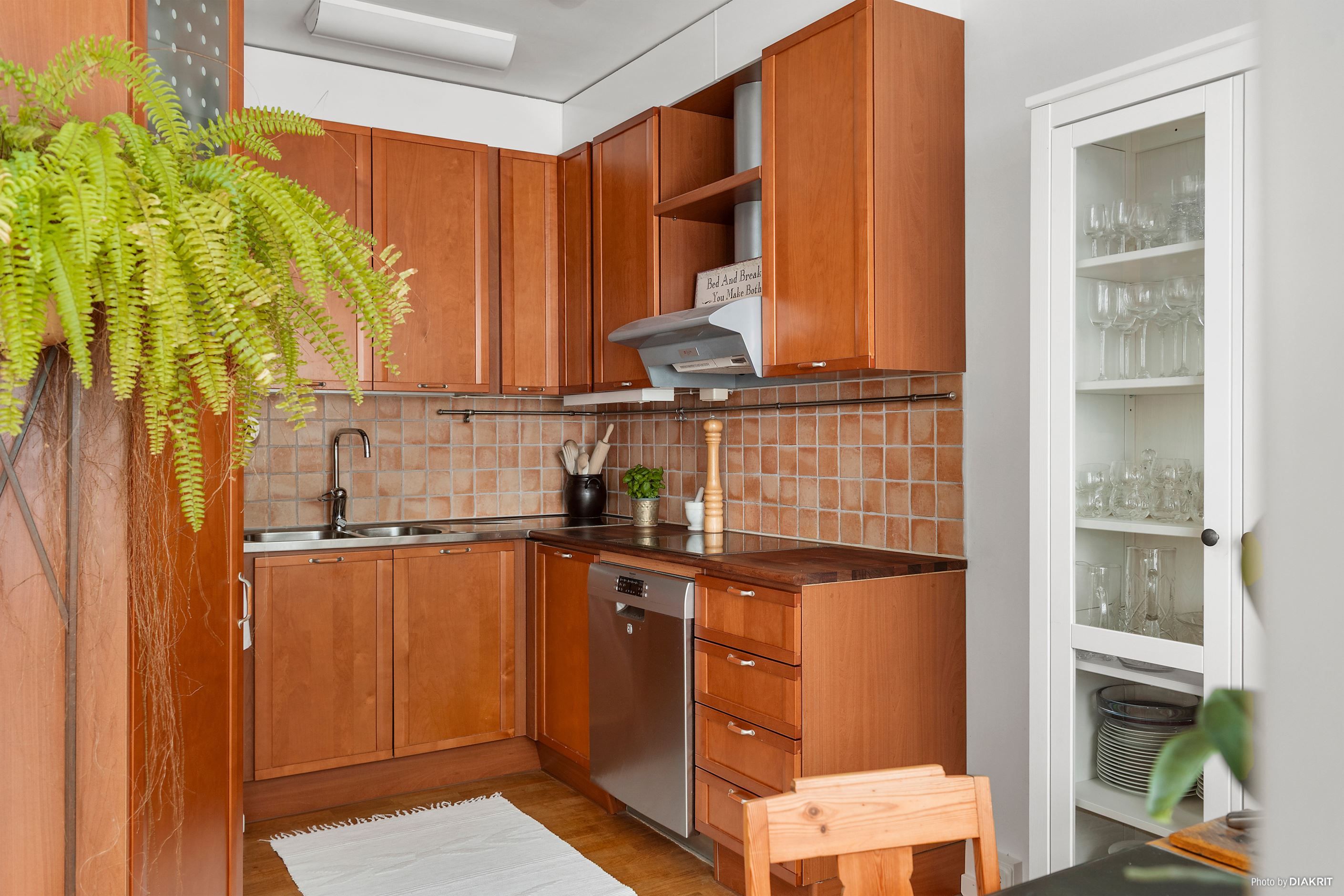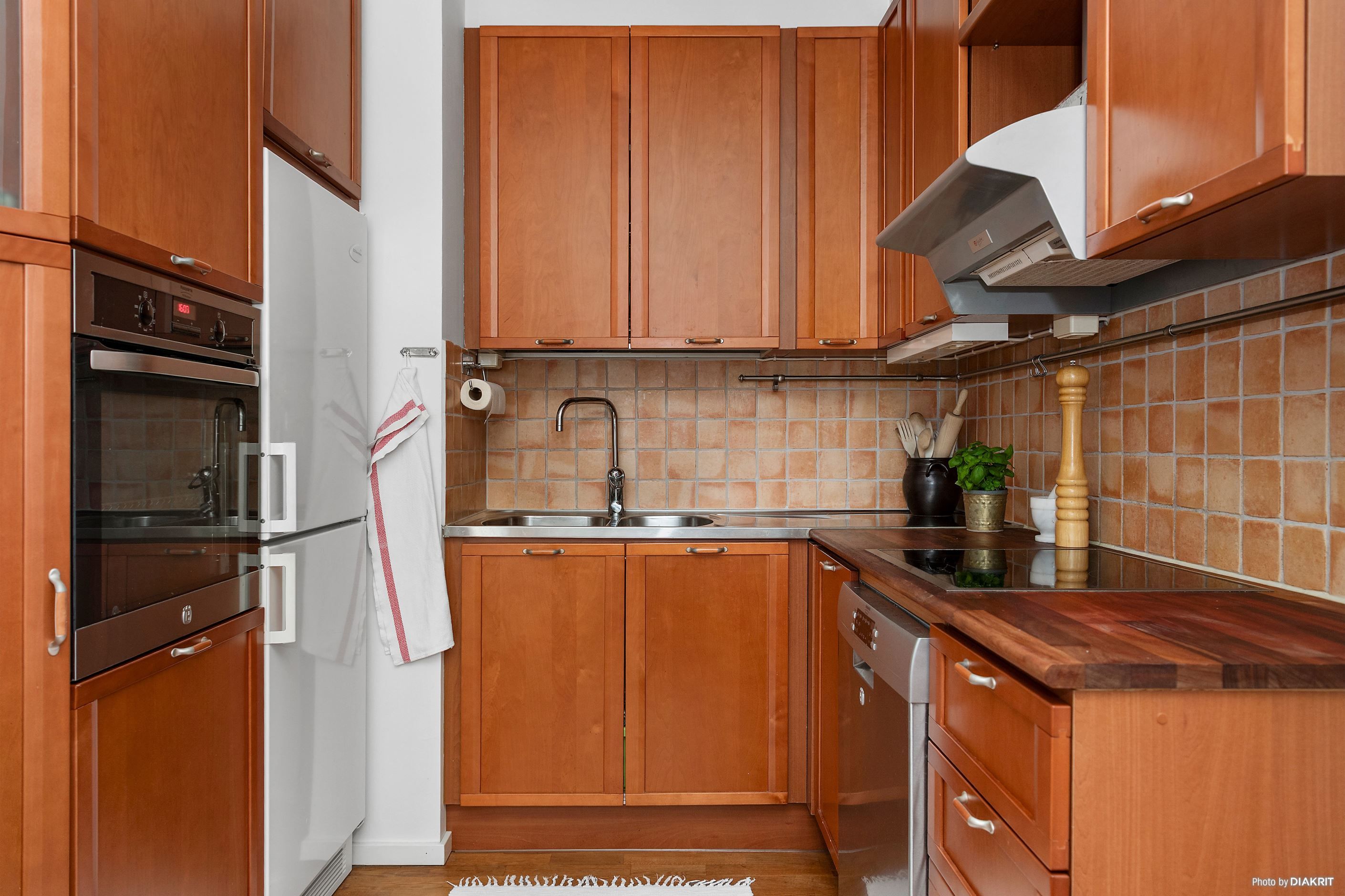 Det rustika köket är generöst tilltaget och bjuder på goda arbetsytor, rikligt med förvaring och fullt utrustad maskinpark – här blir matlagningen lika inspirerande som smidig. Det helkaklade badrummet är både elegant och praktiskt, med dusch och egen tvättmaskin och torktumlare som gör vardagen bekväm.