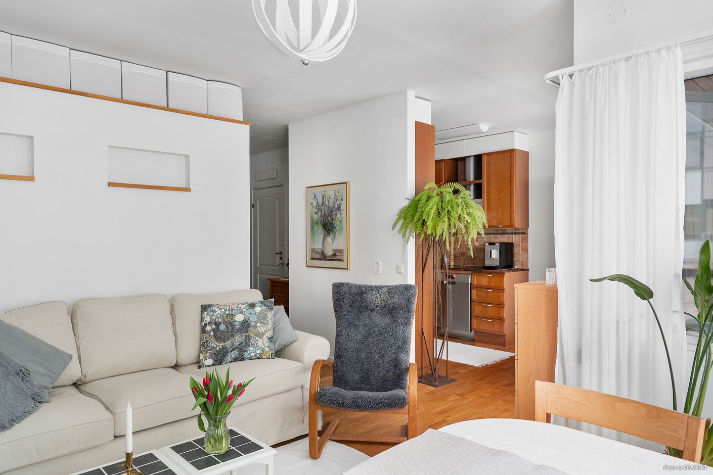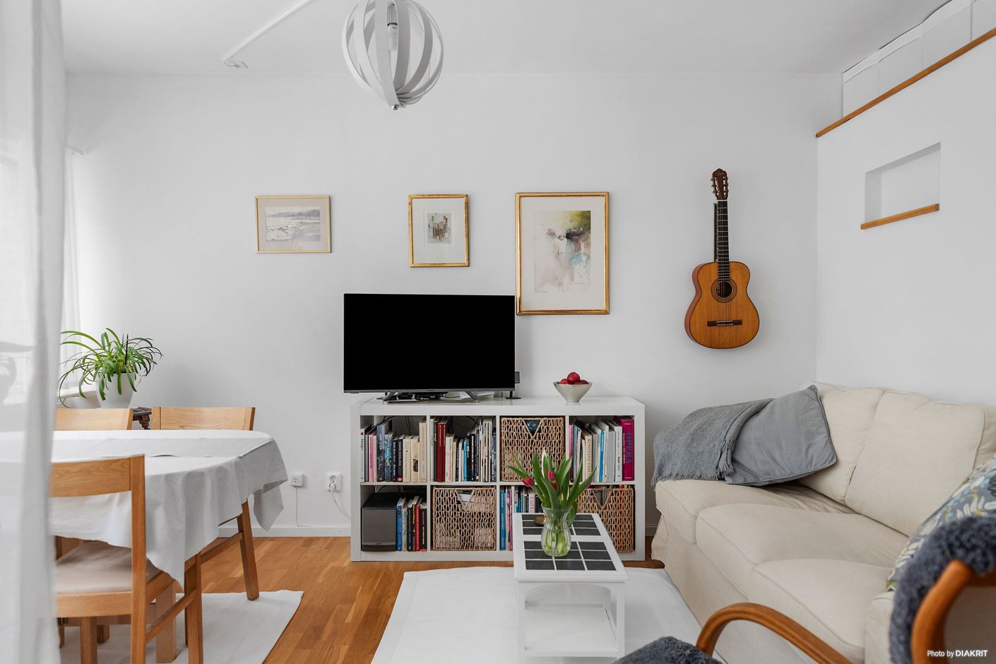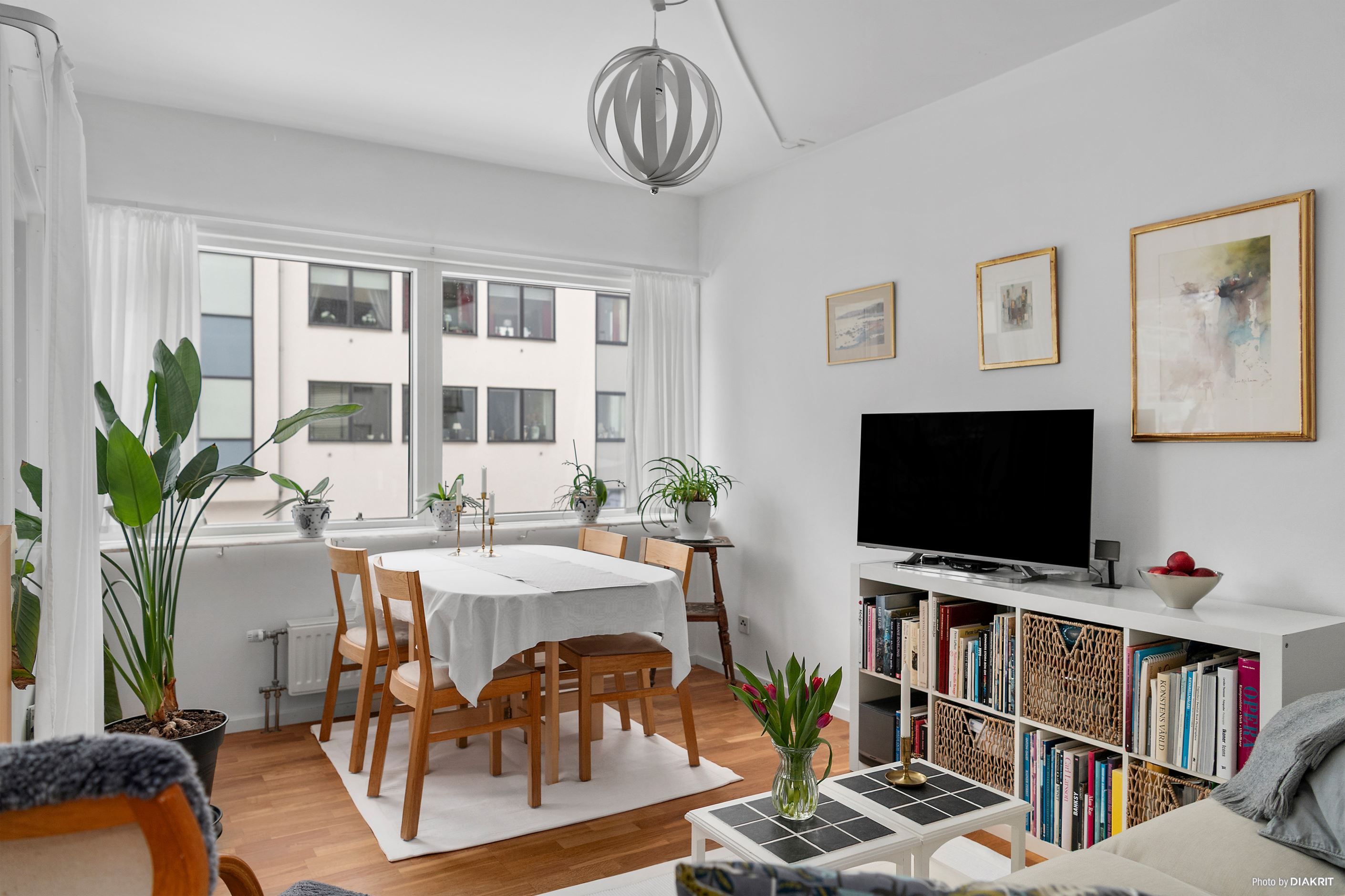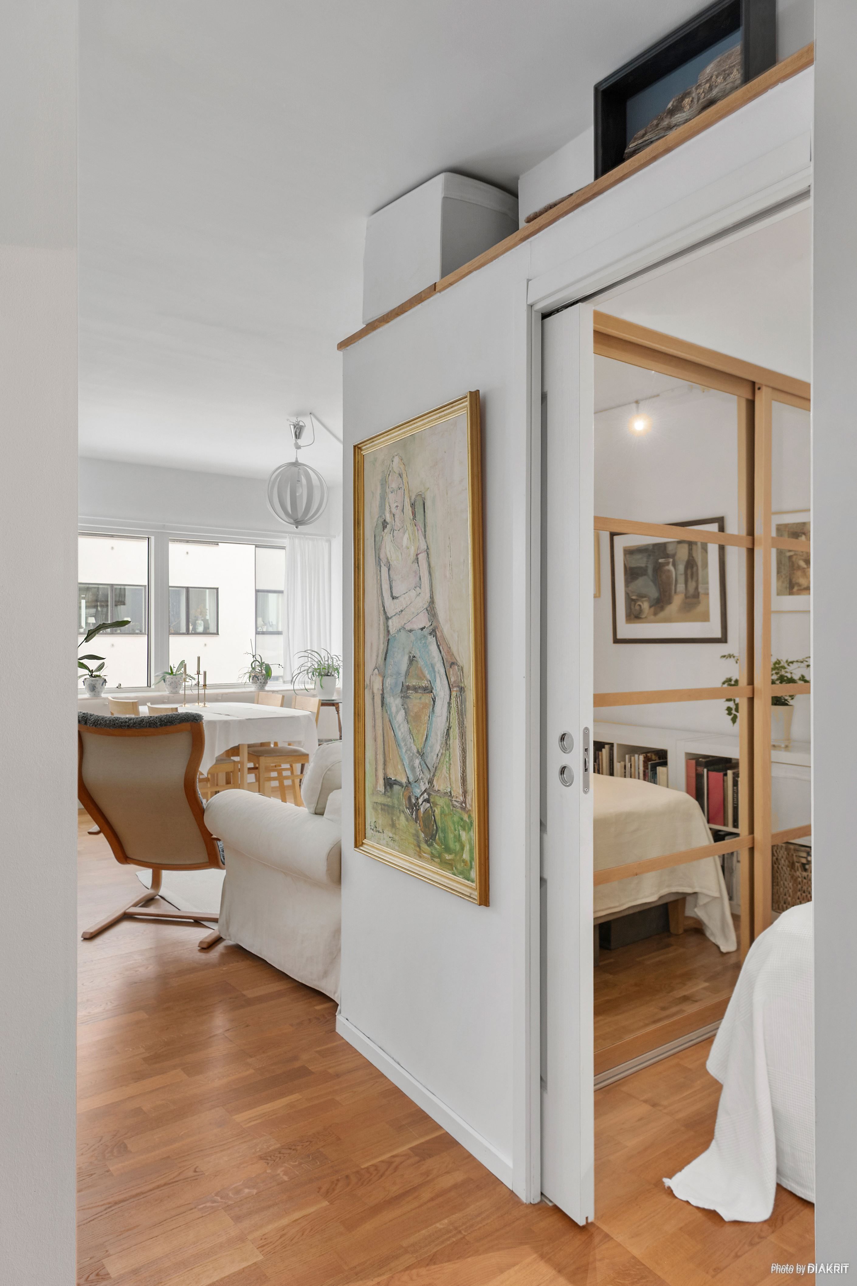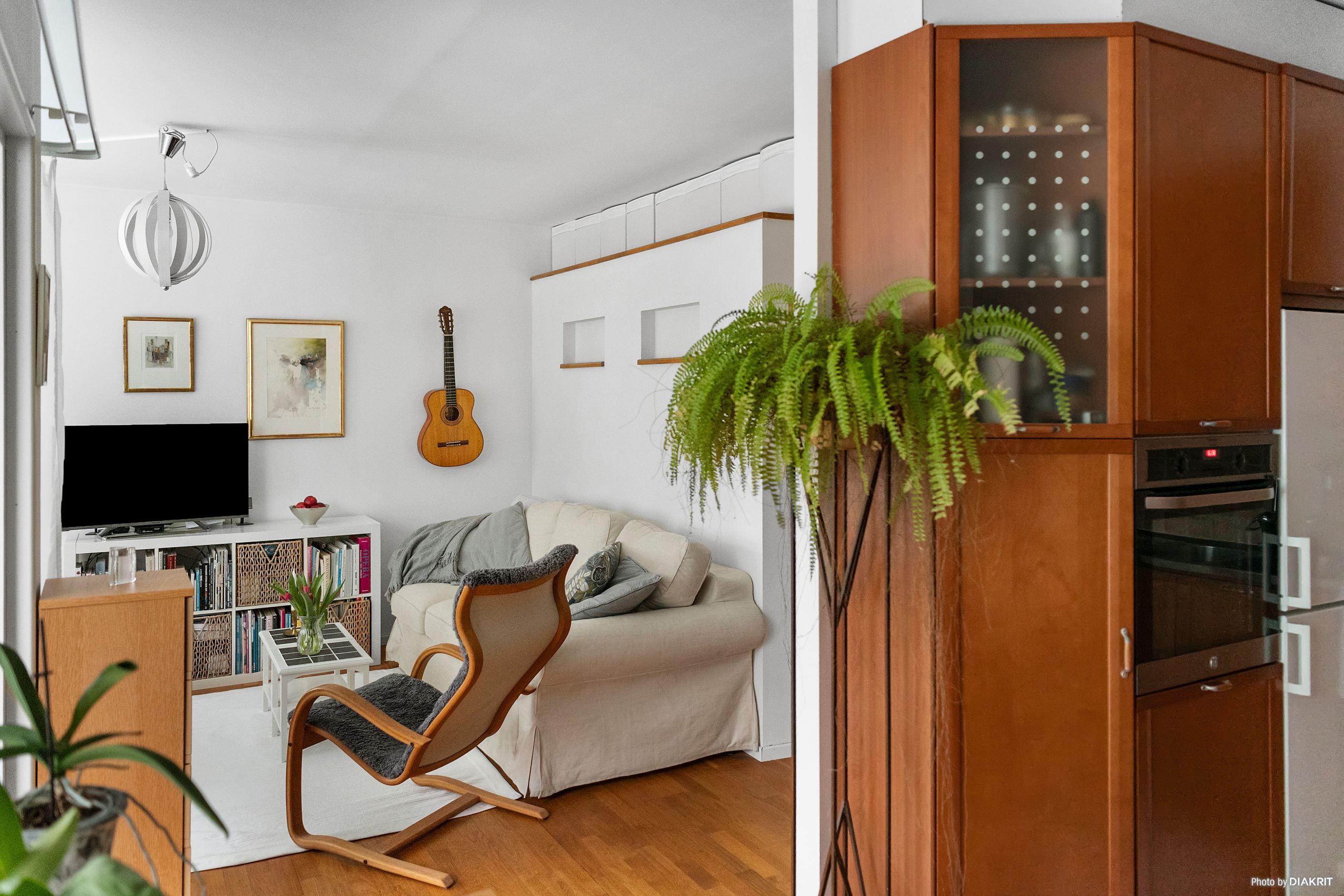 Med stor omsorg har ett avskilt sovrum skapats med integrerade förvaringslösningar, vilket ger de sociala ytorna mellan kök och vardagsrum ett naturligt och öppet flöde. Här möts soffgrupp, tv-möbel och matplats i en harmonisk helhet – perfekt för såväl middagar med vänner som avkopplande kvällar hemma.