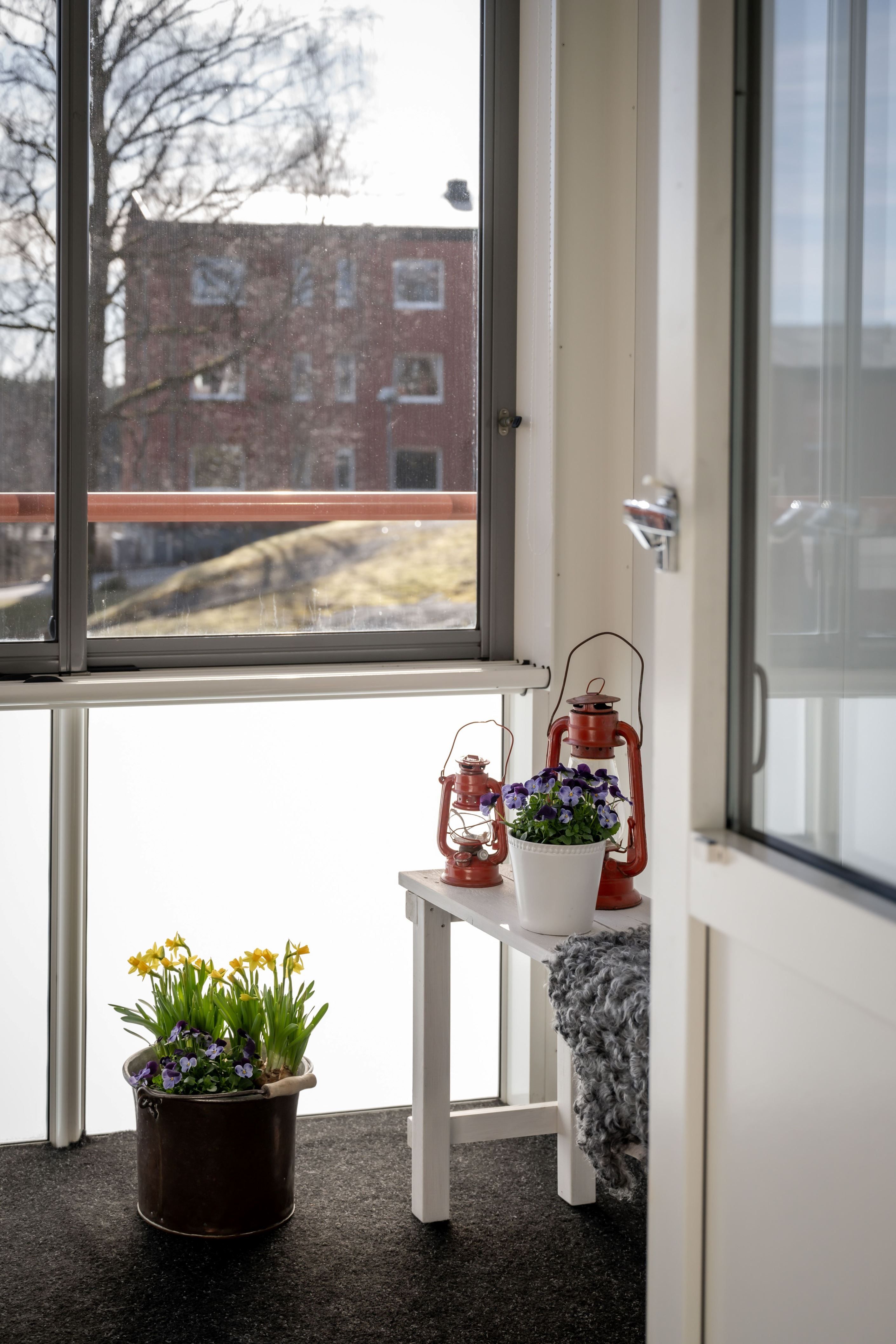 Balkongen är verkligen något extra – stor, inglasad och placerad i sydvästligt läge för optimalt solljus från förmiddag fram till tidig kväll. Härifrån har man överblick över innergården, perfekt när barnen är ute och leker!