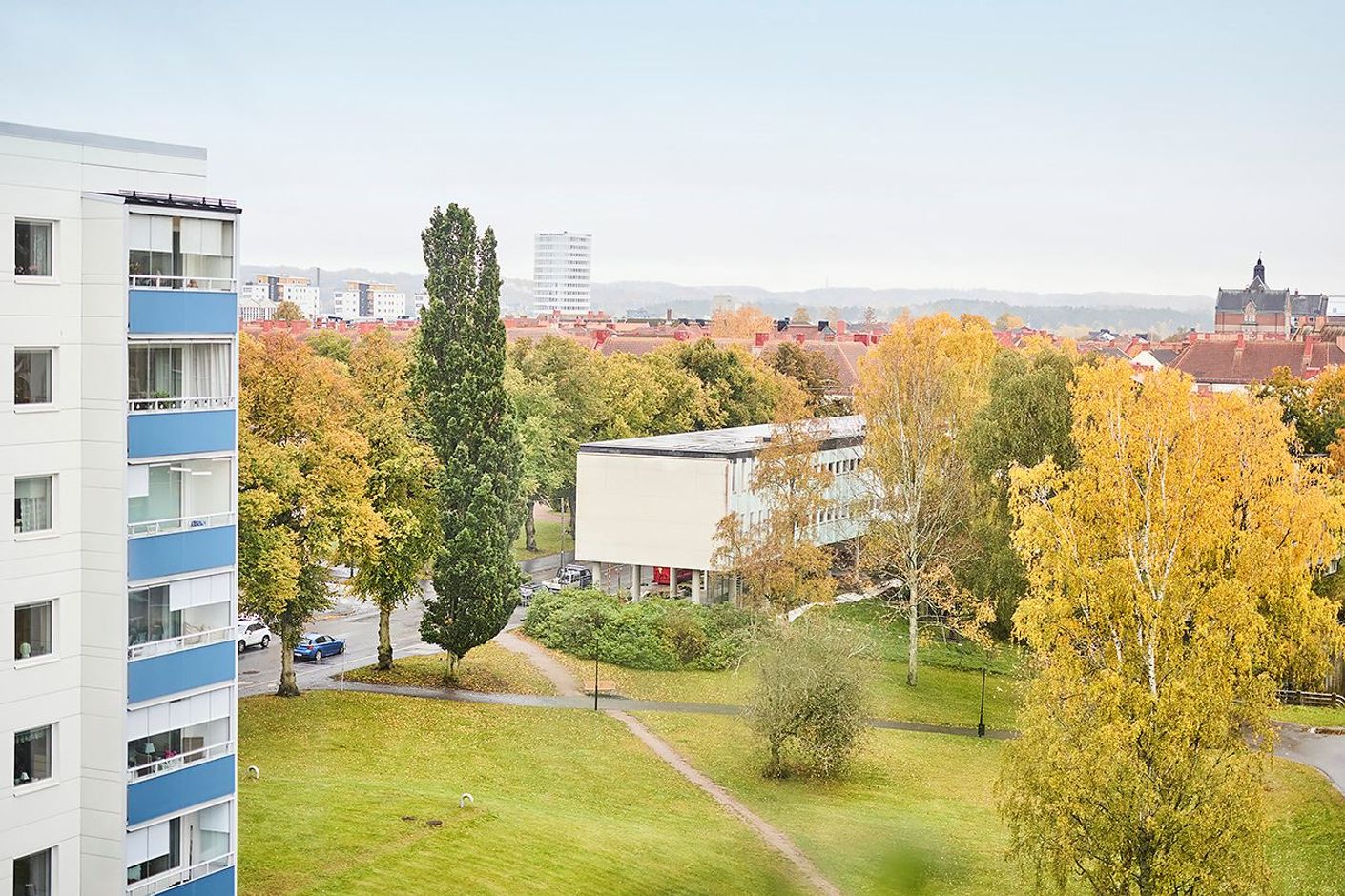 Högst upp på åttonde våningen erbjuder denna bostad en magisk utsikt över grönska, i både syd- och västläge.