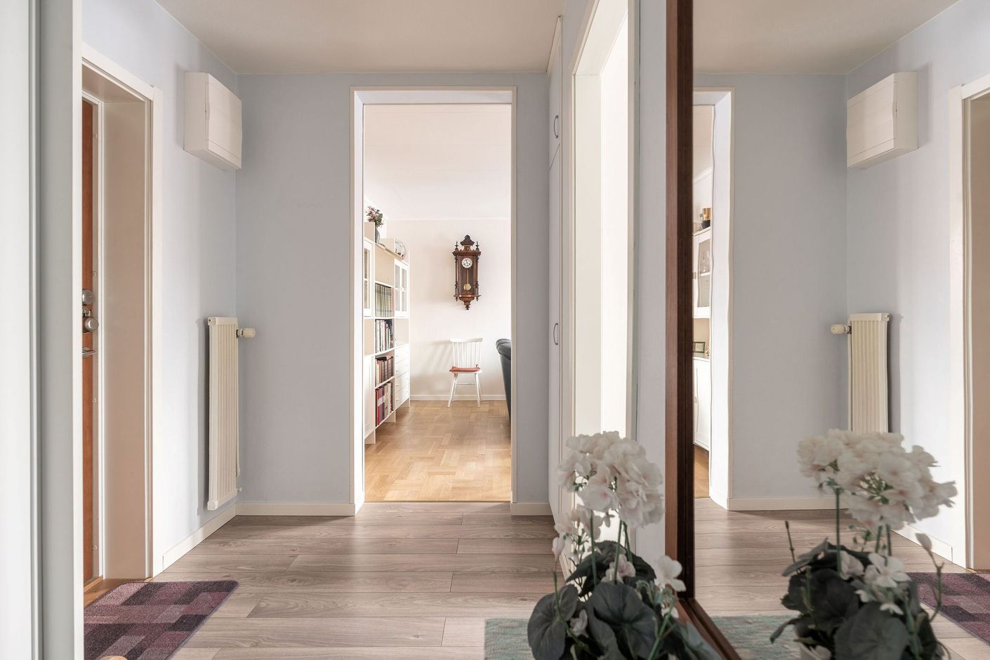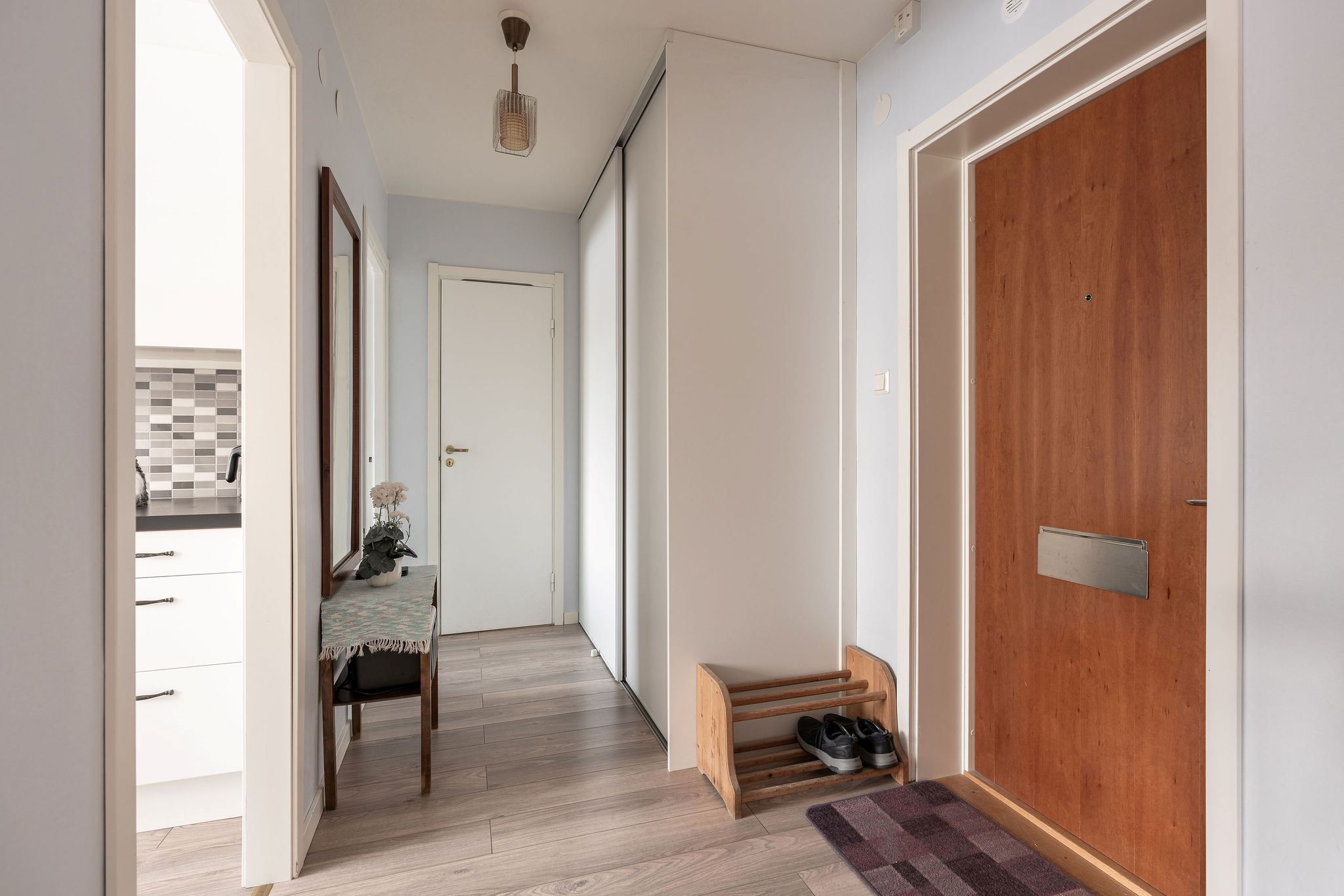 Hallen har en praktisk skjutdörrsgarderob som erbjuder generösa förvaringsmöjligheter.