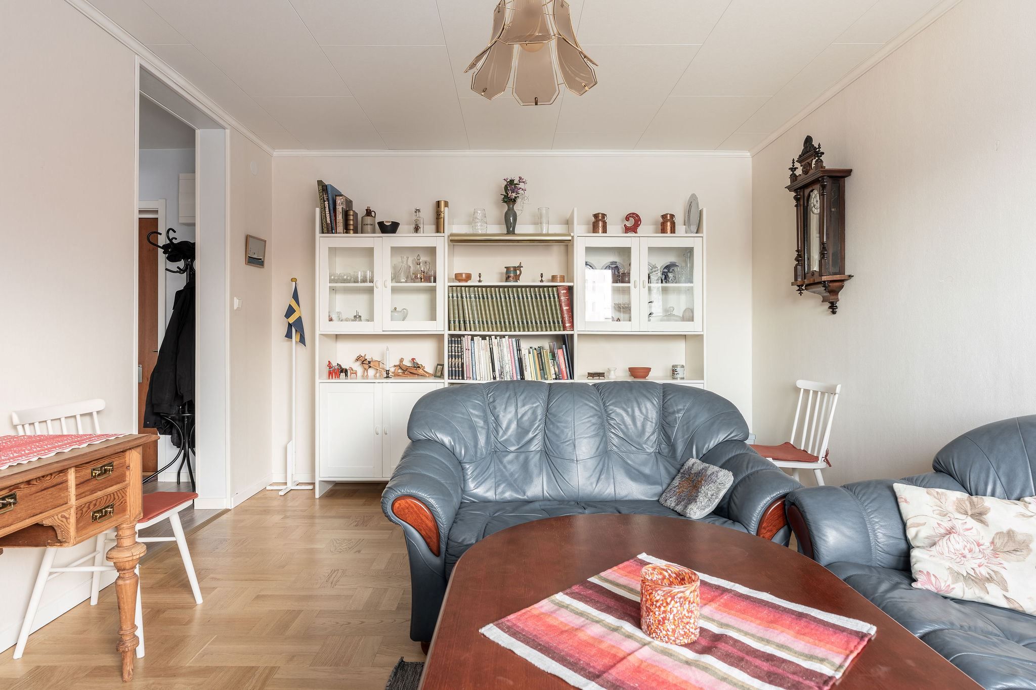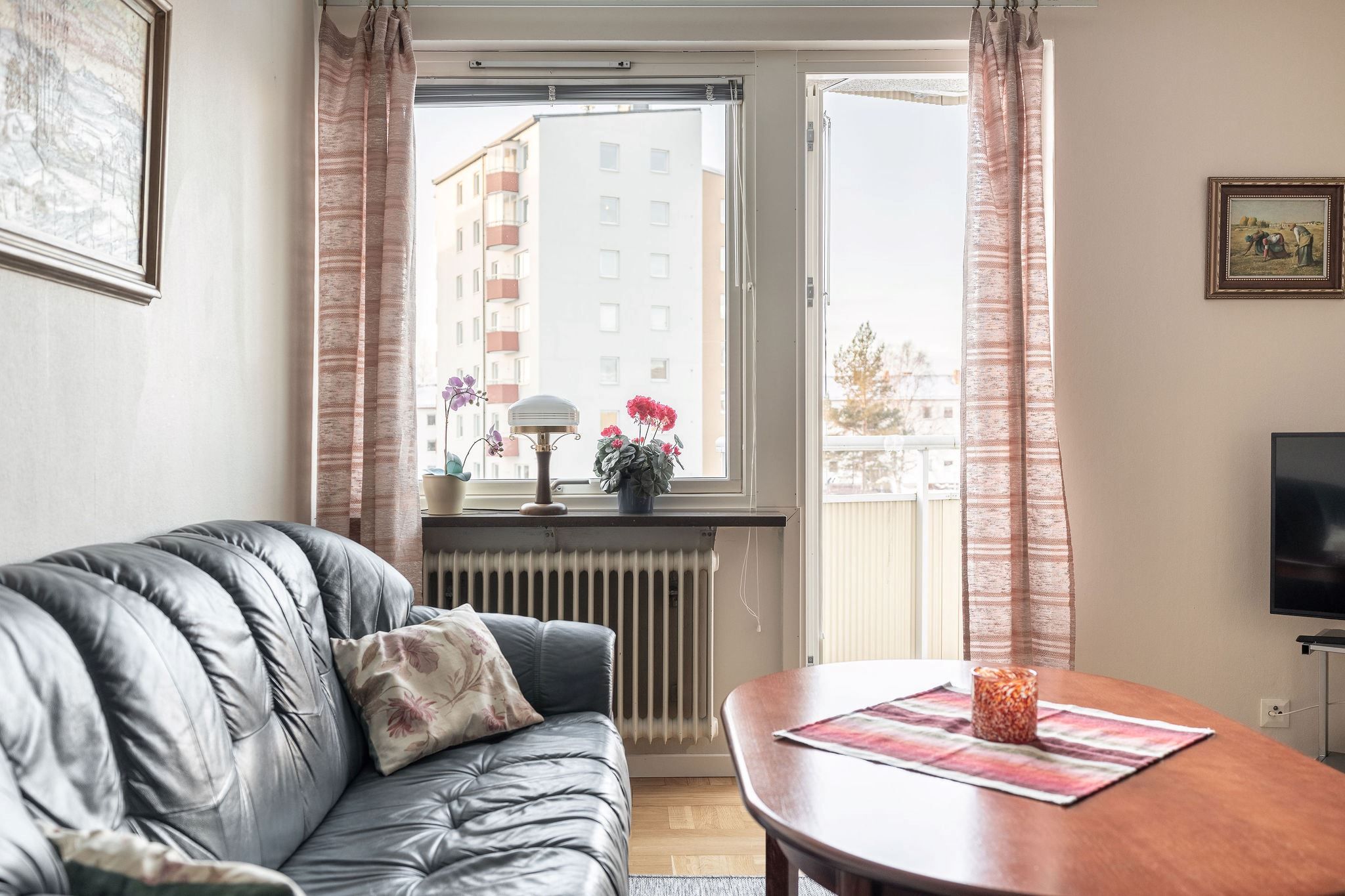 Det rymliga vardagsrummet med parkettgolv leder ut till en balkong med utsikt över den lummiga innergården – en fridfull plats för avkoppling.
