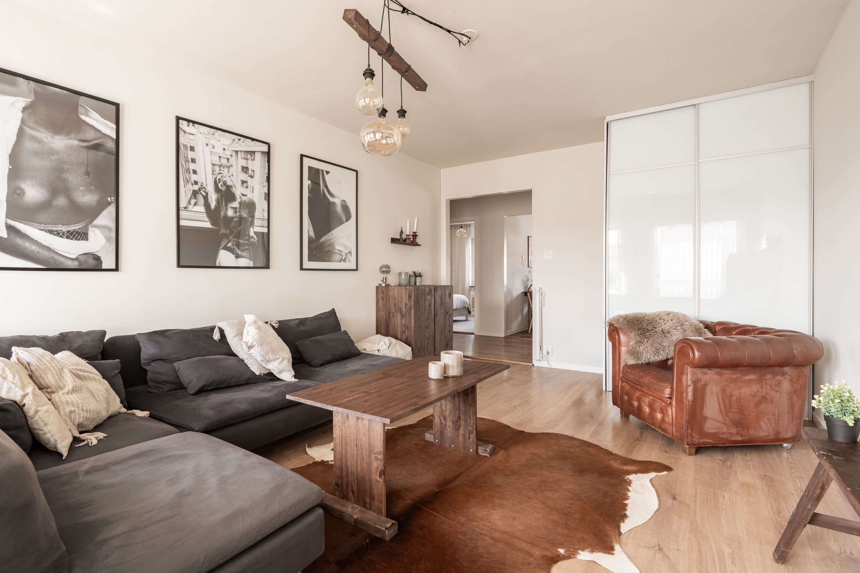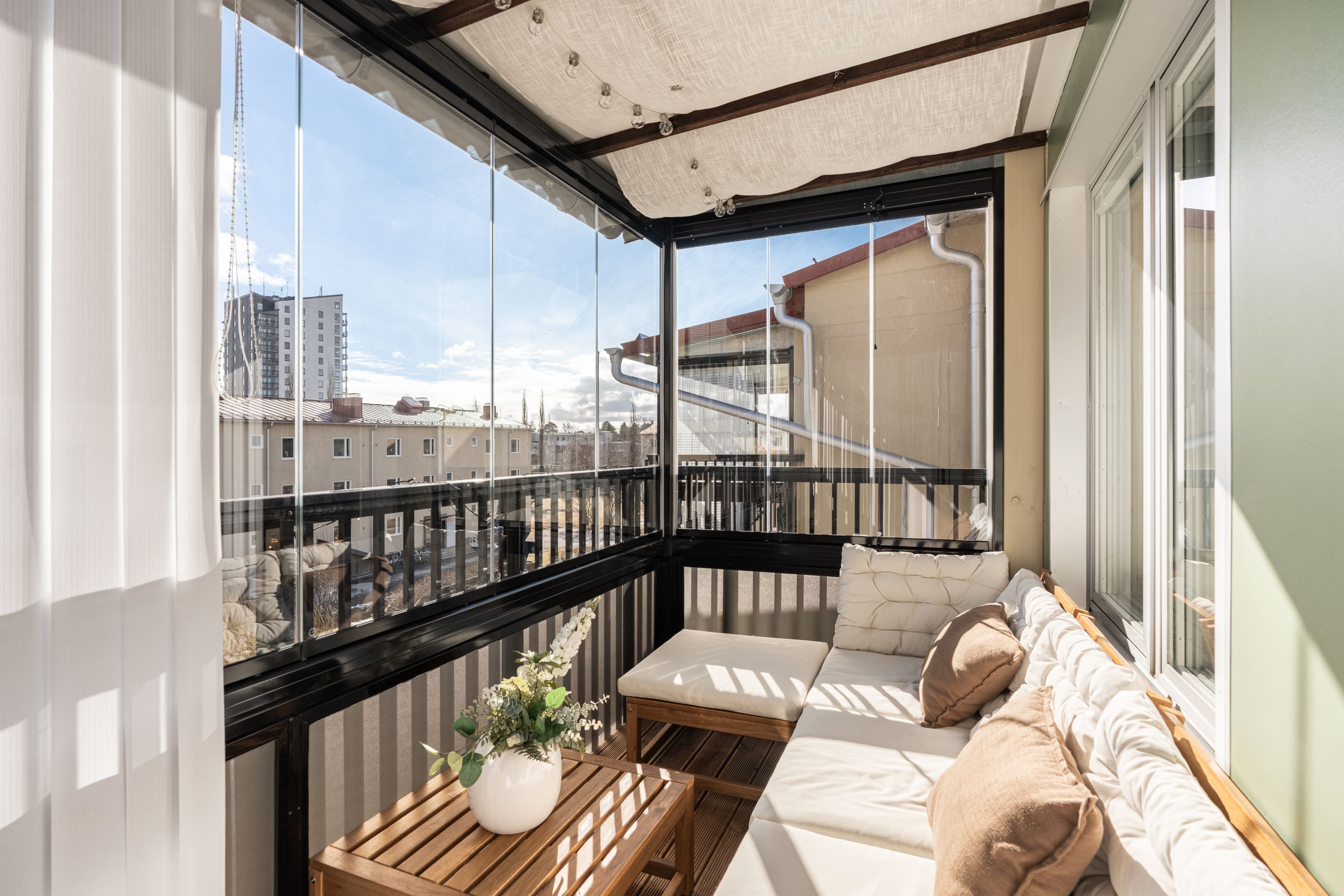 Vardagsrummet är en naturlig samlingsplats och härifrån kliver du ut på den stora inglasade balkongen i ett riktigt bra solläge. En plats som snabbt blir en favorit, oavsett om det är morgonkaffe eller långa sommarkvällar.
