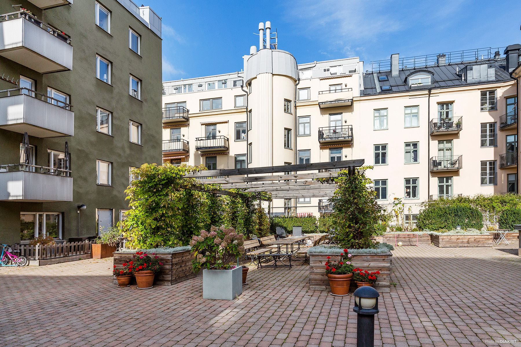 Med centralt, unikt läge på lugn innergård ligger denna trivsamma 3,5:a i etage. Lägenheten har en härlig balkong i högt, ljust västerläge och är mycket trevligt disponerad med generösa sällskapsytor, kök och gäst-wc på nedre plan samt sovrum och badrum på övre plan. Hela bostaden är i genomgående mycket bra skick.