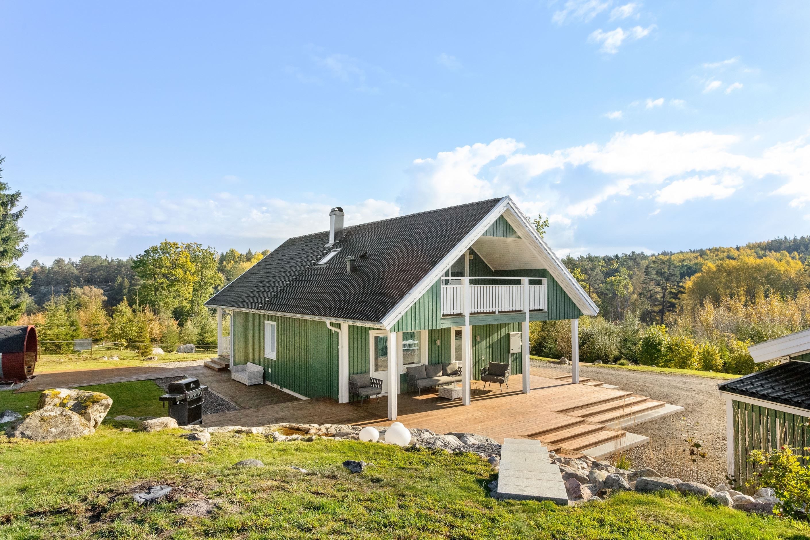 Bostadshuset från 2016 har renoverats med känsla och omsorg. Här ryms tre sovrum, ett ljust vardagsrum med braskamin, samt balkonger och soliga terrasser på båda sidor av huset – perfekt för både morgonkaffet och kvällshänget. Det nya köket är en dröm för matlagningsälskaren, med påkostade materialval och en öppen planlösning som bjuder in till socialt umgänge.