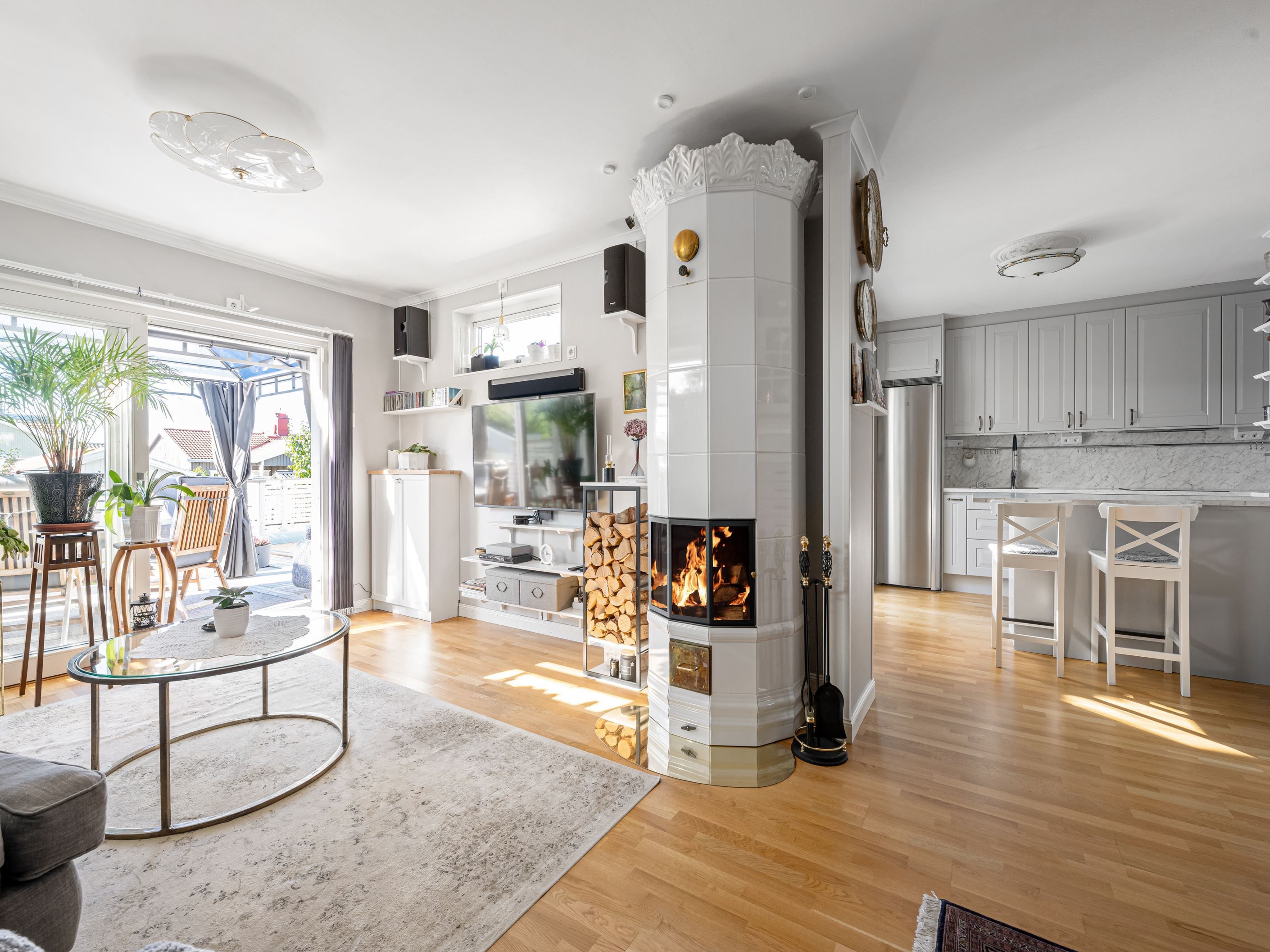 Här möts du av en ljus och inbjudande atmosfär med genomgående ekparkettgolv och vackra detaljer. I det stora vardagsrummet finns en mysig kakelugn och gott om plats för både matplats och soffgrupp.