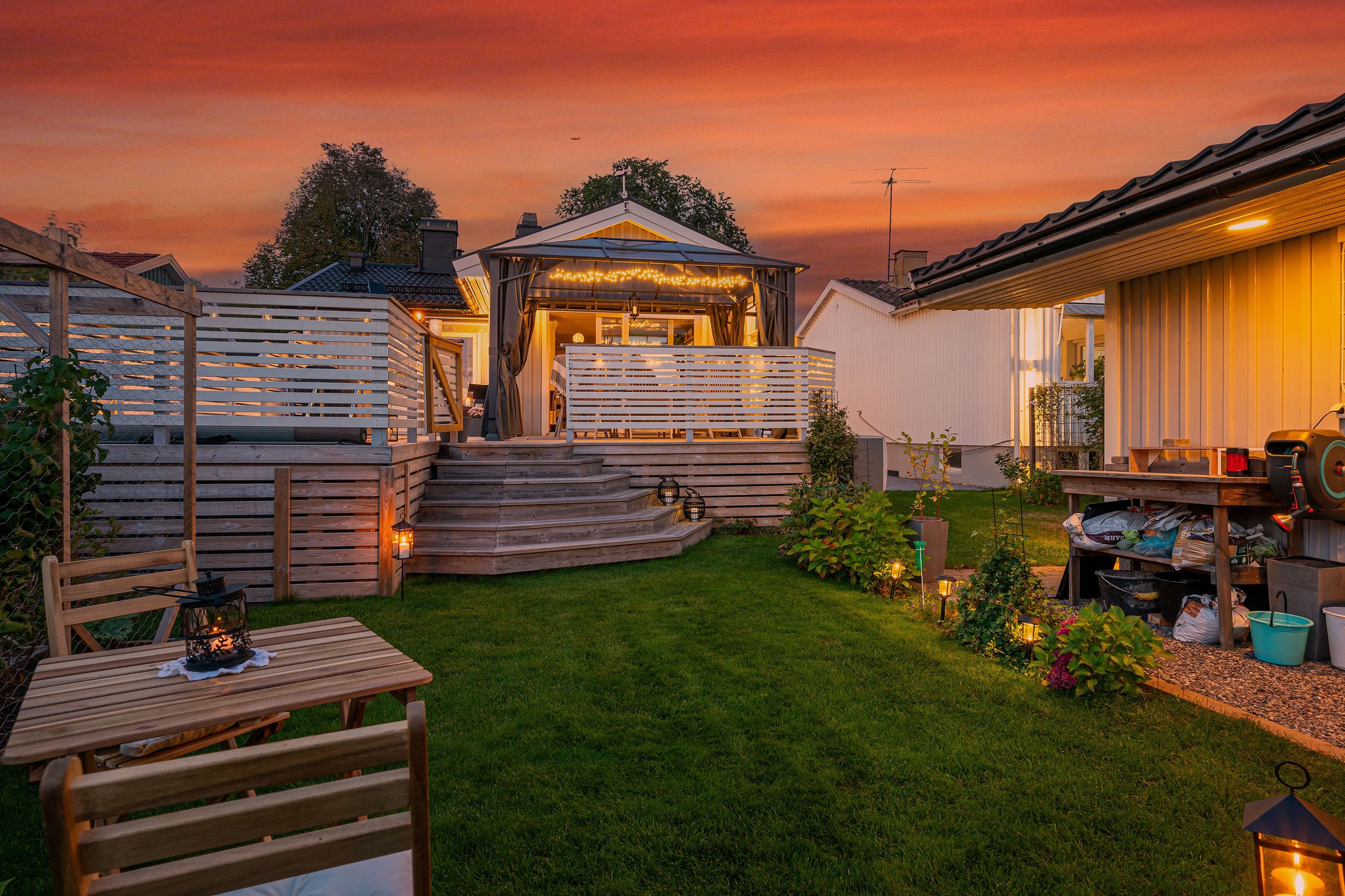 Från vardagsrummet och det moderna köket i öppen planlösning når du den stora altanen som erbjuder stor matplats och pool. Härifrån når du också den grönskande trädgården som erbjuder odlingsmöjligheter och goda förvaringsmöjligheter i en friggebod.