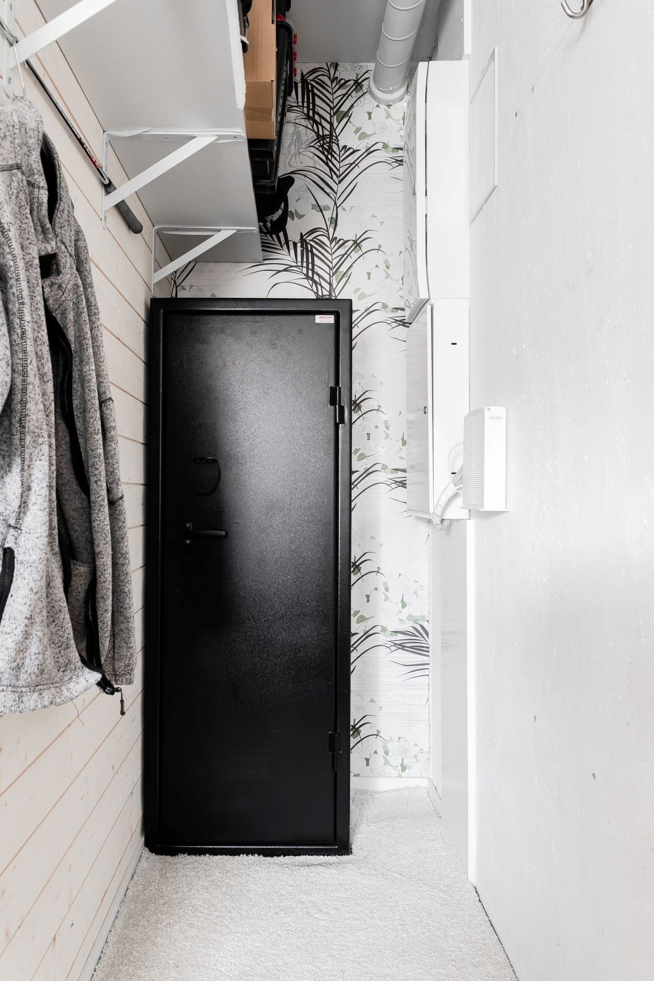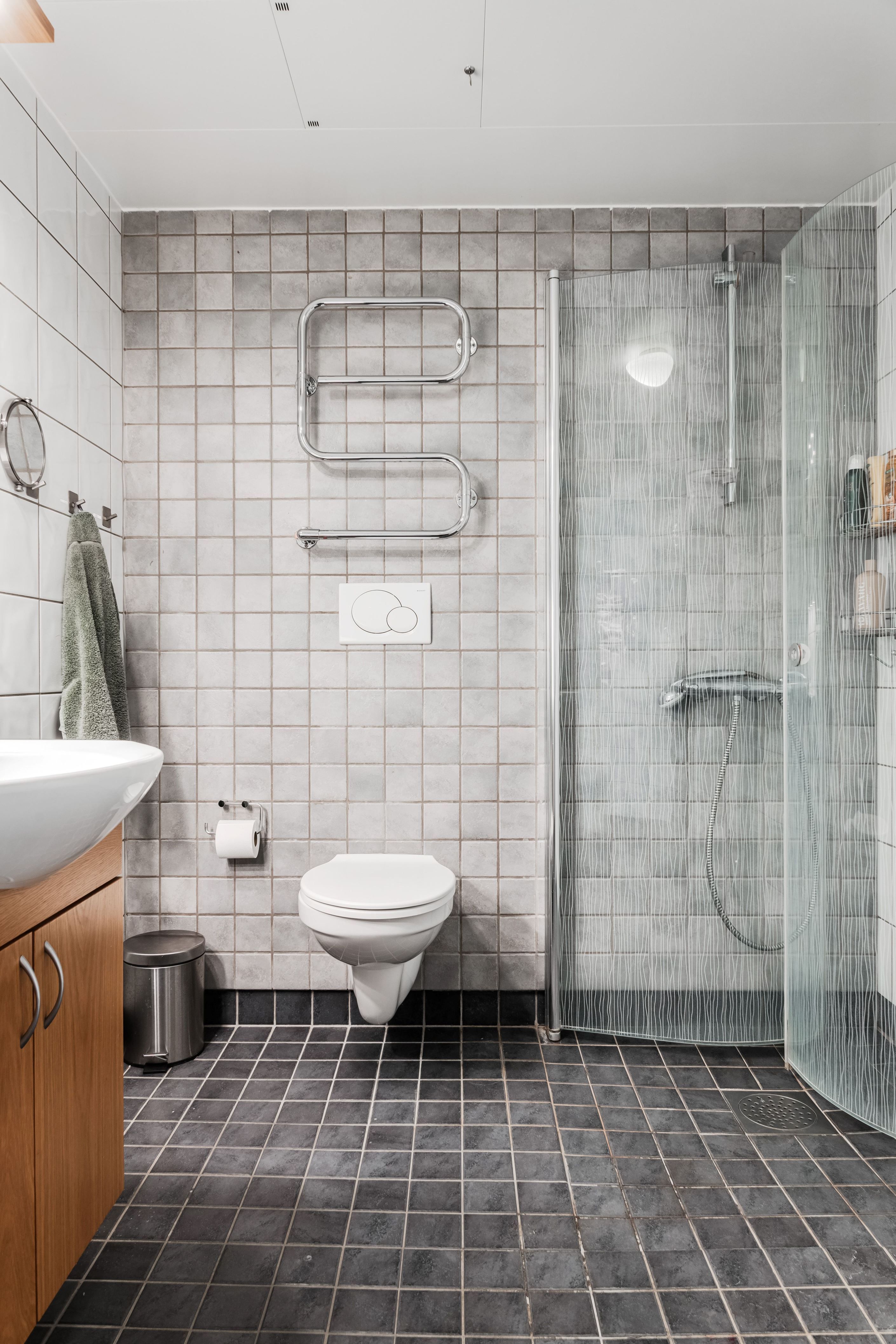 Badrummet är stilrent och utrustat med kakel, klinkergolv, golvvärme samt tvättmaskin och torktumlare. I den möblerbara hallen finns avhängningsmöjligheter och även plats för en garderob för den som önskar.