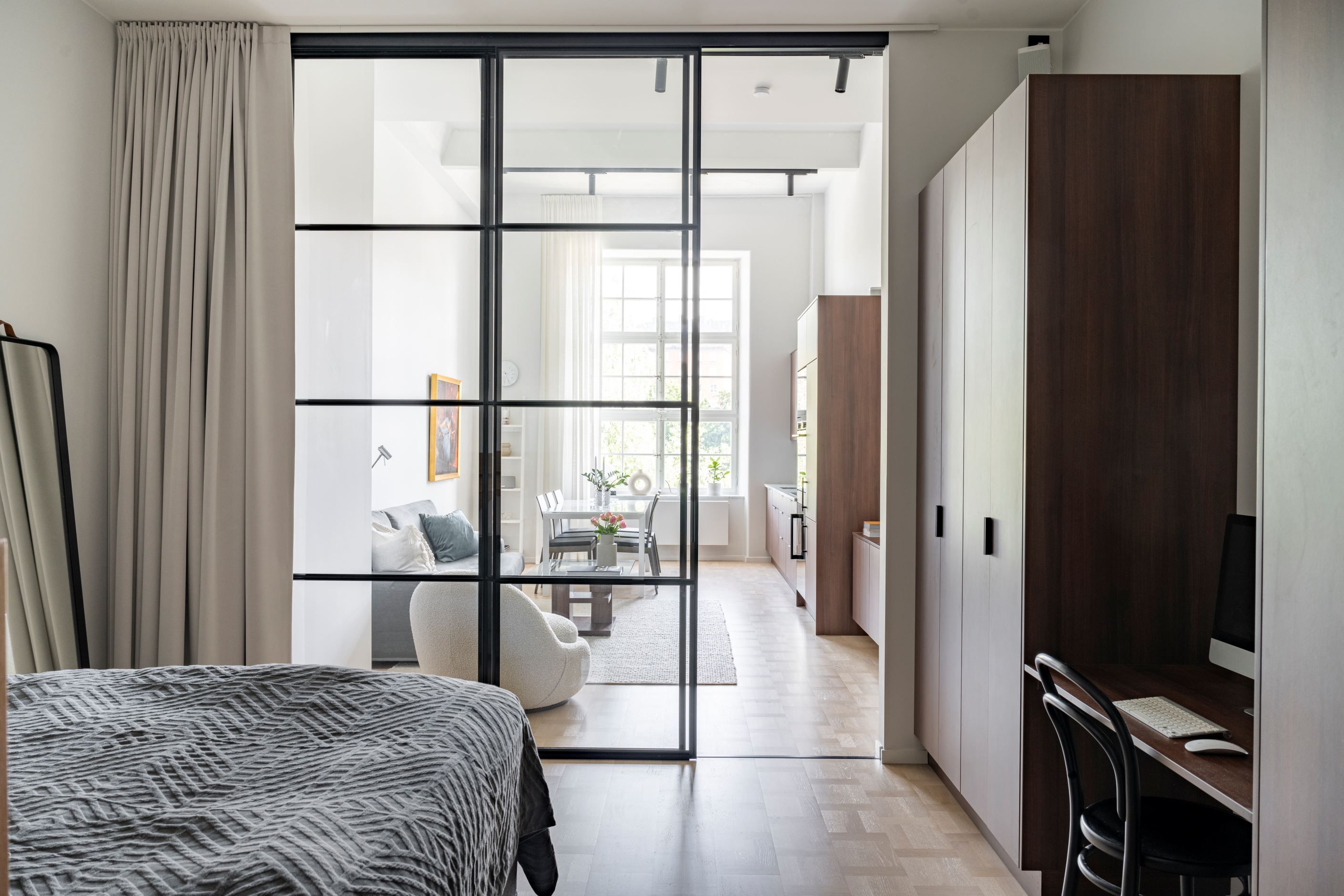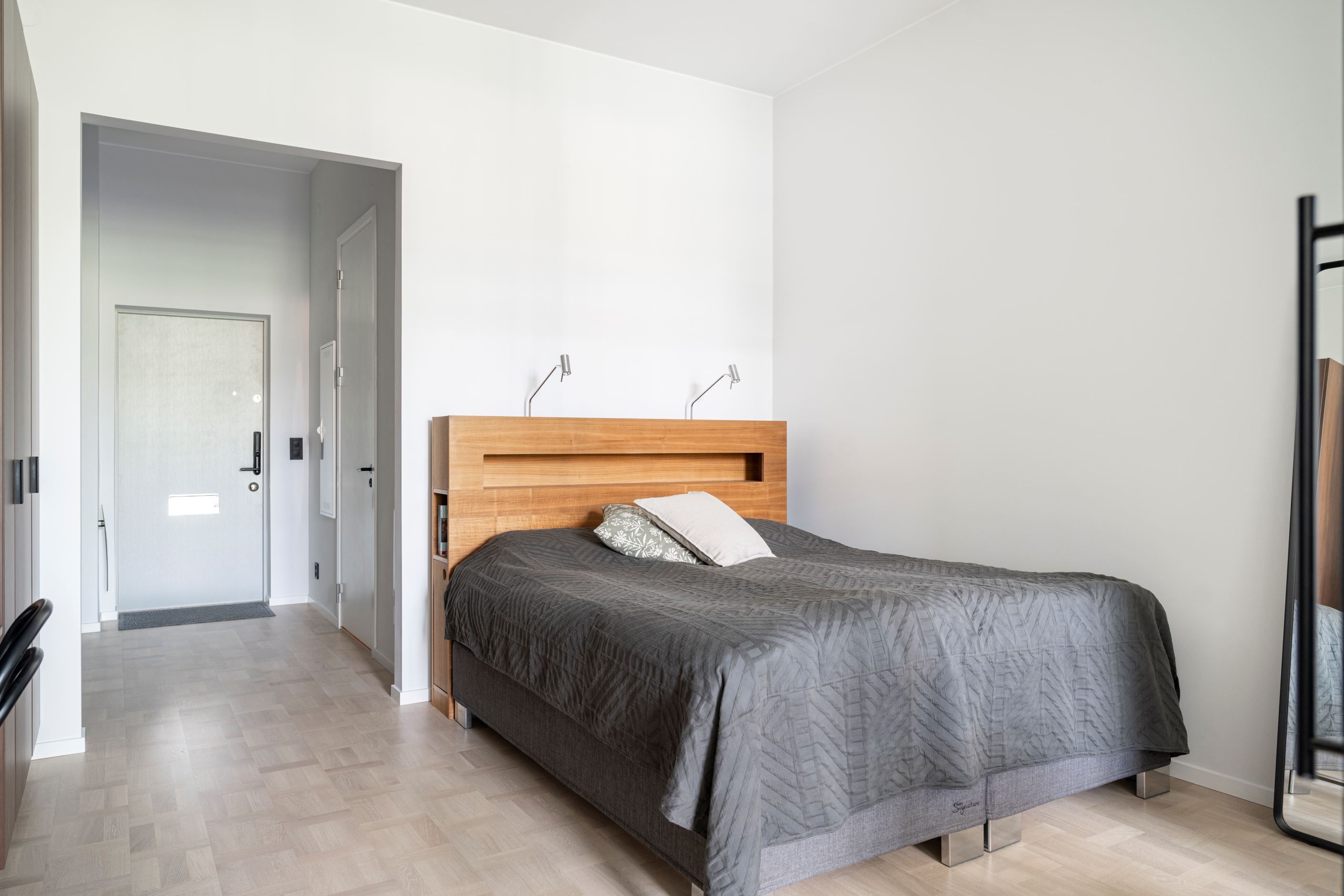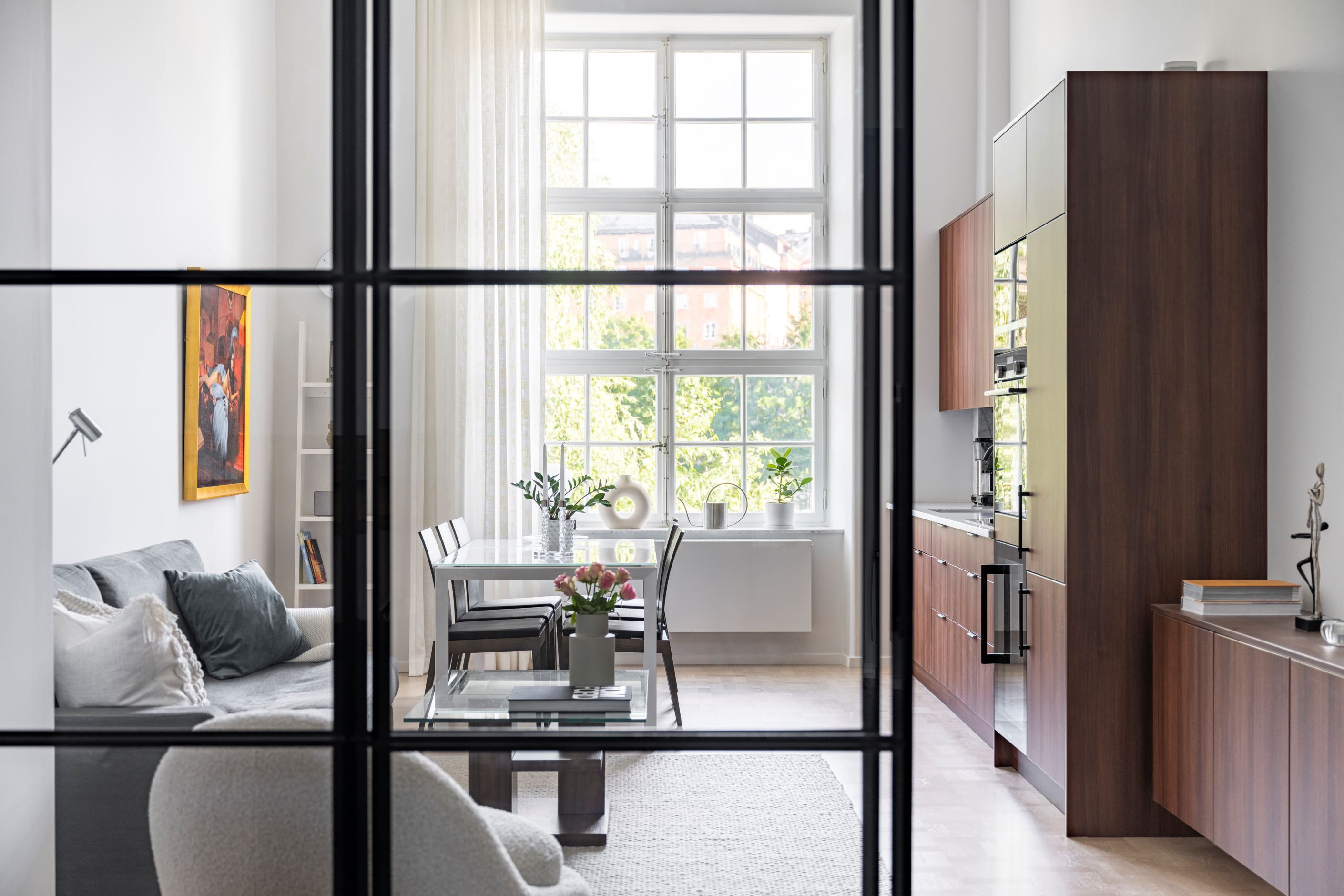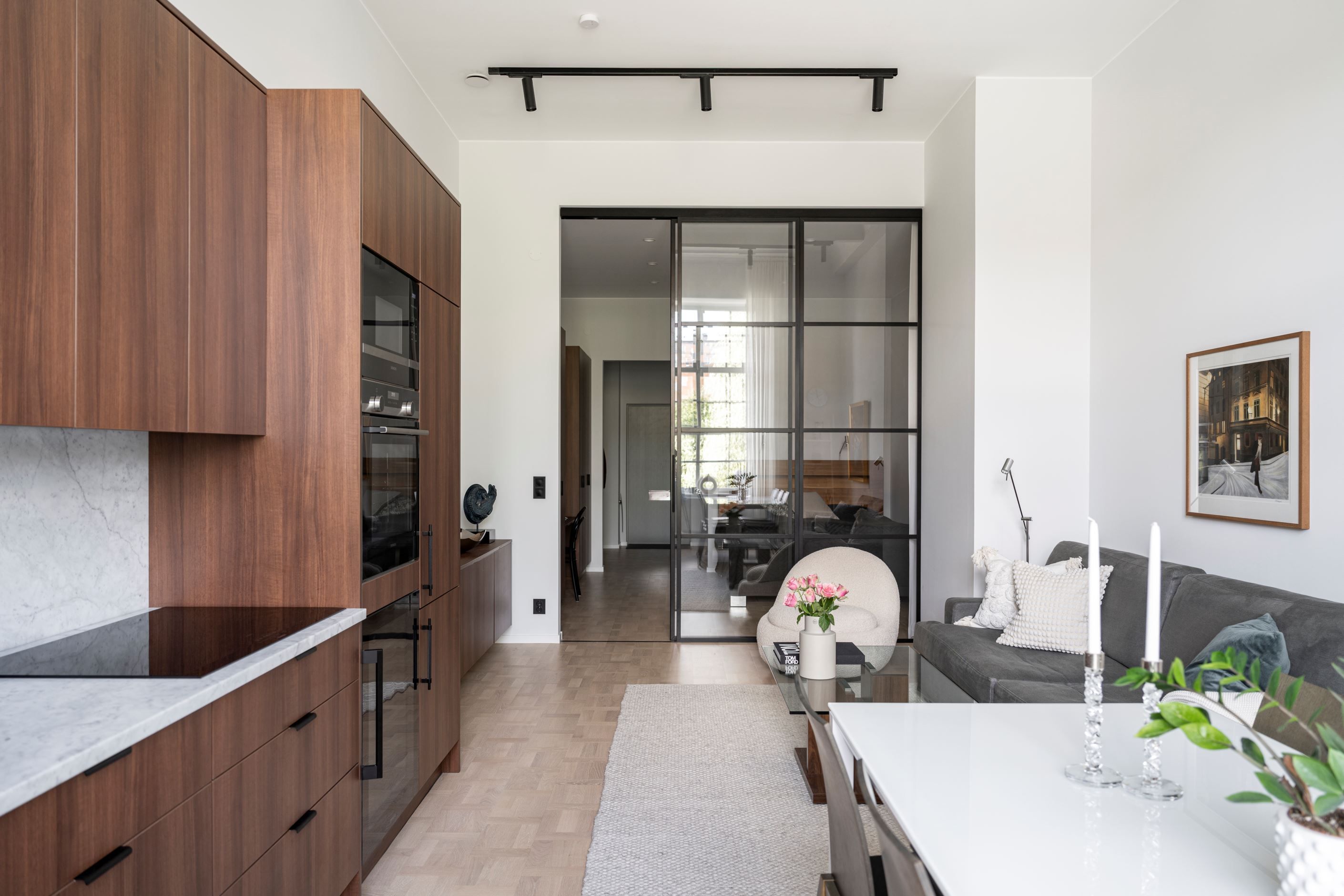 Planlösningen är väldisponerad med generöst med sociala ytor men även en privat sovdel och gott om förvaring. Köket är platsbyggt av Sjöö Fabriksbolag i Solna. Bänkskivan är i sten med nedsänkt diskho och skåpluckor i valnöt. Badrummet har en lyxig hotellkänsla med granitkeramik på både golv och väggar. I duschen finns en unidrain och duschdörrarna går att vika i två steg vilket är mycket praktiskt när duschen inte används. På golvet i resten av lägenheten ligger stavparkett i ljust pigmenterad ek och väggarna är målade.