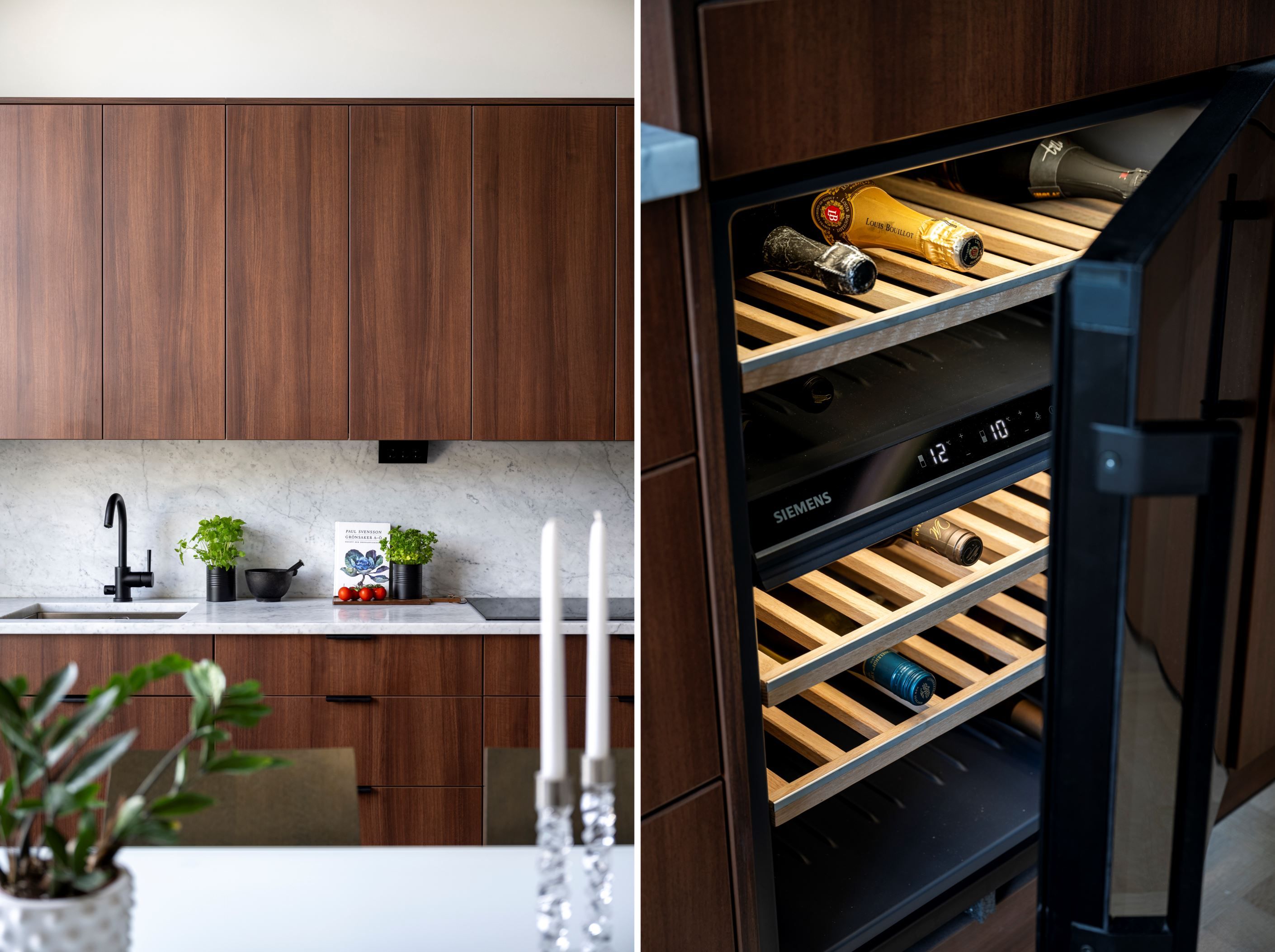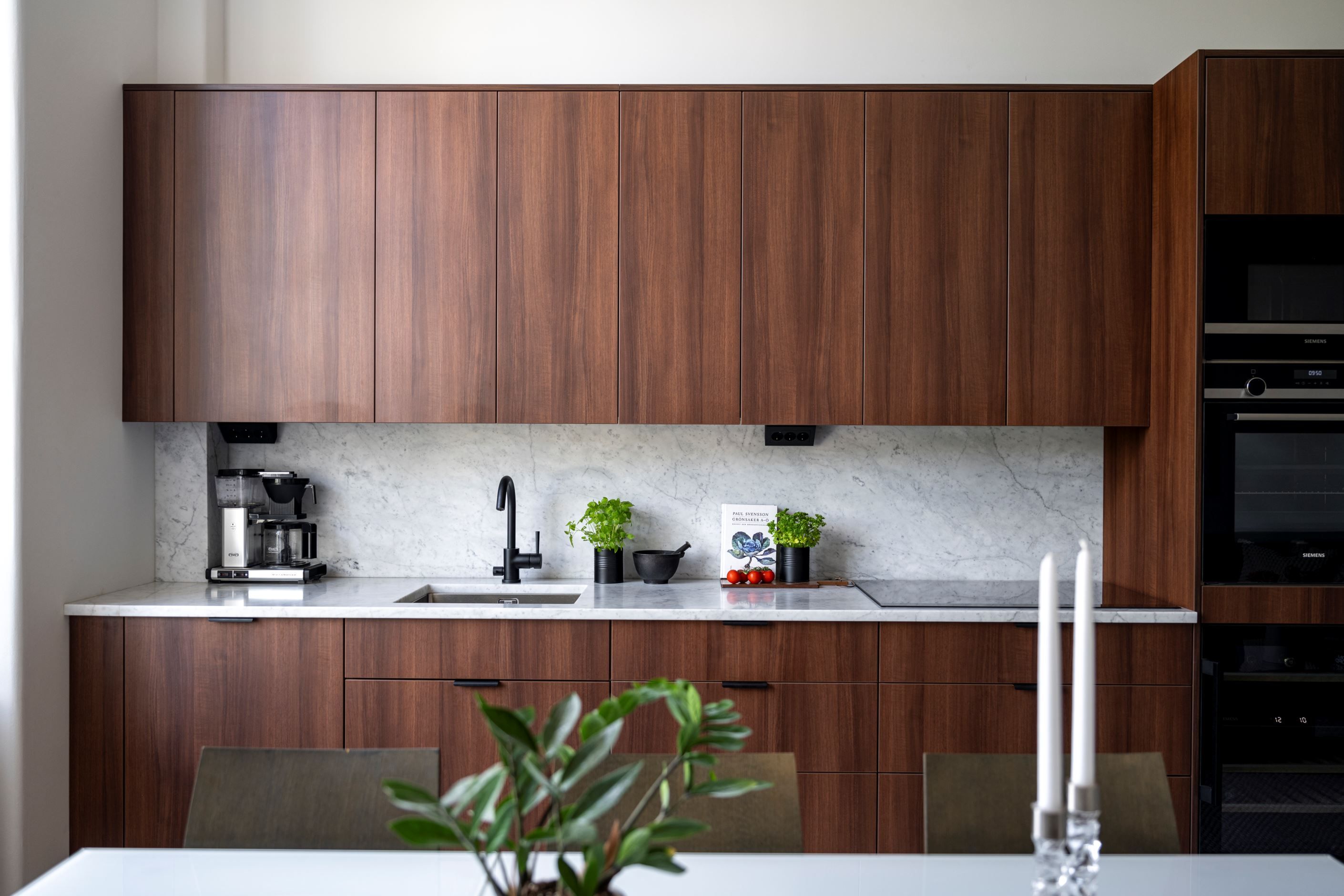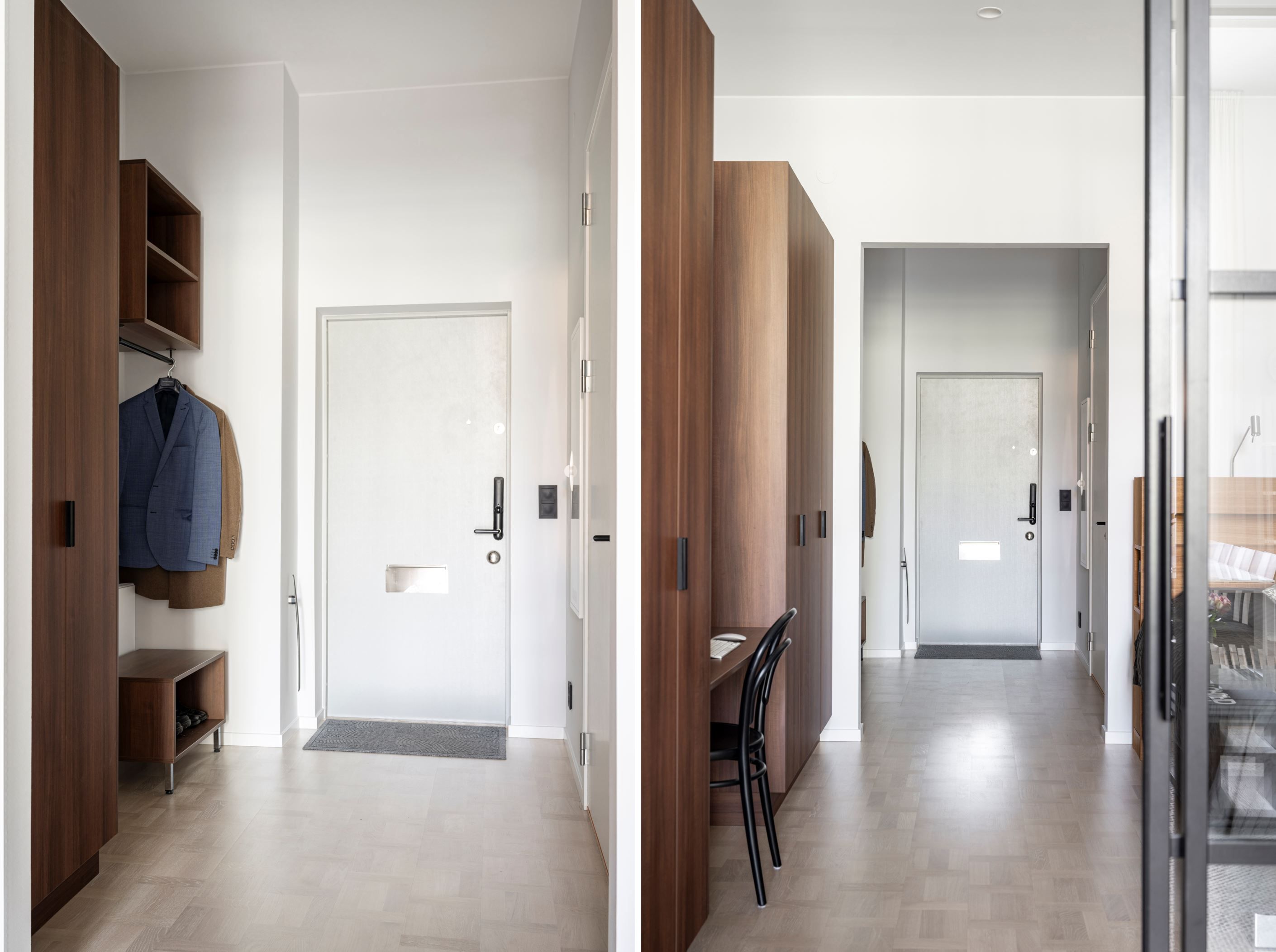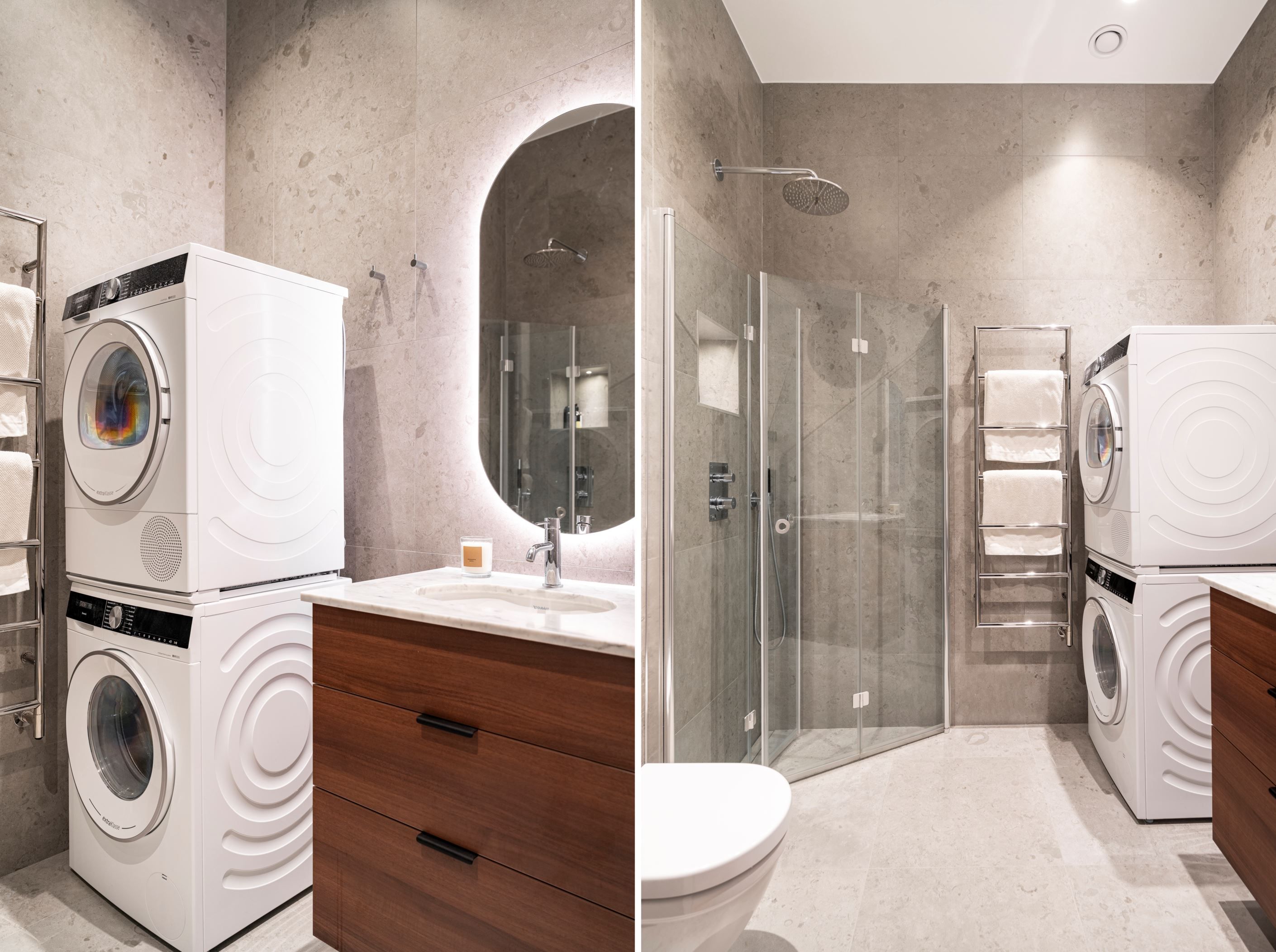 Planlösningen är väldisponerad med generöst med sociala ytor men även en privat sovdel och gott om förvaring. Köket är platsbyggt av Sjöö Fabriksbolag i Solna. Bänkskivan är i sten med nedsänkt diskho och skåpluckor i valnöt. Badrummet har en lyxig hotellkänsla med granitkeramik på både golv och väggar. I duschen finns en unidrain och duschdörrarna går att vika i två steg vilket är mycket praktiskt när duschen inte används. På golvet i resten av lägenheten ligger stavparkett i ljust pigmenterad ek och väggarna är målade.