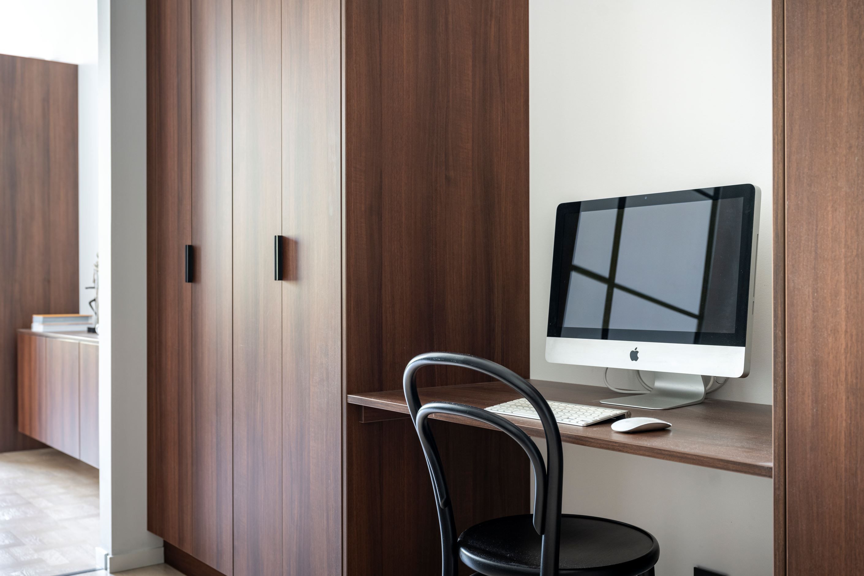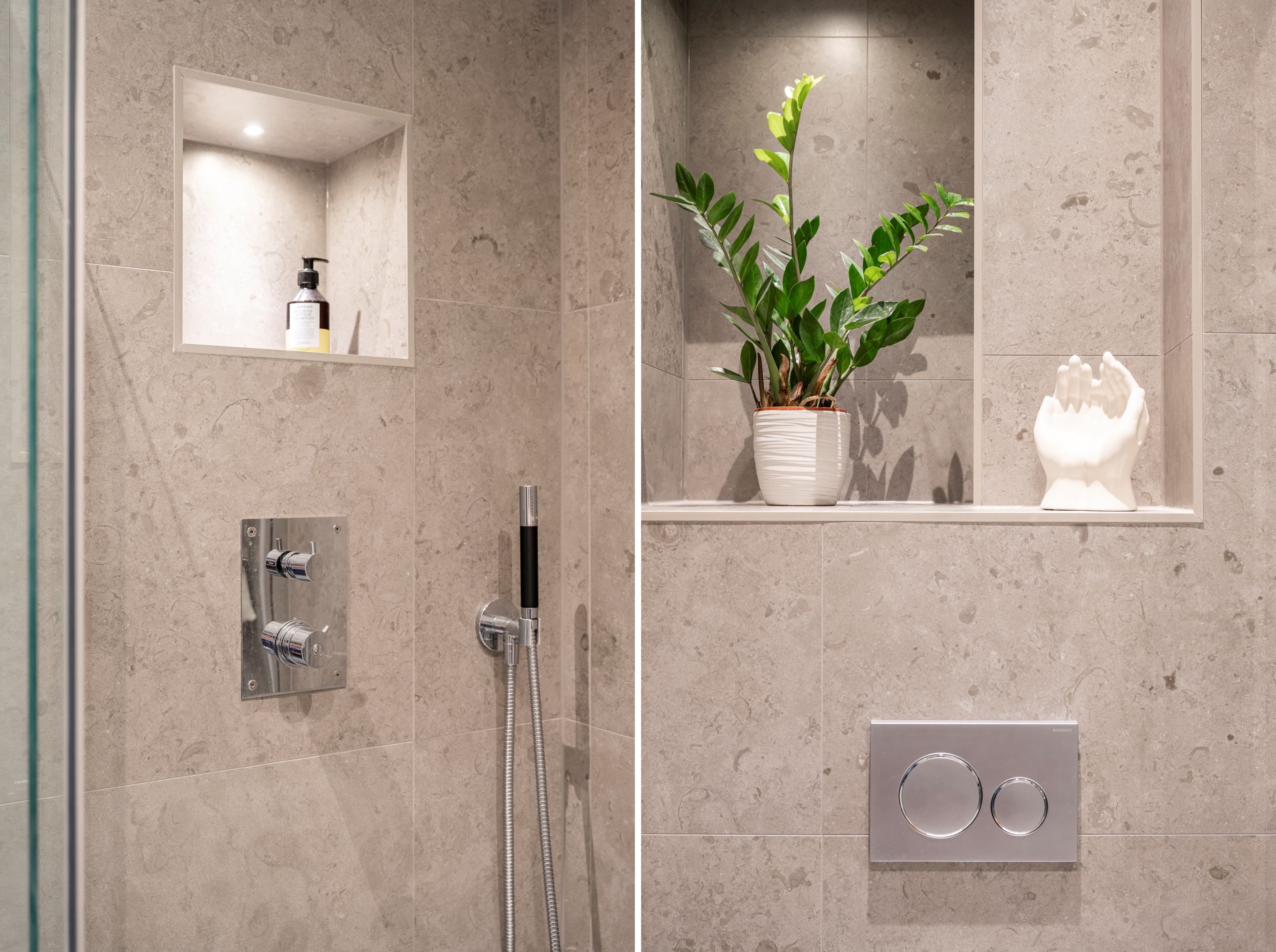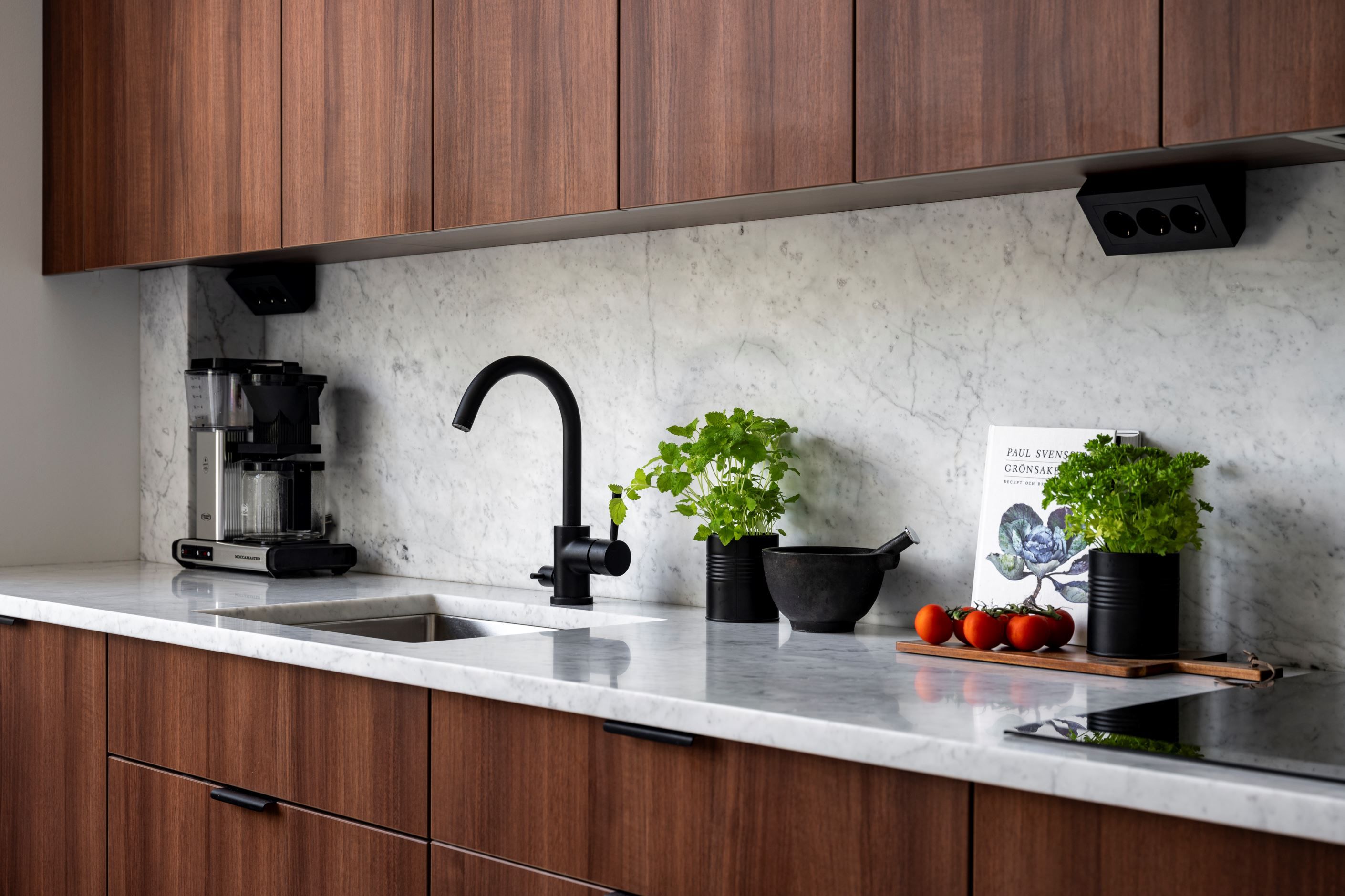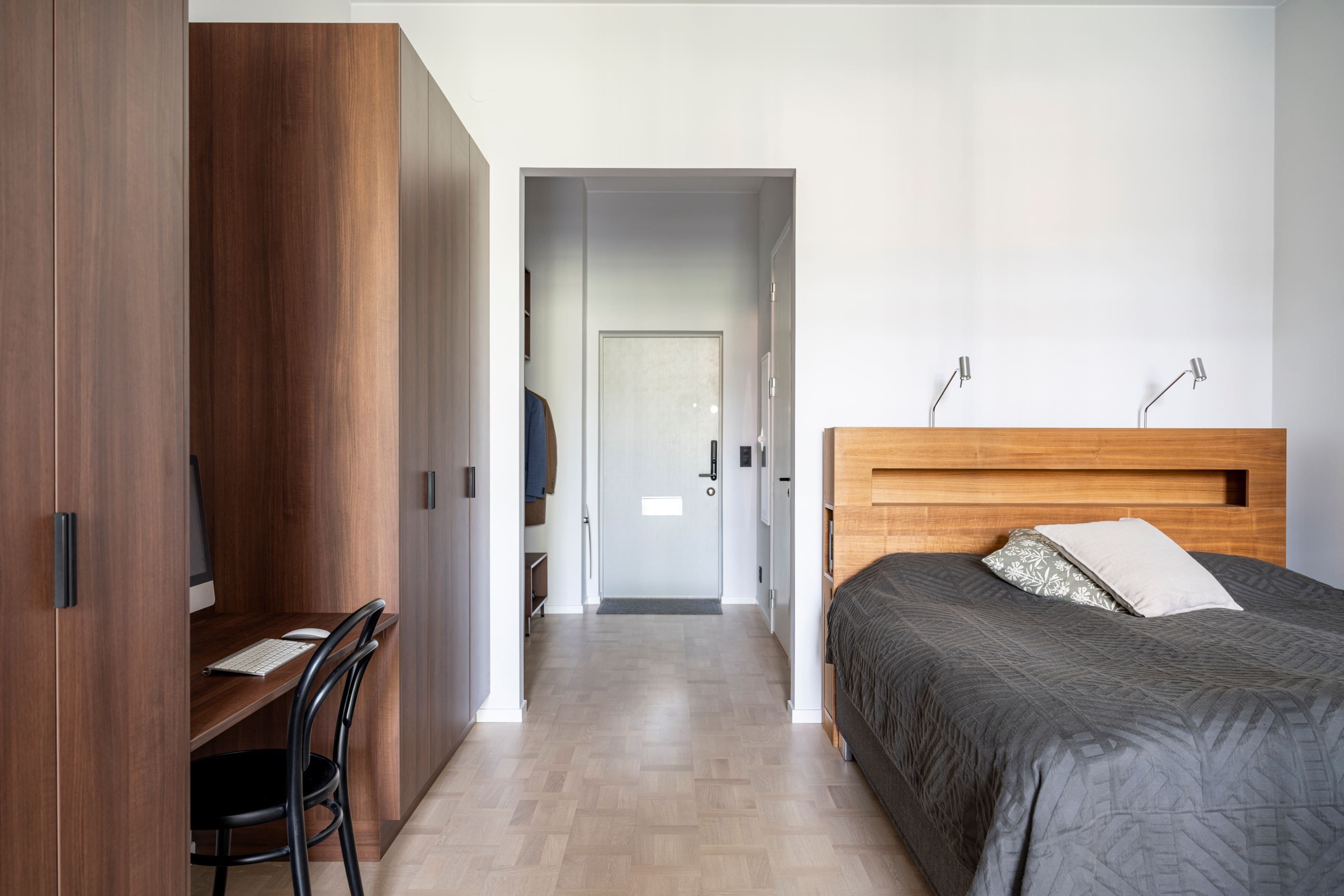 Planlösningen är väldisponerad med generöst med sociala ytor men även en privat sovdel och gott om förvaring. Köket är platsbyggt av Sjöö Fabriksbolag i Solna. Bänkskivan är i sten med nedsänkt diskho och skåpluckor i valnöt. Badrummet har en lyxig hotellkänsla med granitkeramik på både golv och väggar. I duschen finns en unidrain och duschdörrarna går att vika i två steg vilket är mycket praktiskt när duschen inte används. På golvet i resten av lägenheten ligger stavparkett i ljust pigmenterad ek och väggarna är målade.