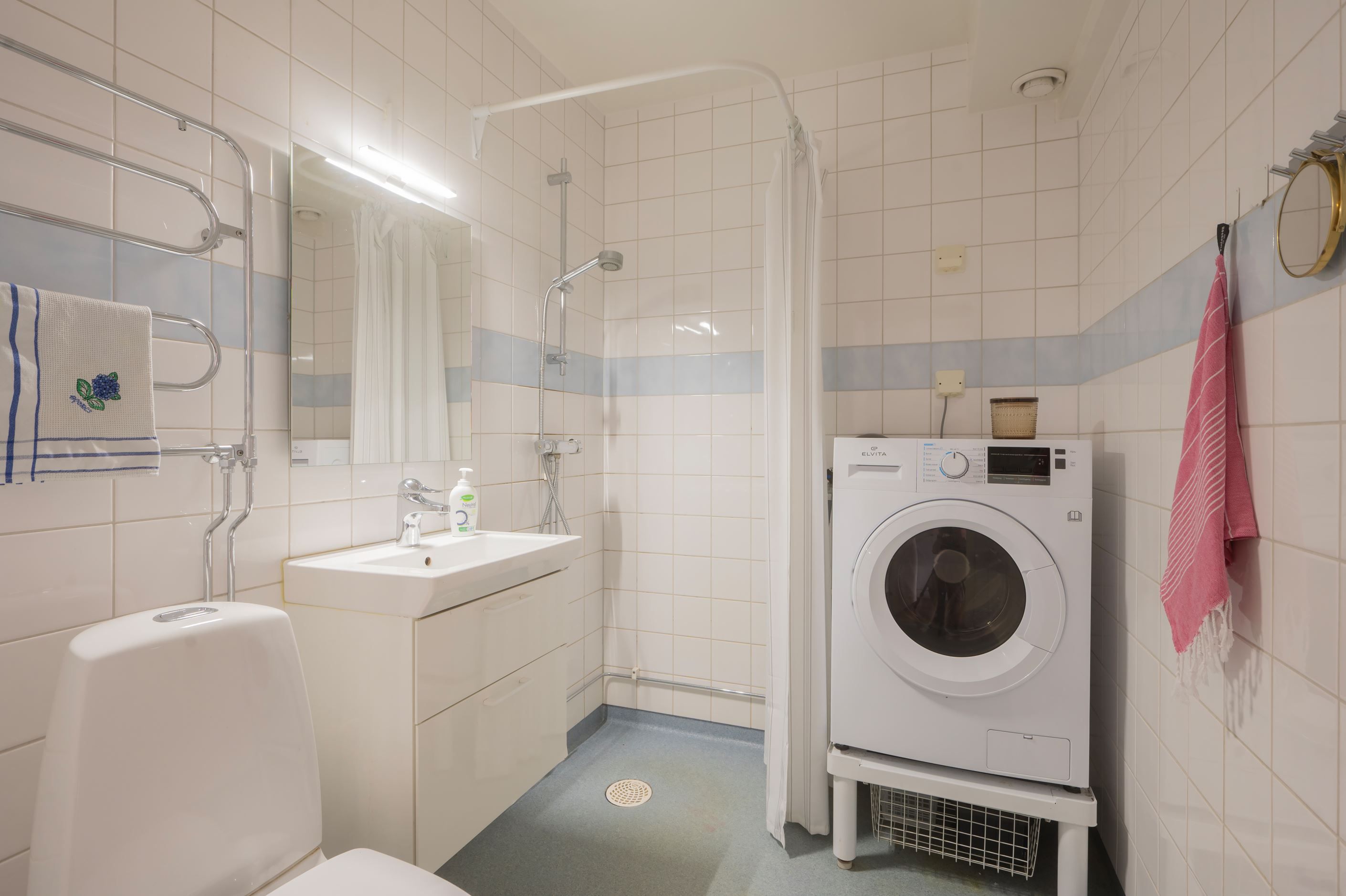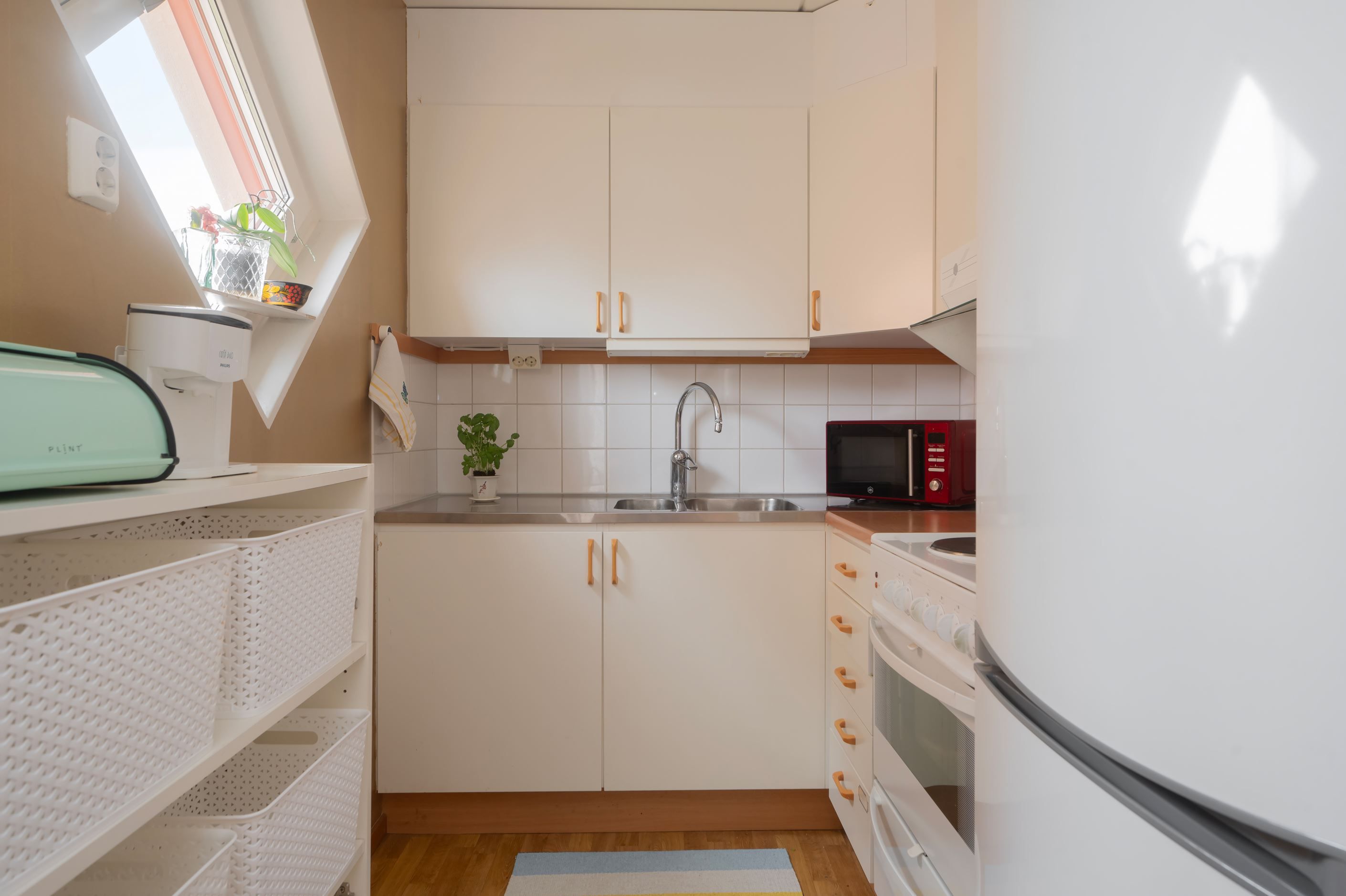 Ett arbetskök med öppningsbart fönster. Badrummet är utrustat med WC, handfat, dusch, handdukstork och tvättmaskin. Till bostaden hör även ett rymligt källarförråd.