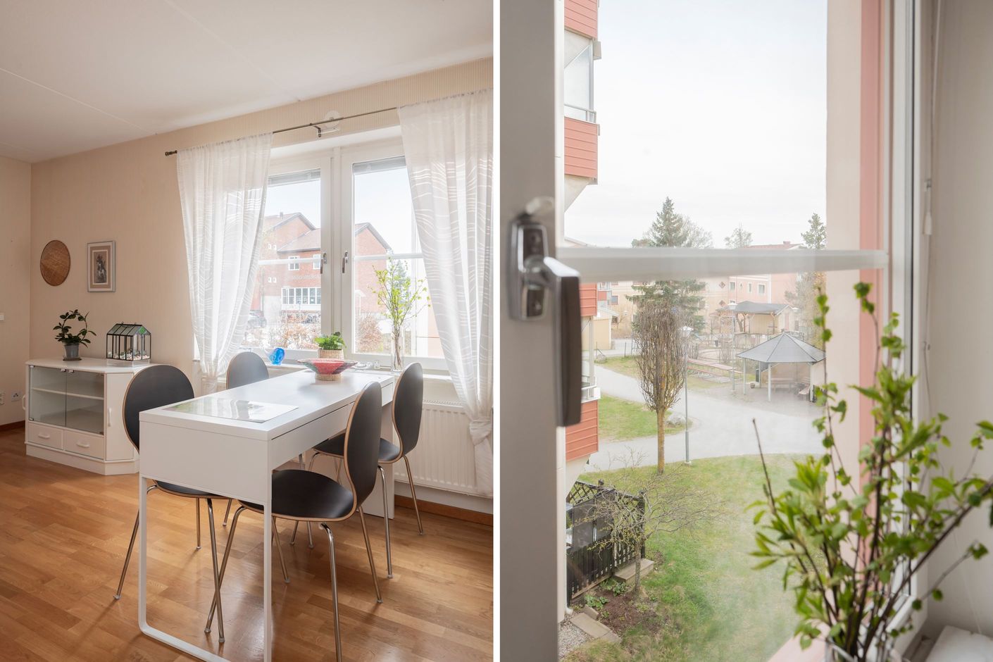 Stora fönster i hela lägenheten ger ett härligt ljusinsläpp. Bostaden består av ett rymligt vardagsrum som binder samman alla rum och erbjuder plats för både soffhörna och matbord med flera sittplatser. Intill ligger sovrummet som rymmer en stor säng och garderober samt har utgång till den inglasade balkongen.