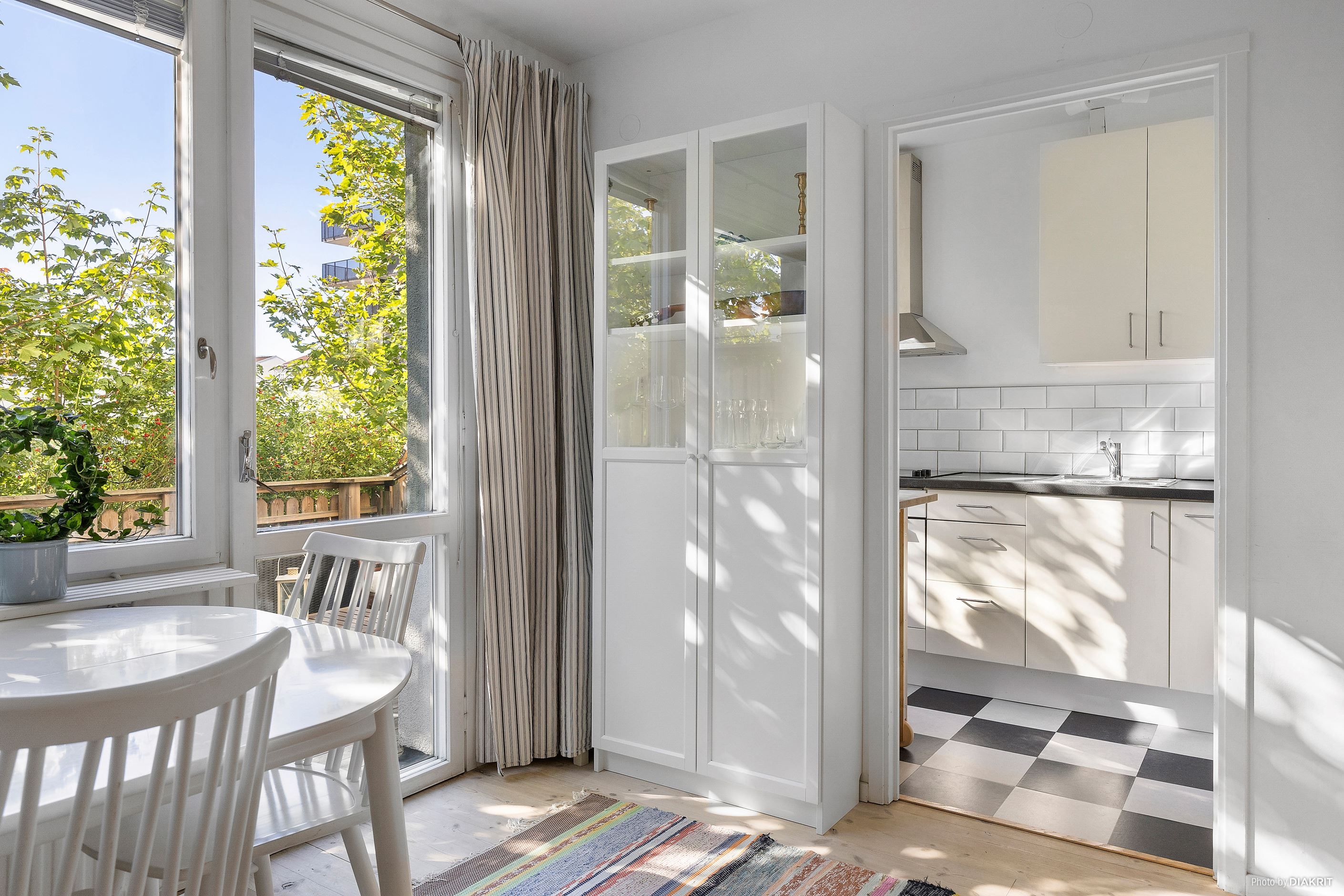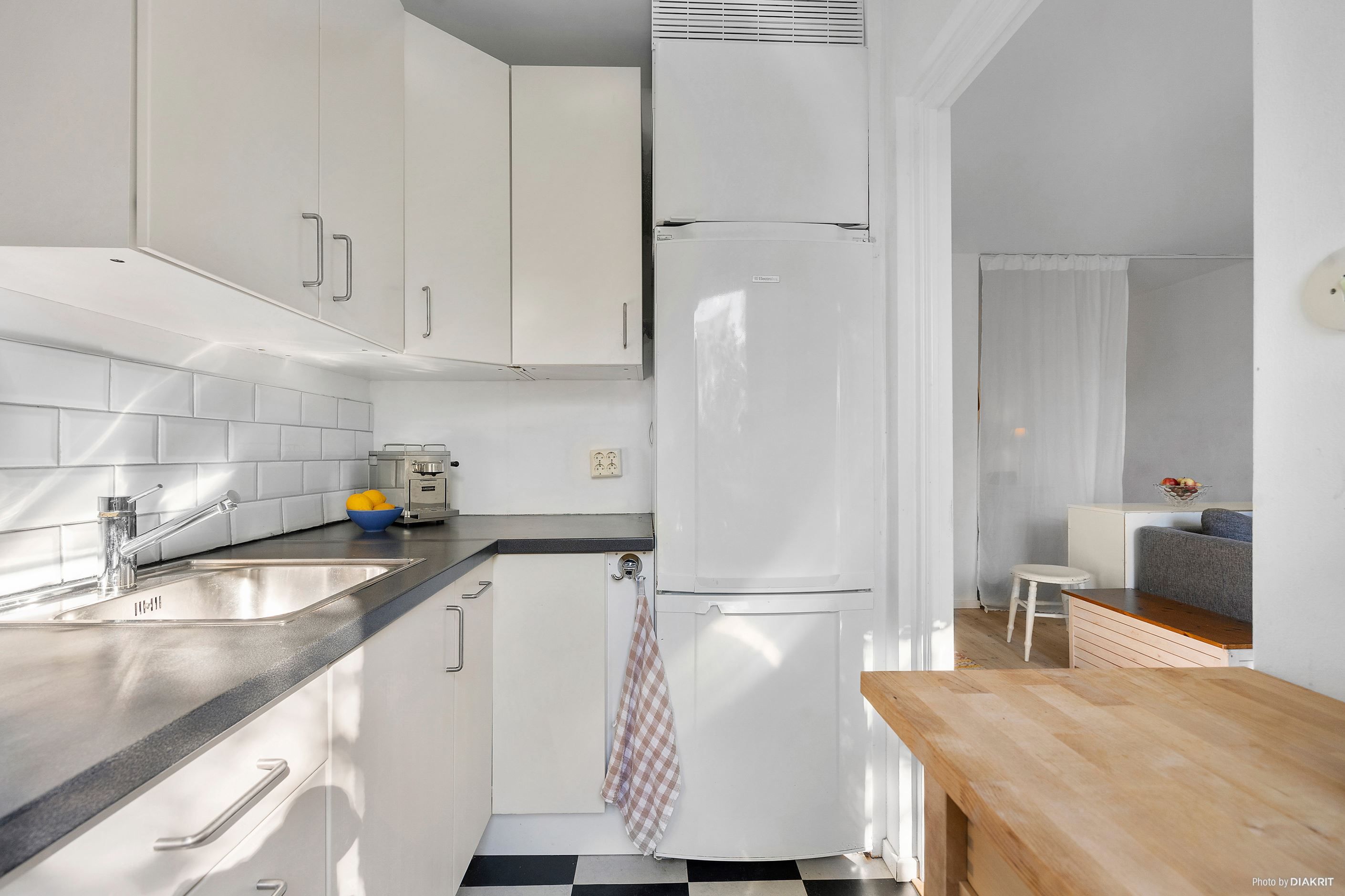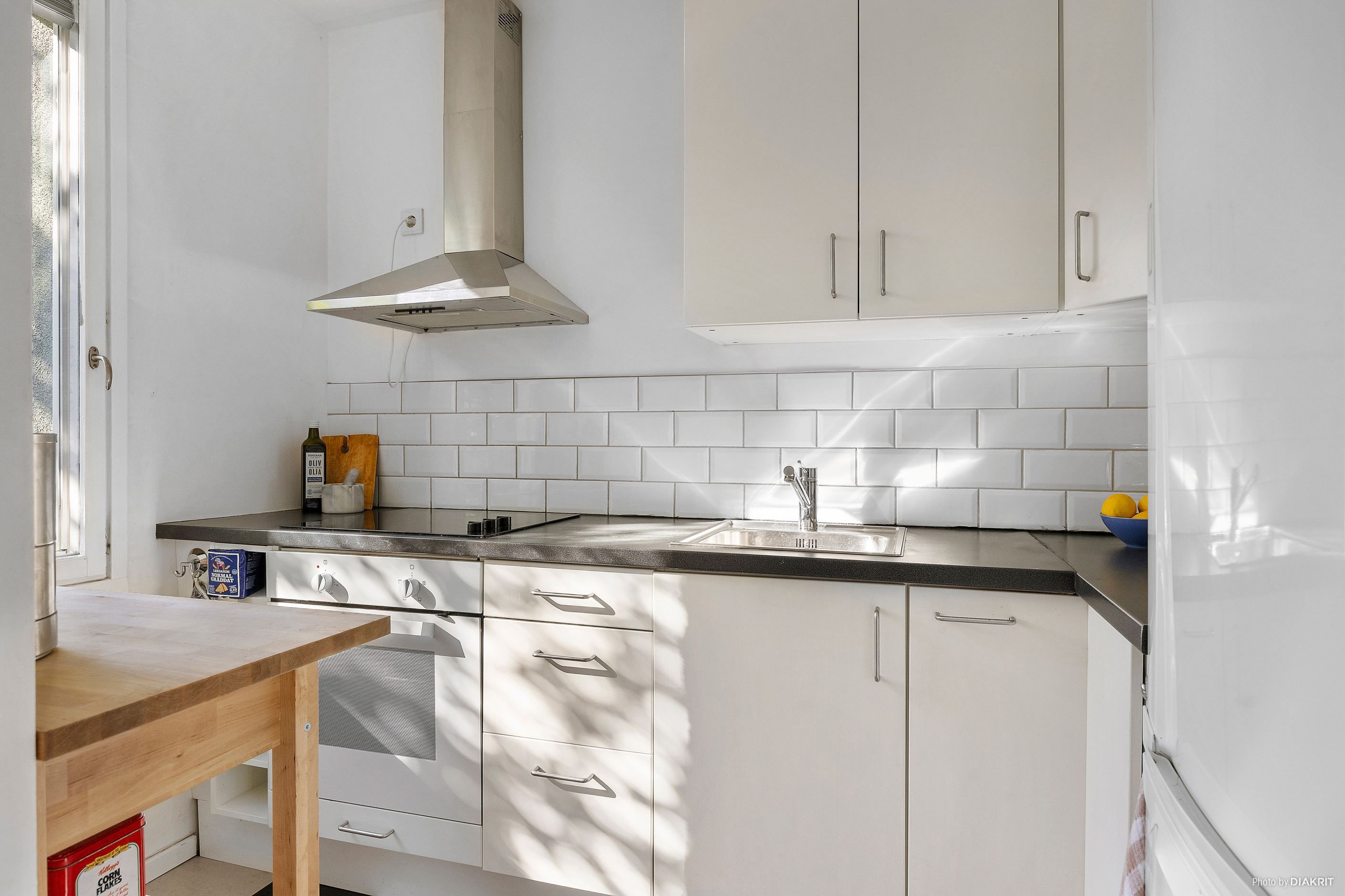 Det fräscha köket är både stilrent och funktionellt, utrustat med bland annat ugn, spis, fläkt samt kyl/frys – allt du behöver för att laga mat med både komfort och elegans. Tack vare det höga läget bostaden befinner sig i i kombination med de generösa fönsterpartierna så tillåts ljuset flöda fritt in i bostaden vilket skapar en känsla av rymd!