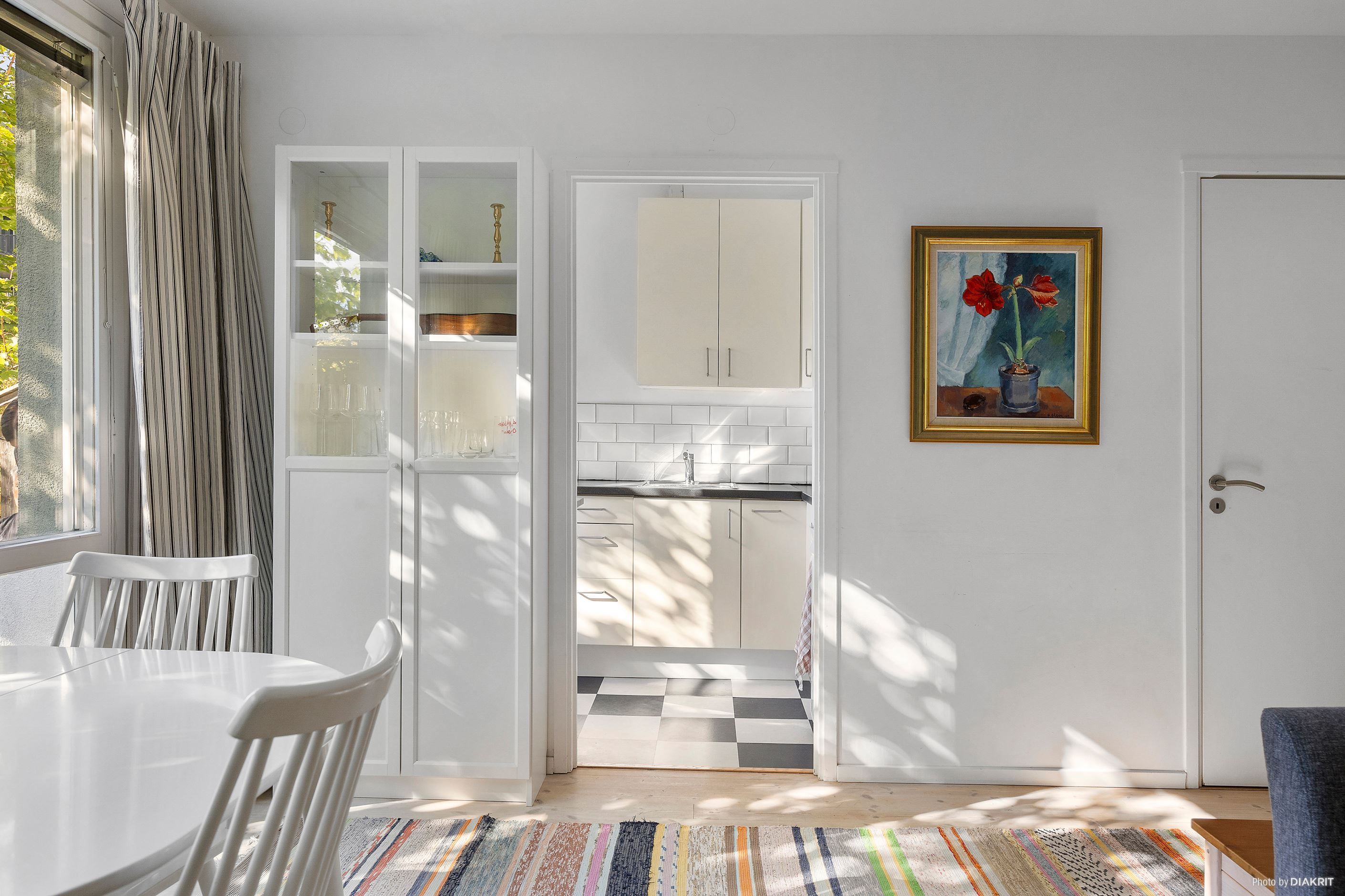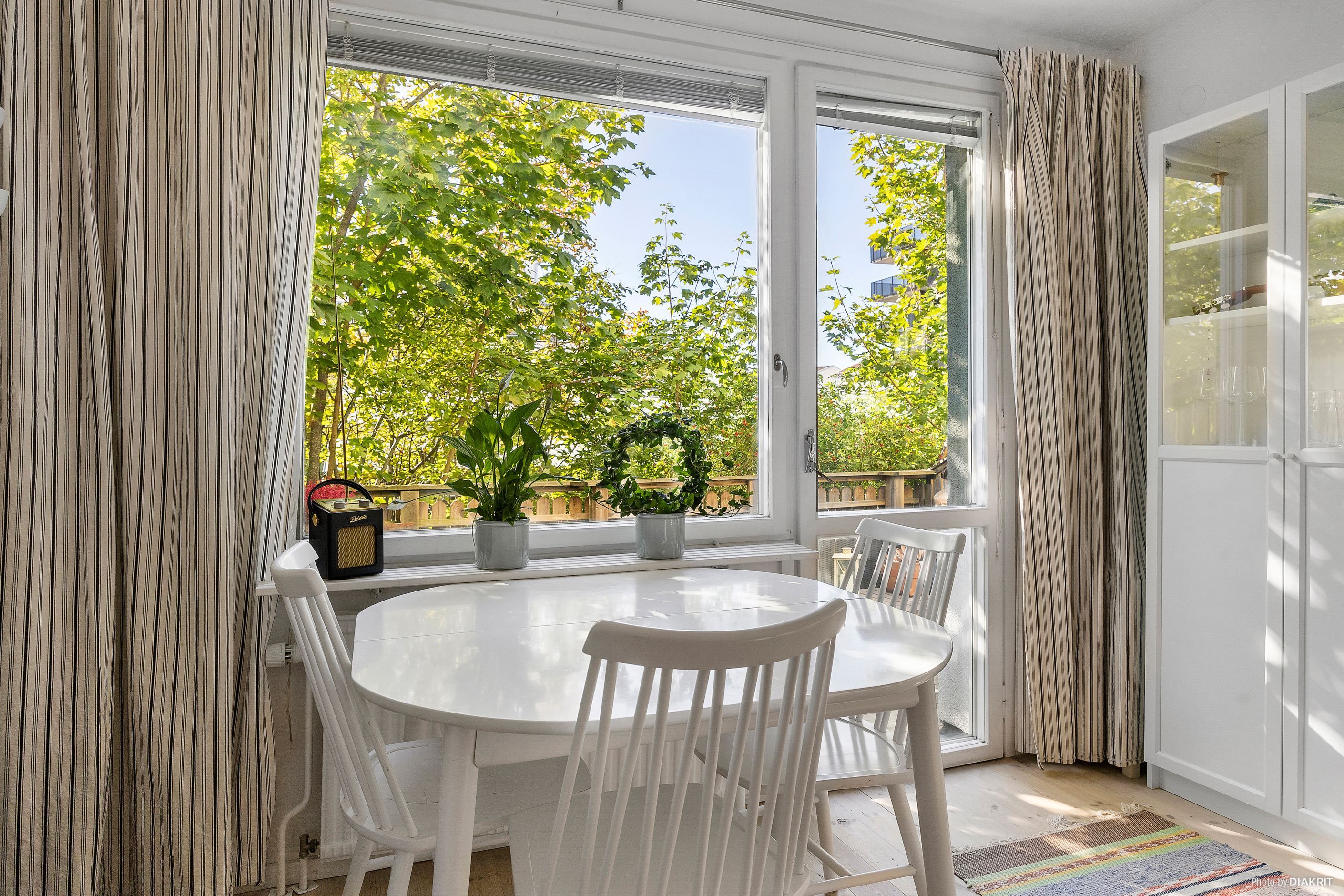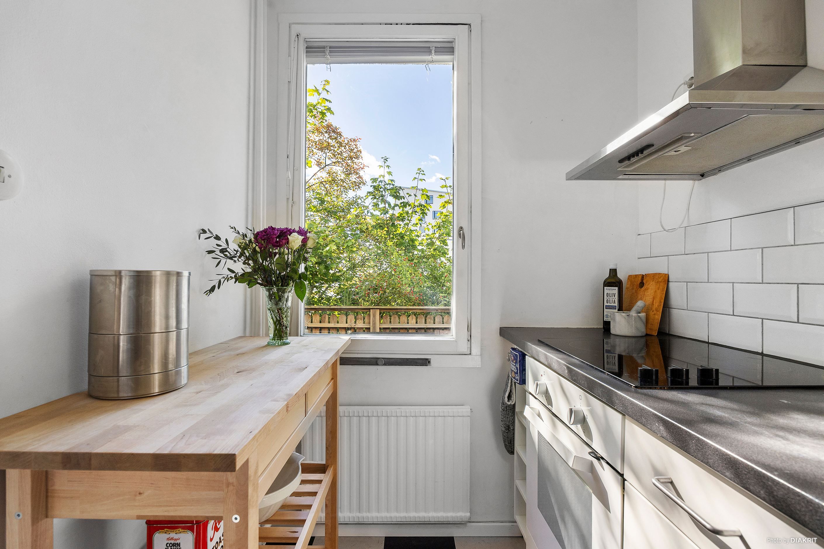 Det fräscha köket är både stilrent och funktionellt, utrustat med bland annat ugn, spis, fläkt samt kyl/frys – allt du behöver för att laga mat med både komfort och elegans. Tack vare det höga läget bostaden befinner sig i i kombination med de generösa fönsterpartierna så tillåts ljuset flöda fritt in i bostaden vilket skapar en känsla av rymd!