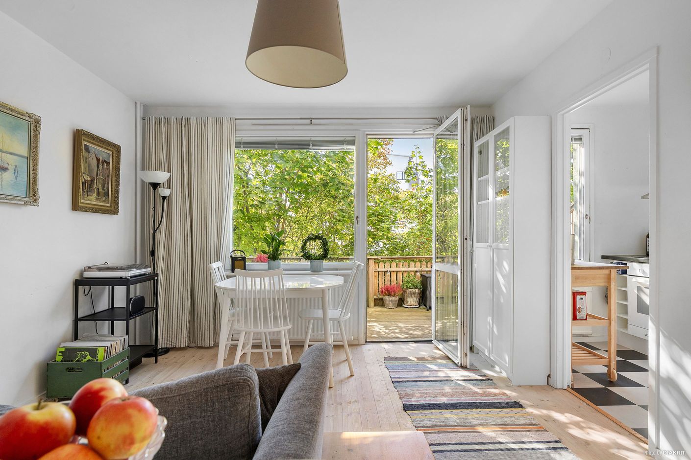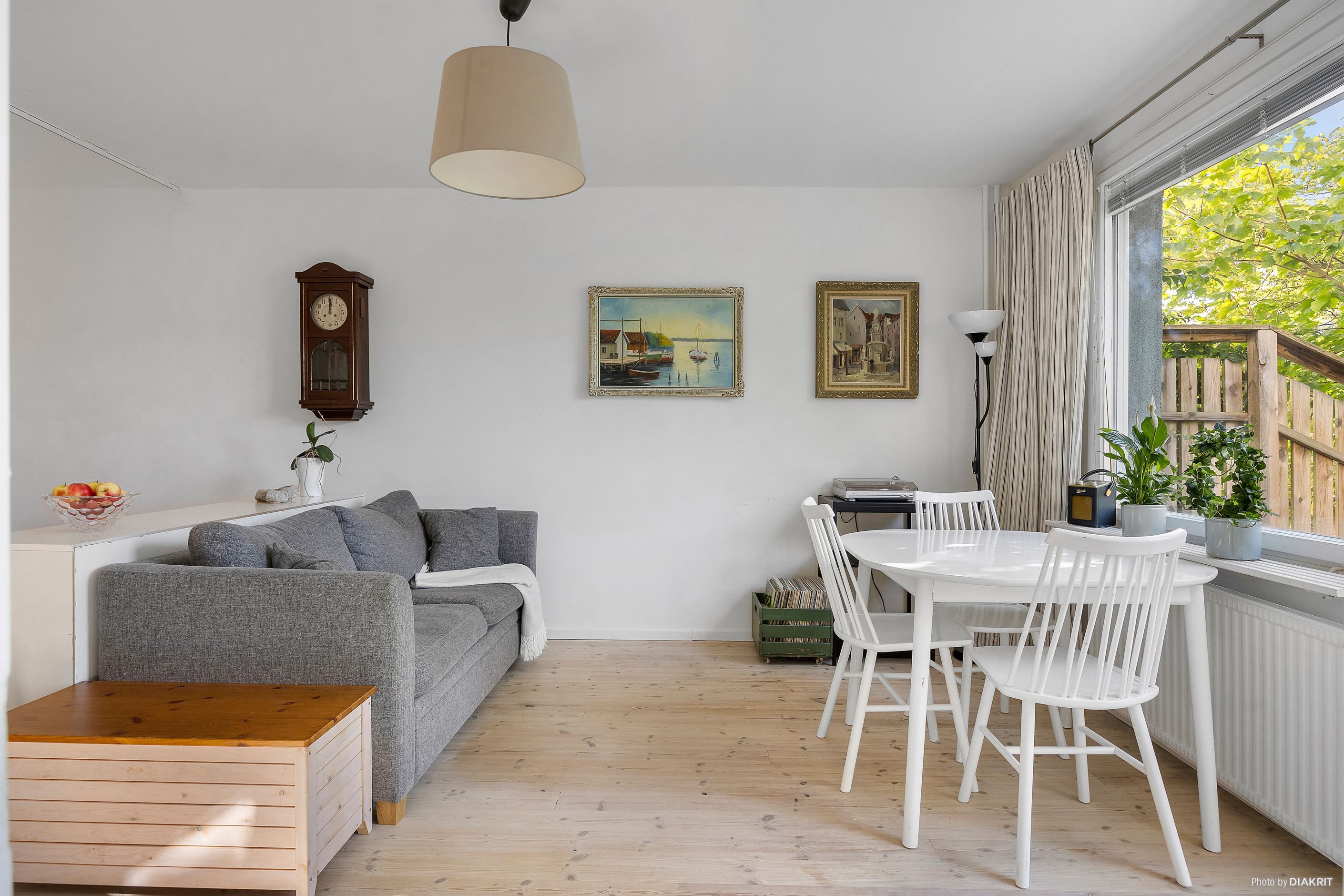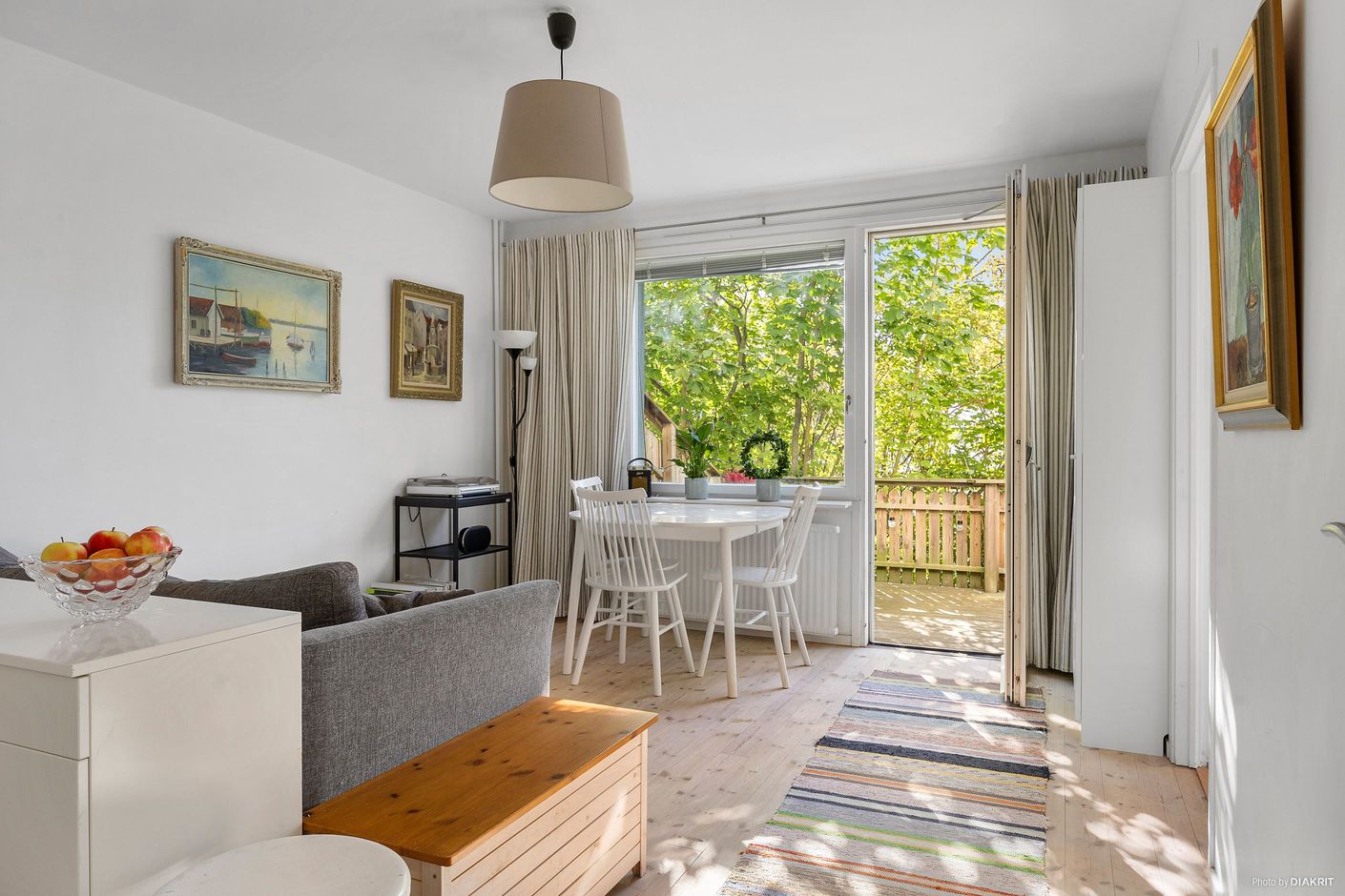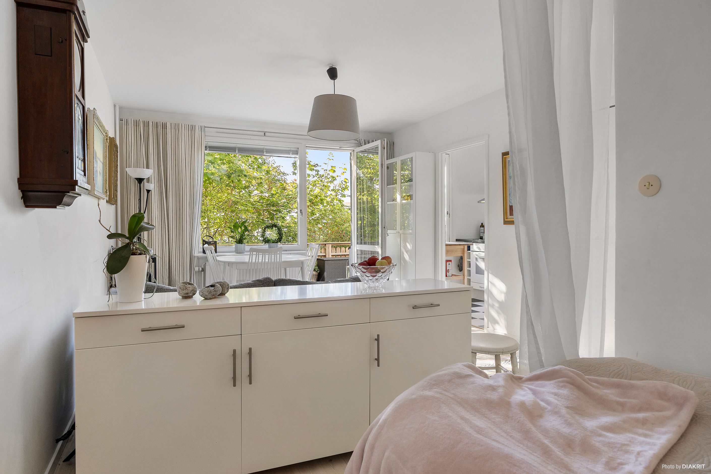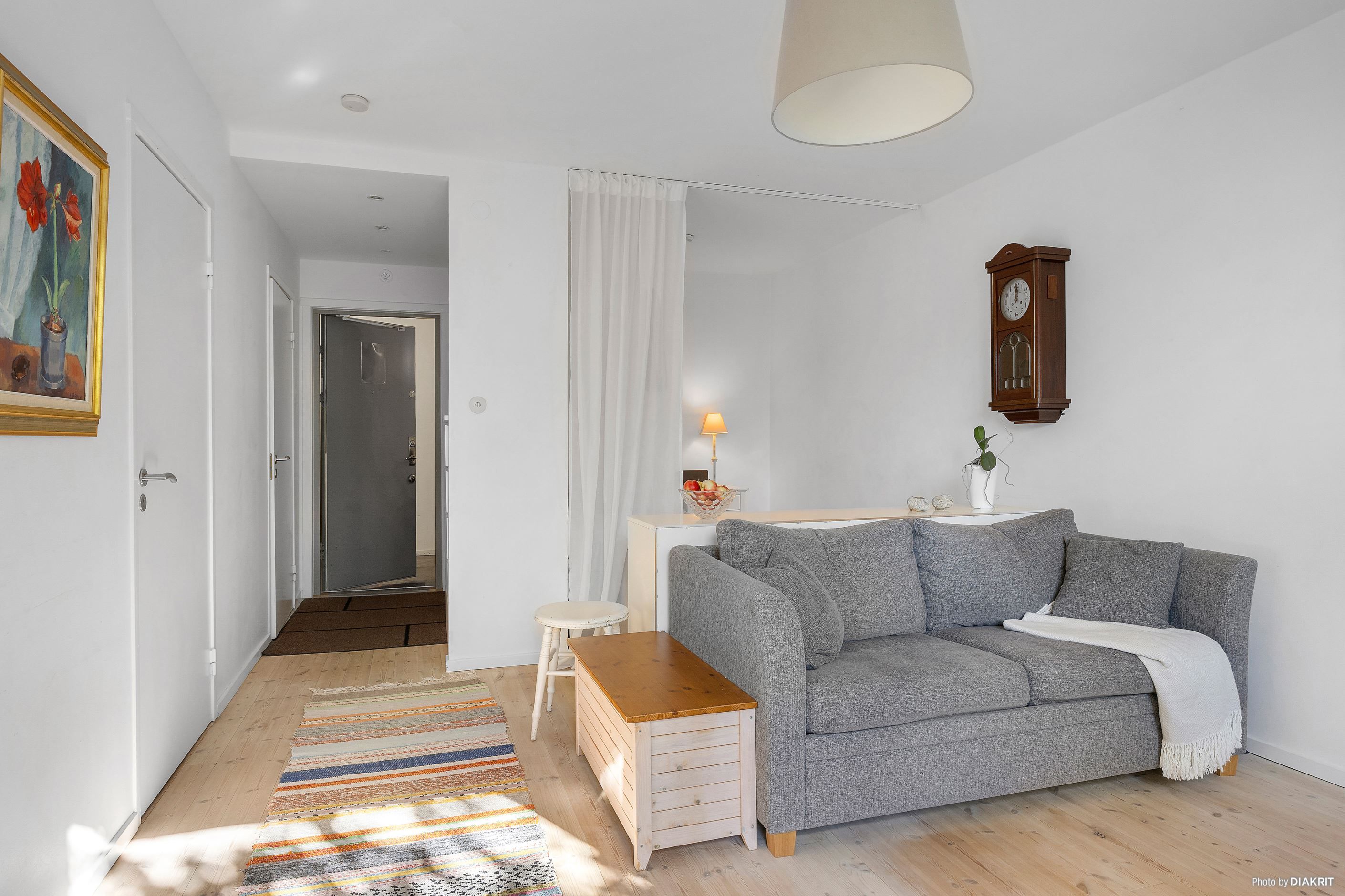 Lägenhetens hjärta är det luftiga vardagsrummet med en naturligt avgränsad sovalkov. Rummet erbjuder gott om plats för både soffa, matbord och annat möblemang som faller er i smaken. Från vardagsrummet når du även ut till den magiska och insynsskyddade altanen i direkt söderläge! Här kommer många timmar att tillbringas med nära och kära.