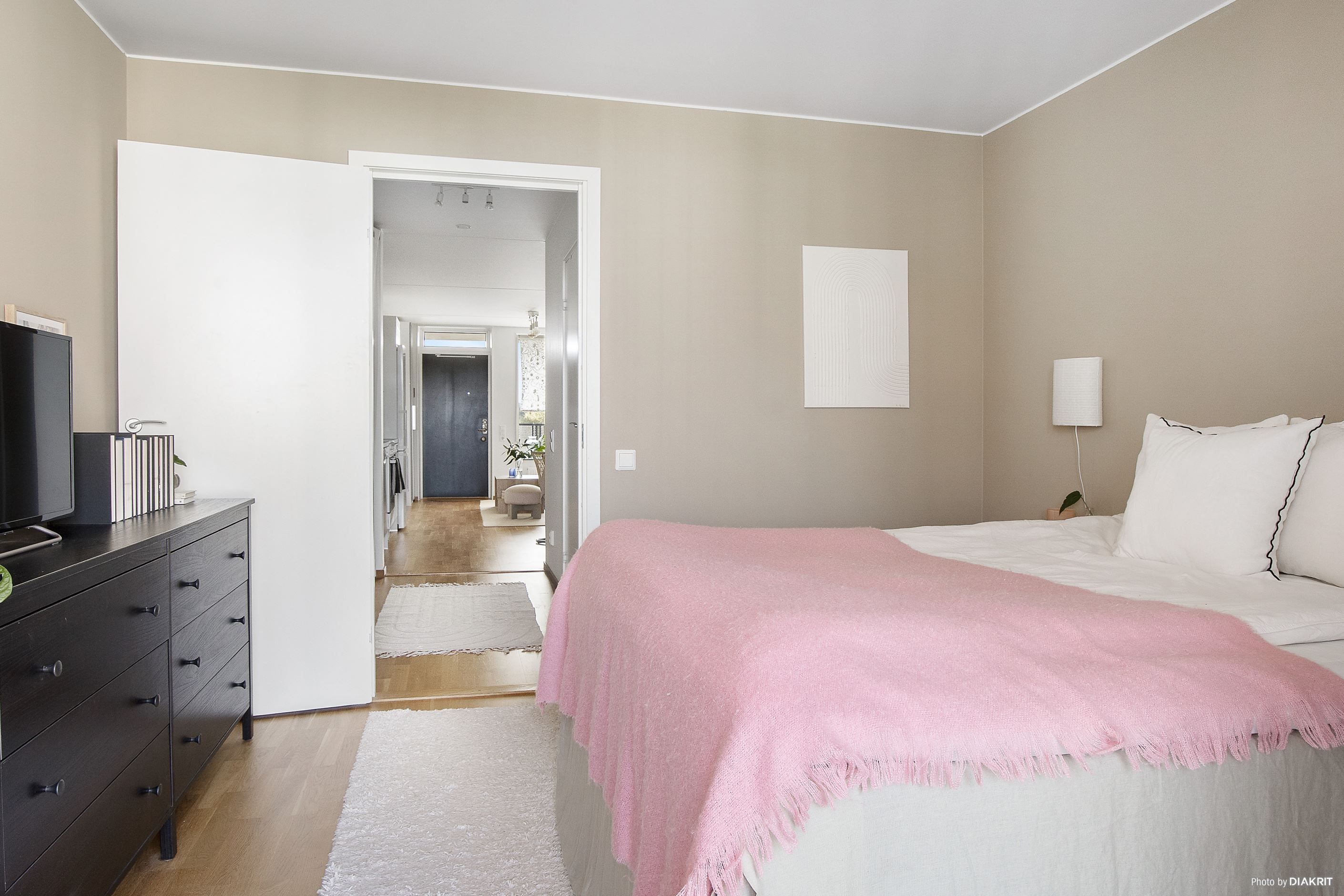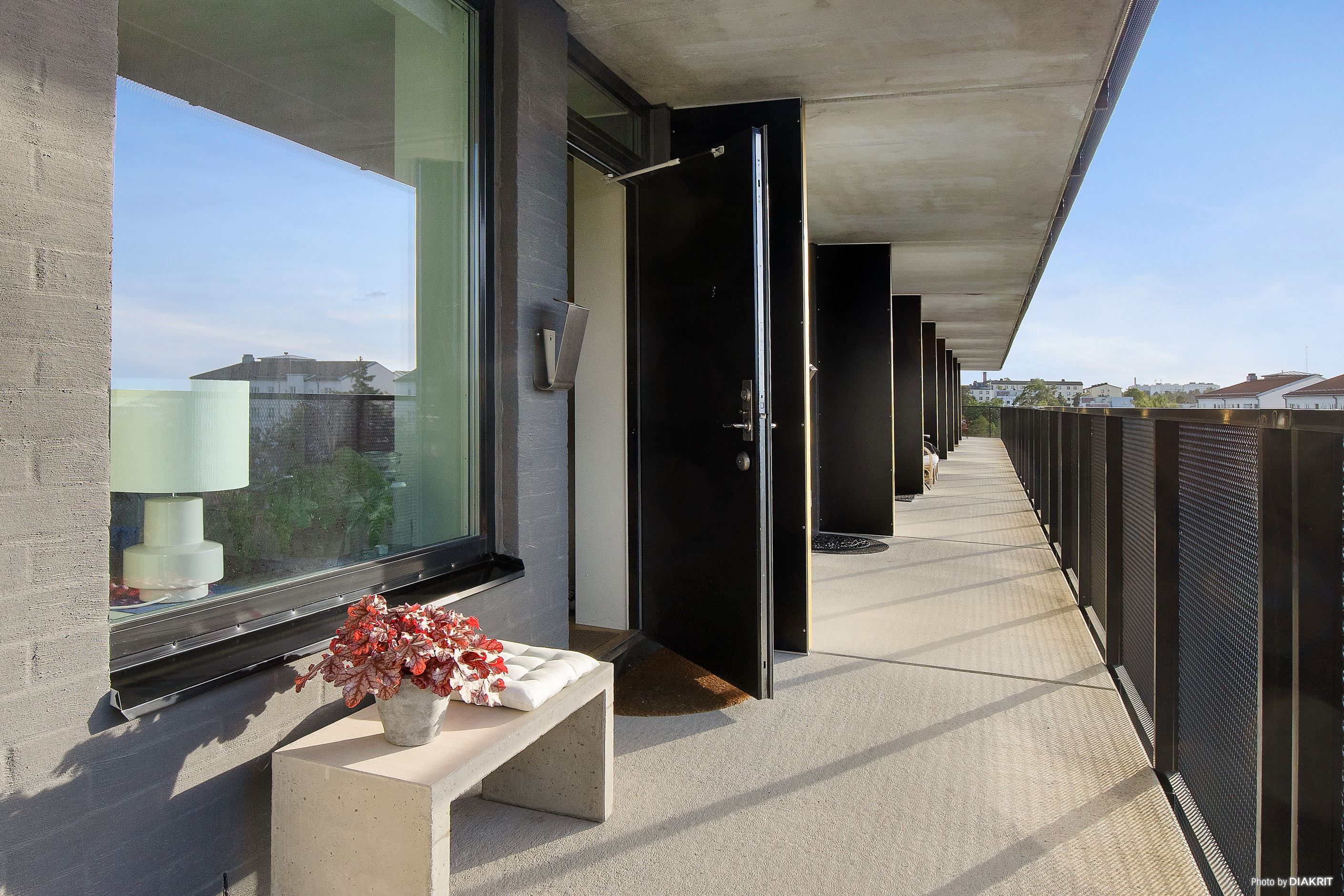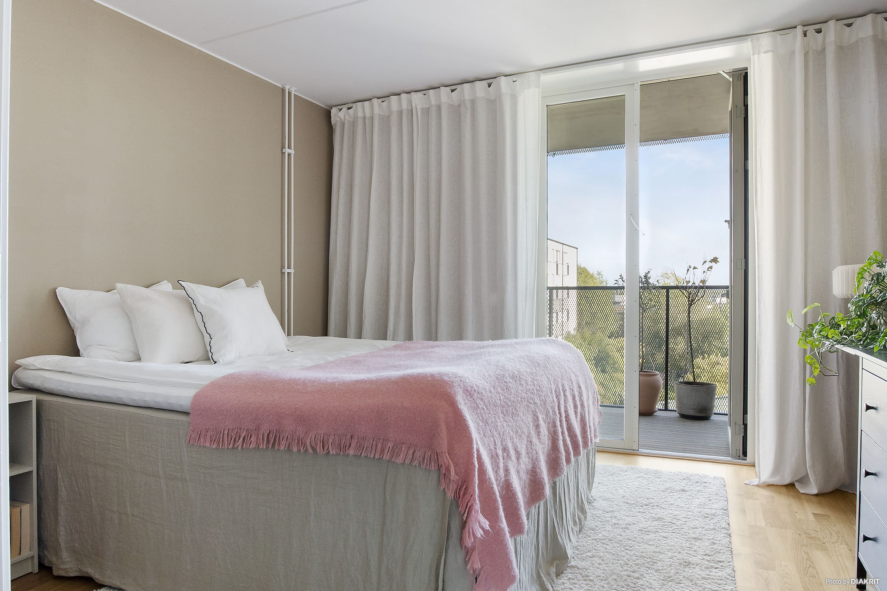 Vidare in i bostaden möts ni av ett stilrent badrum som är helkakalt med svart klinkergolv och vitt kakel på väggarna. Utrustningsnivån är hög och erbjuder allt ifrån golvvärme, handdukstork och tvättmaskin. Sovrummet är rymligt och rymmer en bekväm dubbelsäng, skrivbord och annat möblemang. Från sovrummet har ni även direkt tillgång till bostadens balkong som är i bra storlek och vetter mot sydost.
