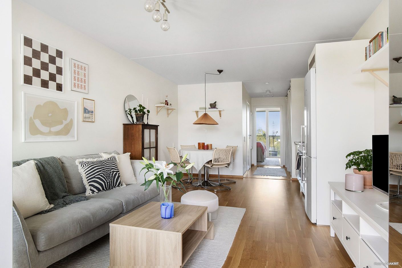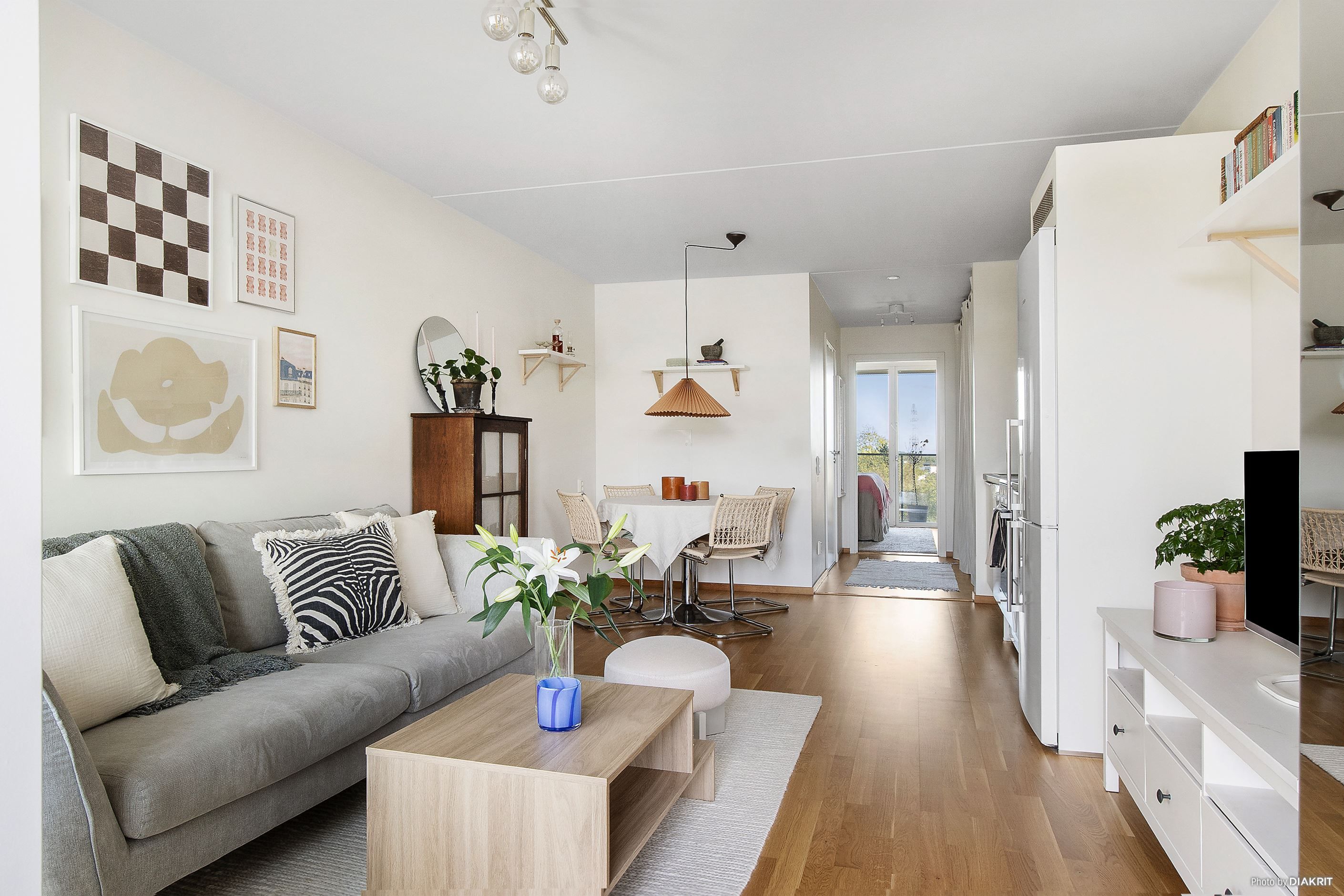 Bostaden erbjuder 41 välplanerade kvadratmeter där ingen yta har gått till spillo. Den lättmöblerade vardagsrummet erbjuder plats för soffa, bord och annat möblemang. Modernt kök i en öppen planlösning mot vardagsrummet med integrerade vitvaror och påkostade materialtillval. Här finns gott om plats för ett större köksbord med plats för 6 personer.