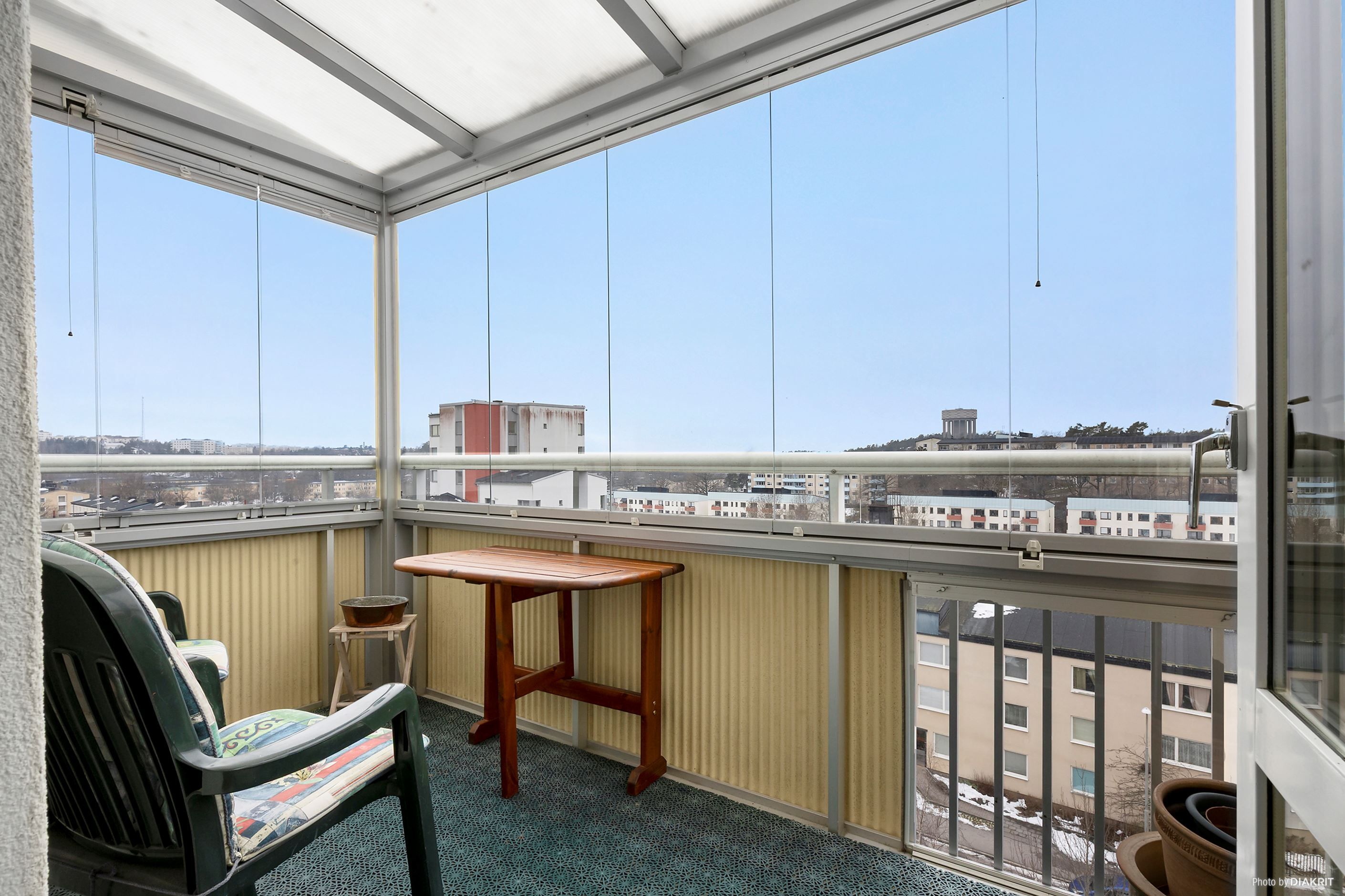 - Härlig balkong högst upp i huset med en milsvid utsikt över takåsar, grönska och Mälaren