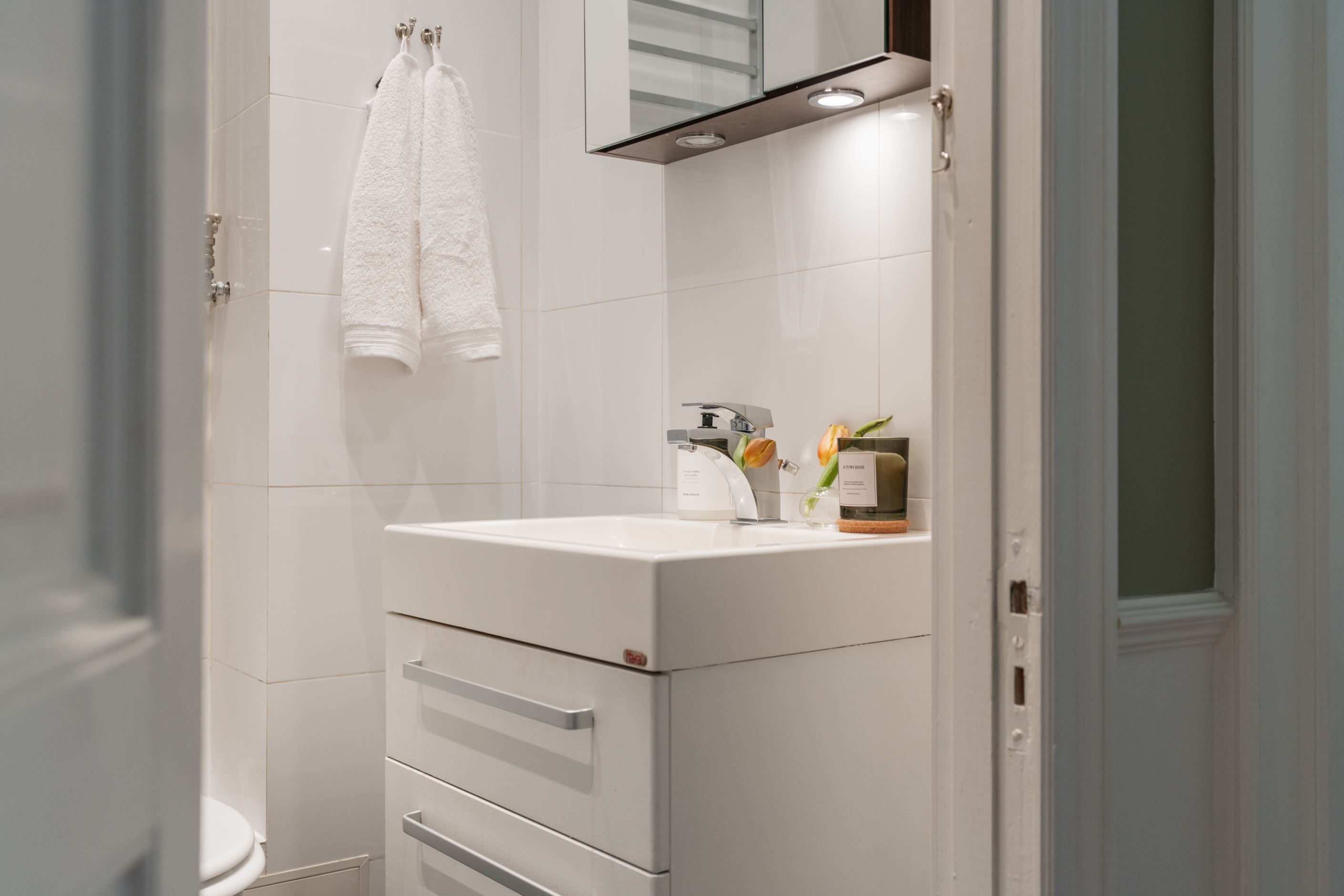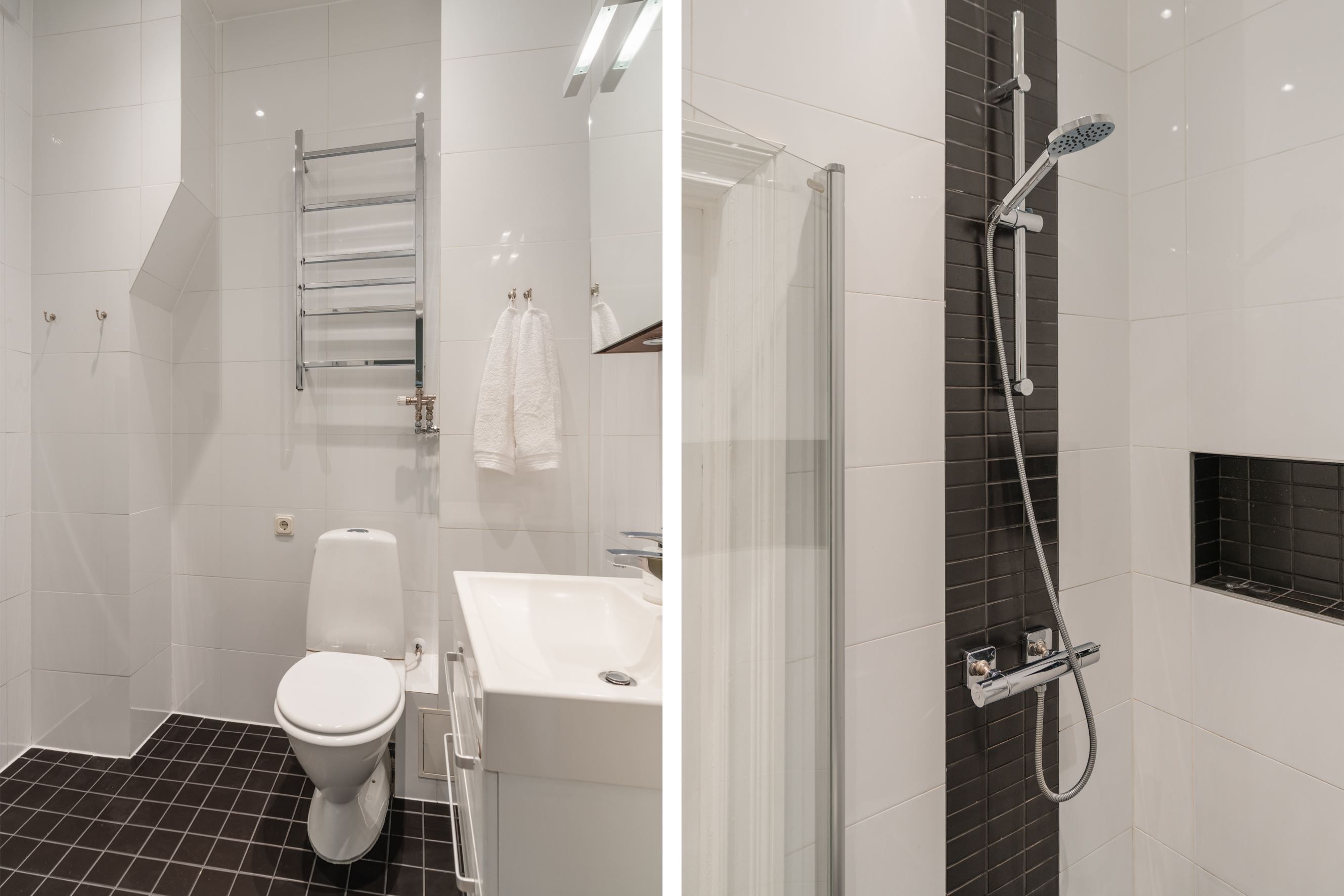 Köket är separat beläget och inbjudande, stilrent renoverat med köksö och väldigt gott om förvaring. Fullt maskinellt utrustat med kyl/frys, ugn, micro, spis, fläkt och diskmaskin. Badrummet är helkaklat och utrustat med dusch, handfat och WC, det finns även plats för tvättmaskin. Både i hallen och sovrummet erbjuds goda förvaringsmöjligheter genom flera garderober.