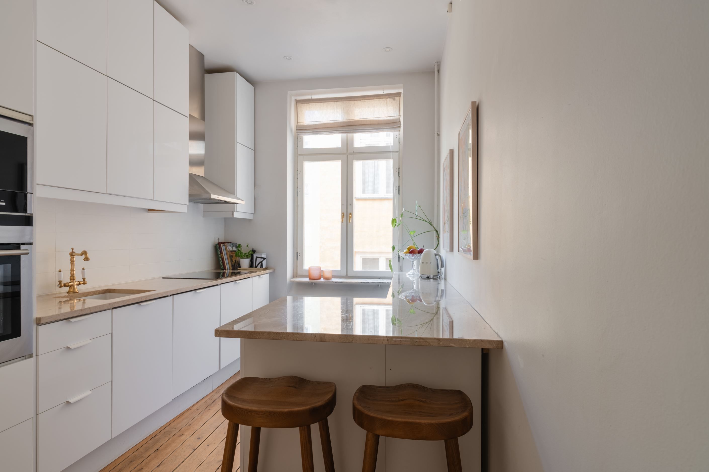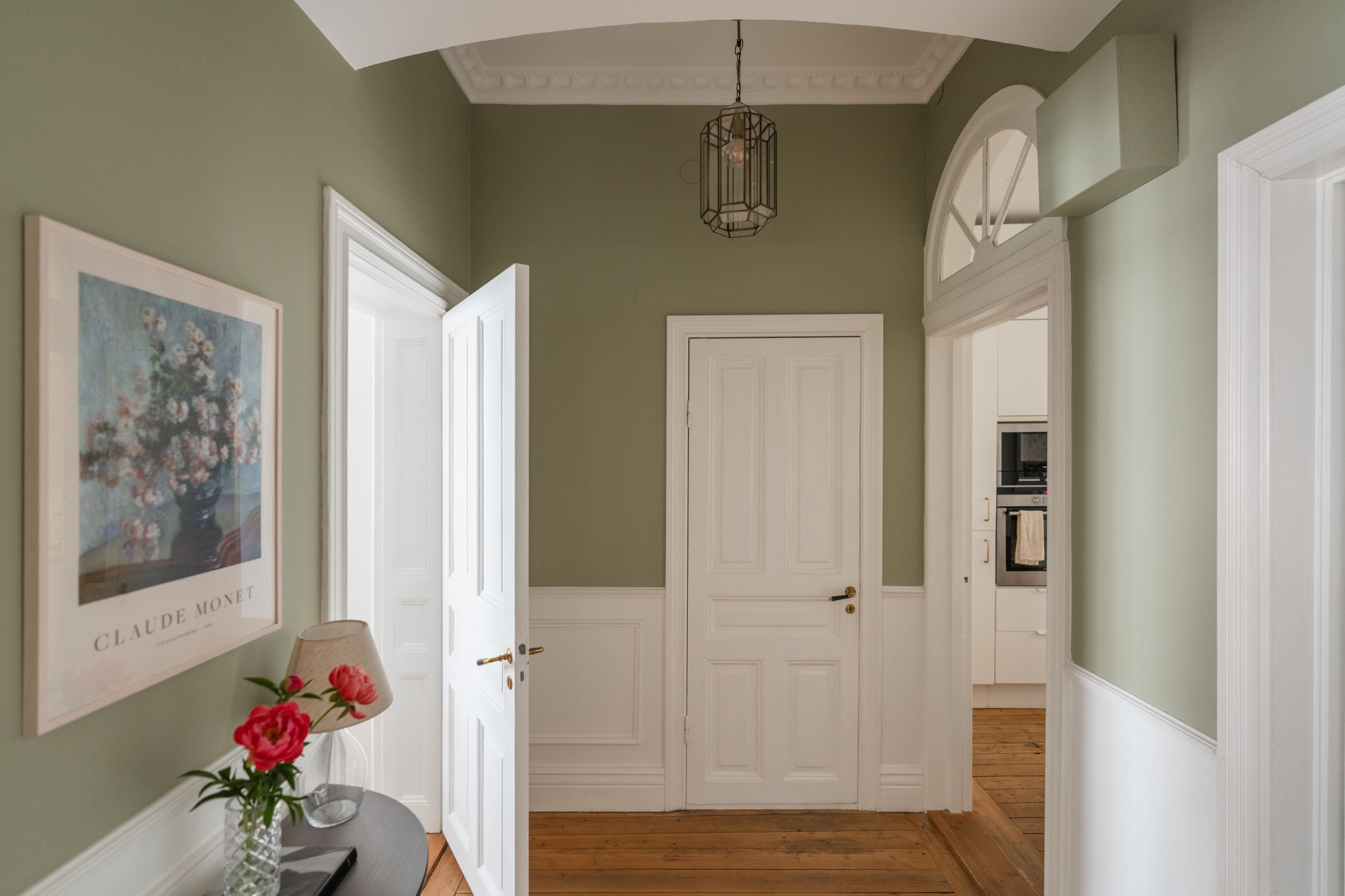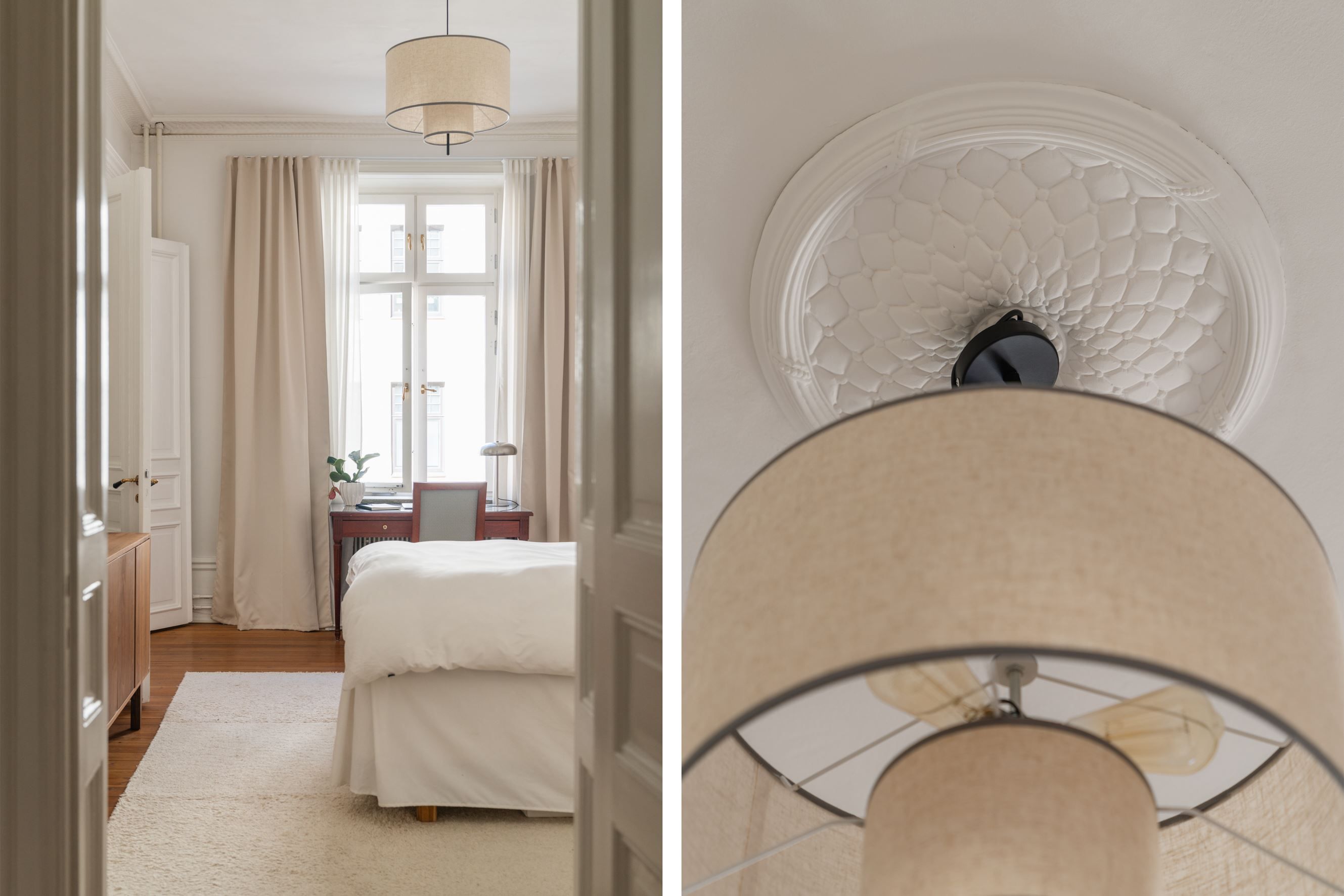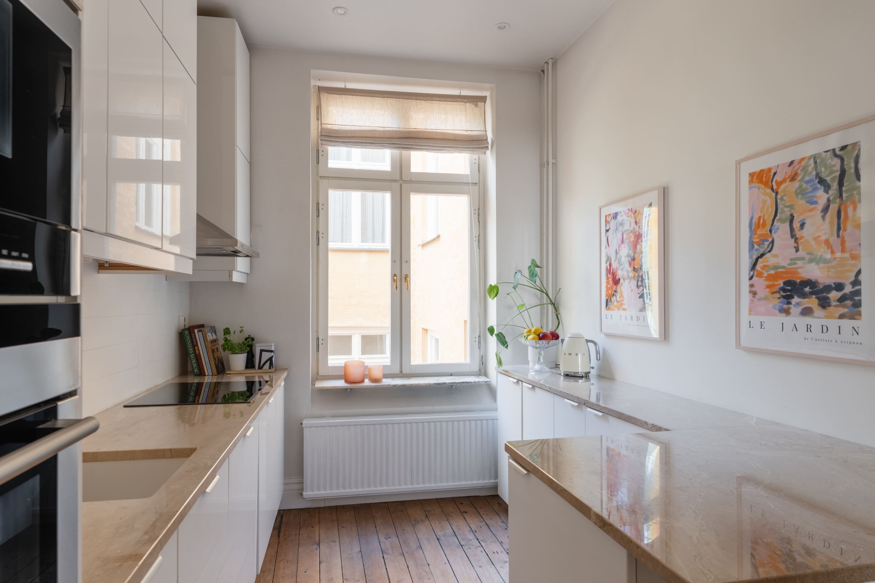 Den generösa takhöjden om ca 3,3 meter skapar en fantastisk rymd, medan vackra stuckaturer, genomgående furutiljor och tidstypiska detaljer ger bostaden en elegant och inbjudande karaktär. De höga fönstren ligger vackert i fil och släpper in ett rikligt ljusflöde som förstärker den luftiga känslan.