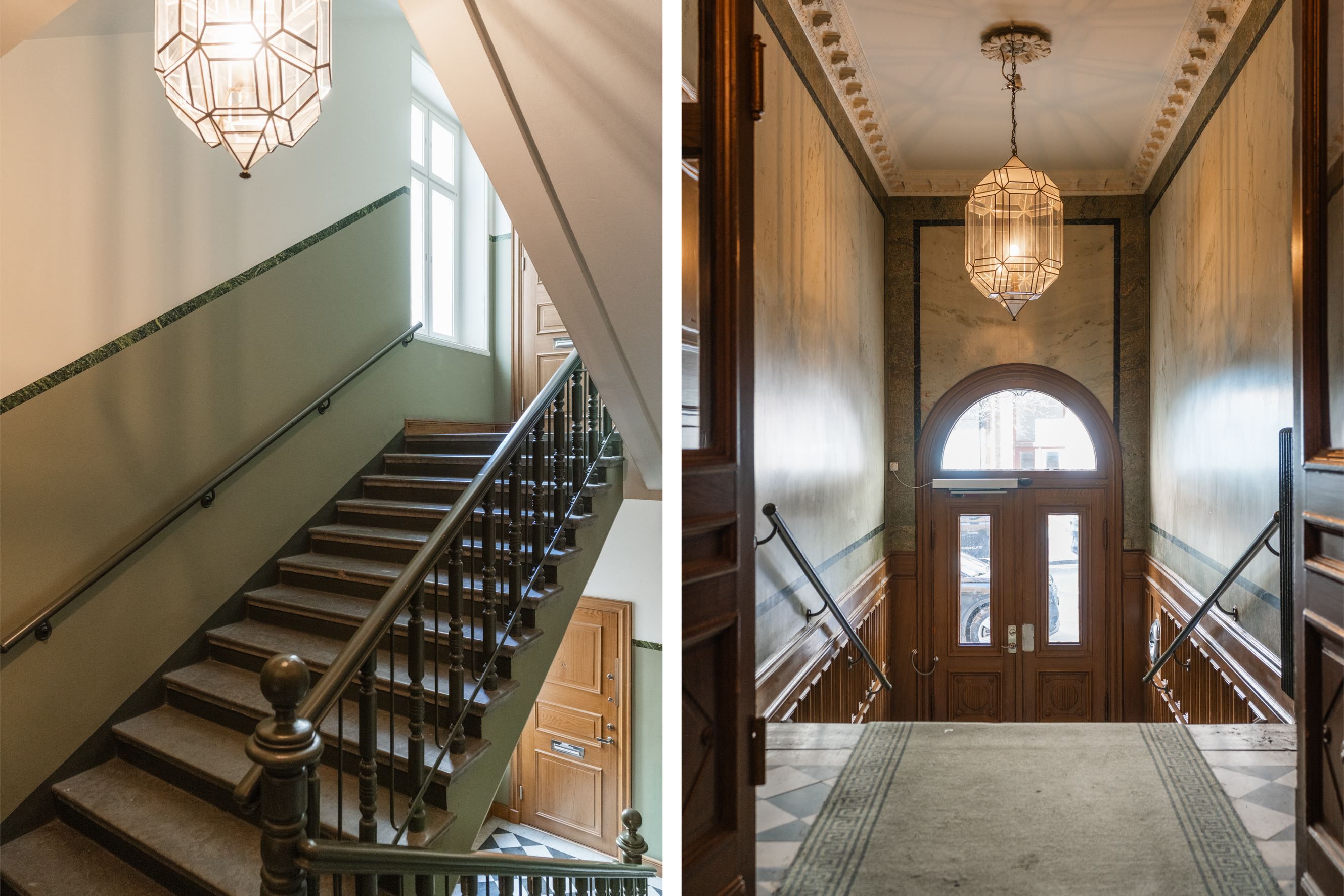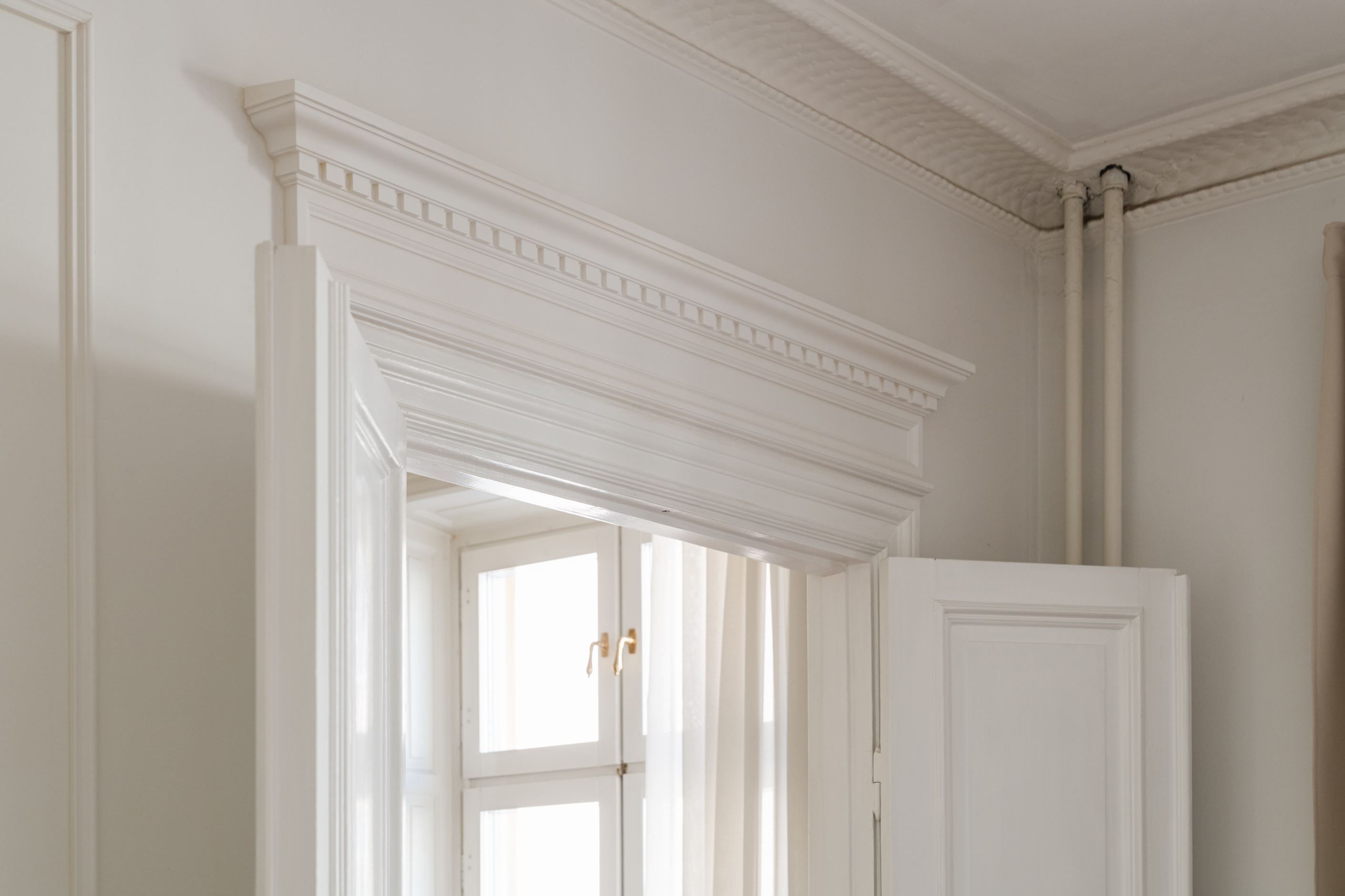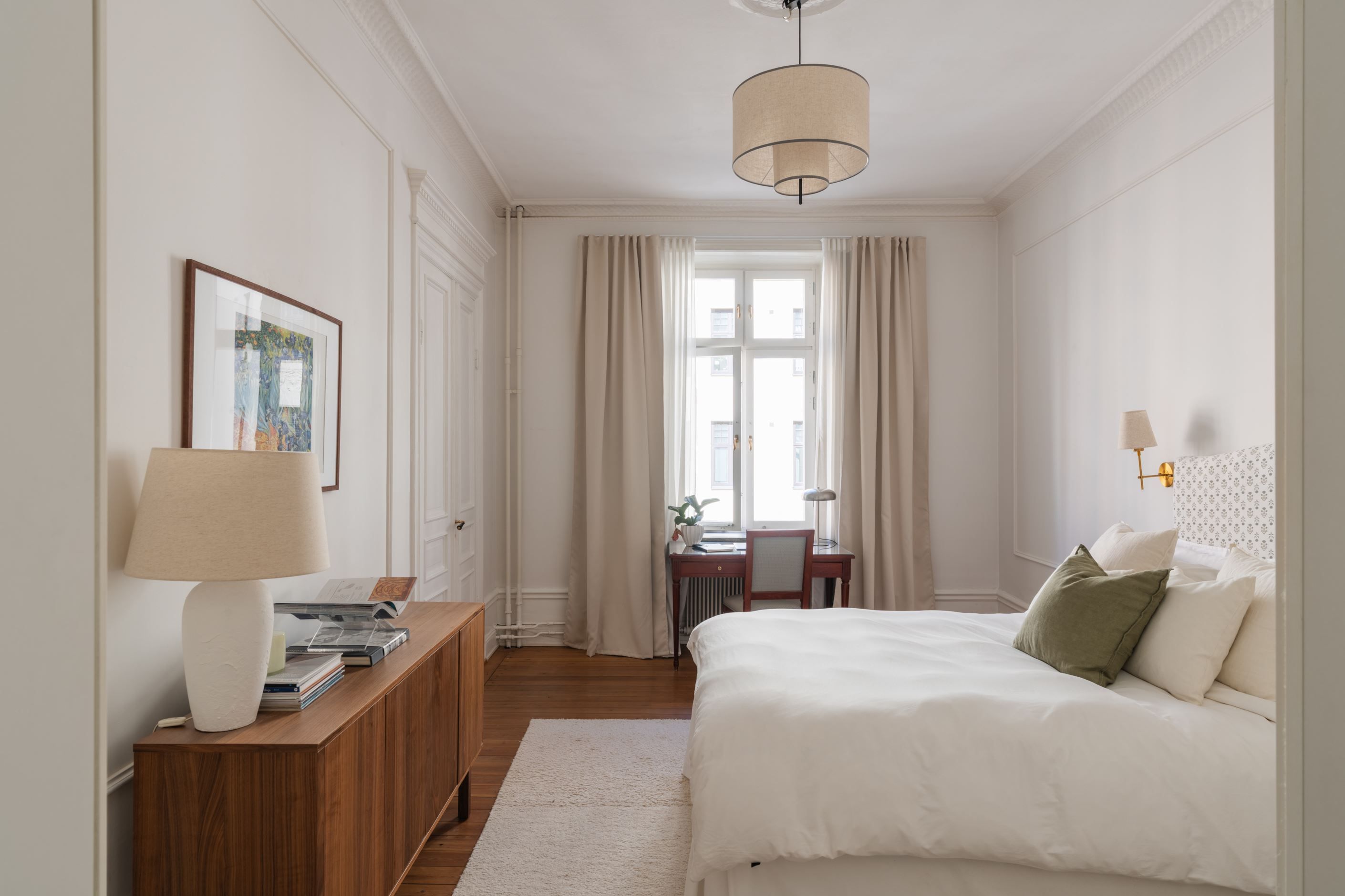 Den generösa takhöjden om ca 3,3 meter skapar en fantastisk rymd, medan vackra stuckaturer, genomgående furutiljor och tidstypiska detaljer ger bostaden en elegant och inbjudande karaktär. De höga fönstren ligger vackert i fil och släpper in ett rikligt ljusflöde som förstärker den luftiga känslan.
