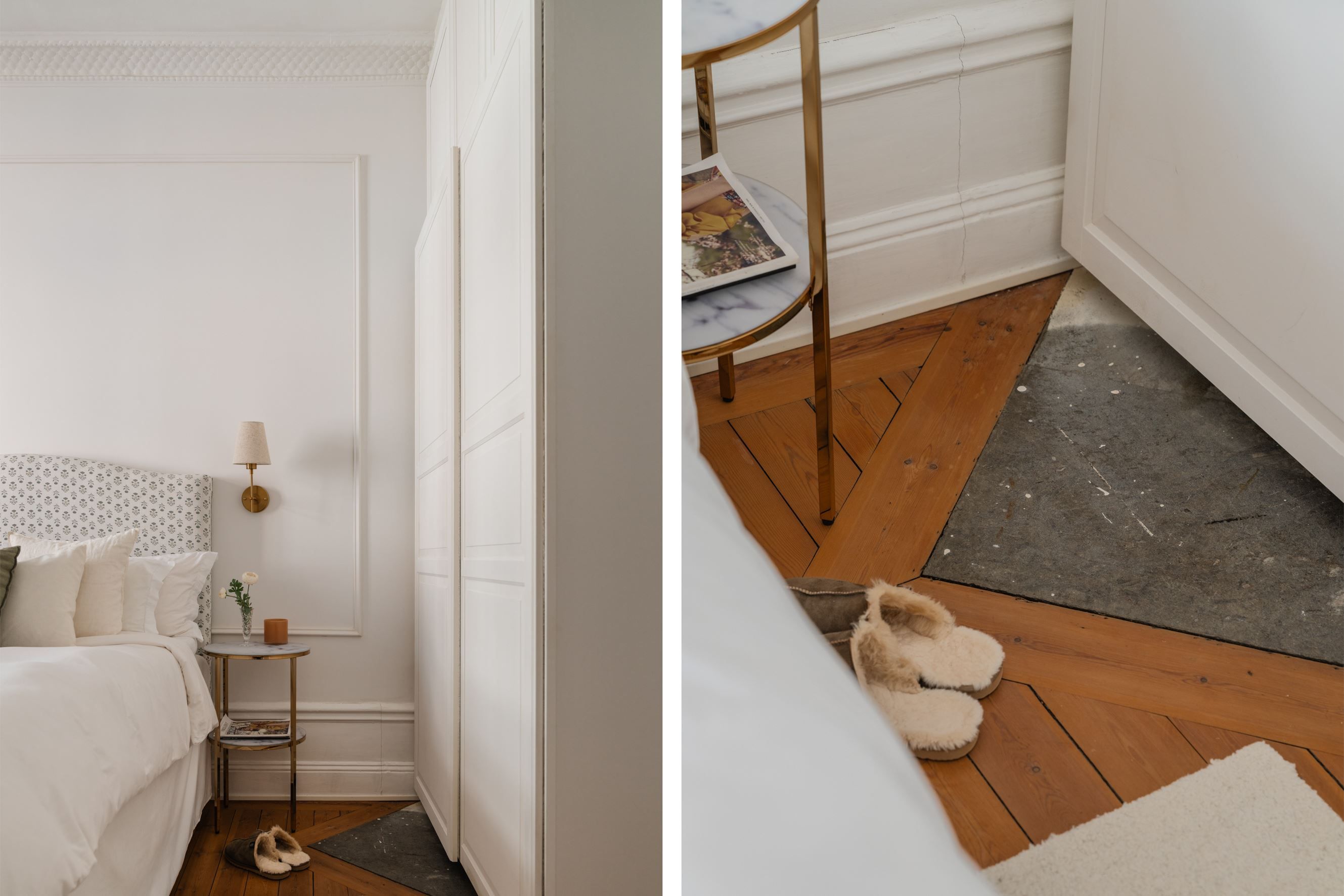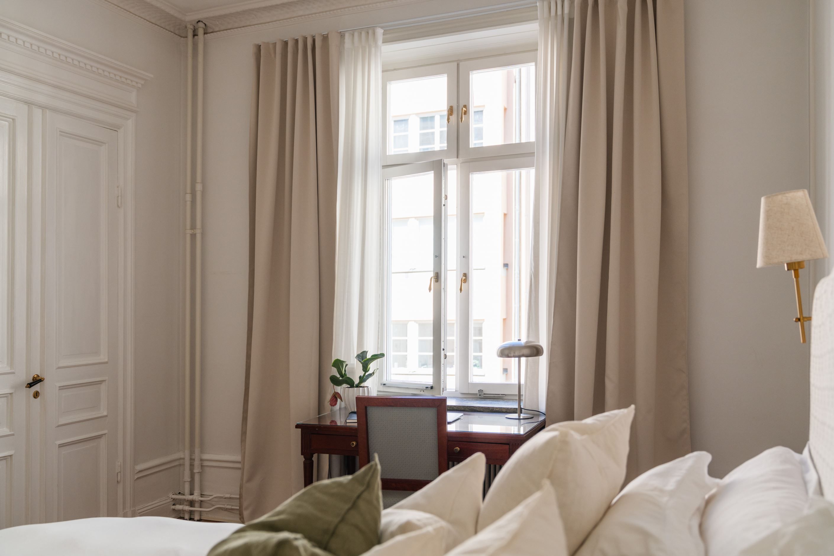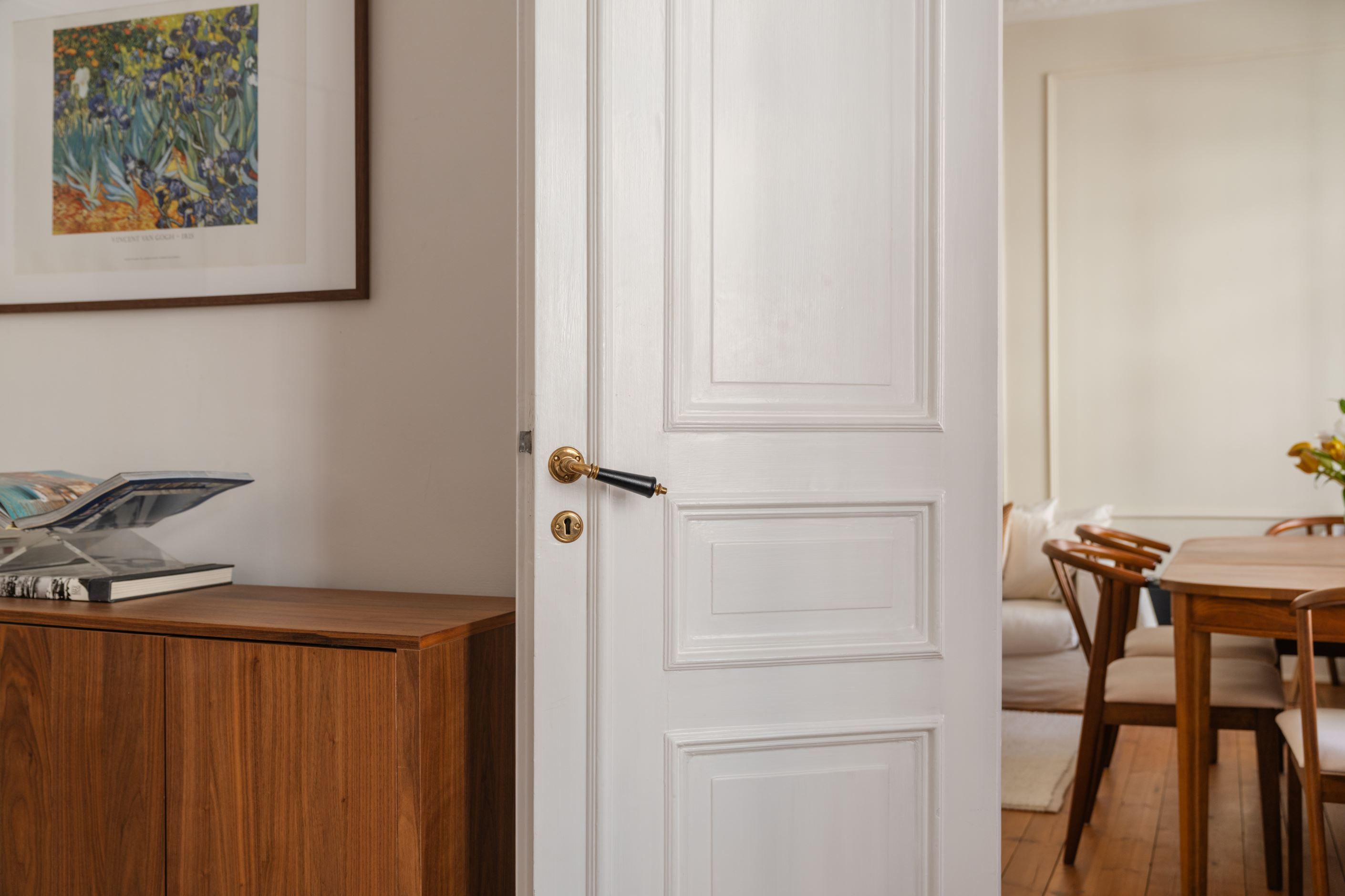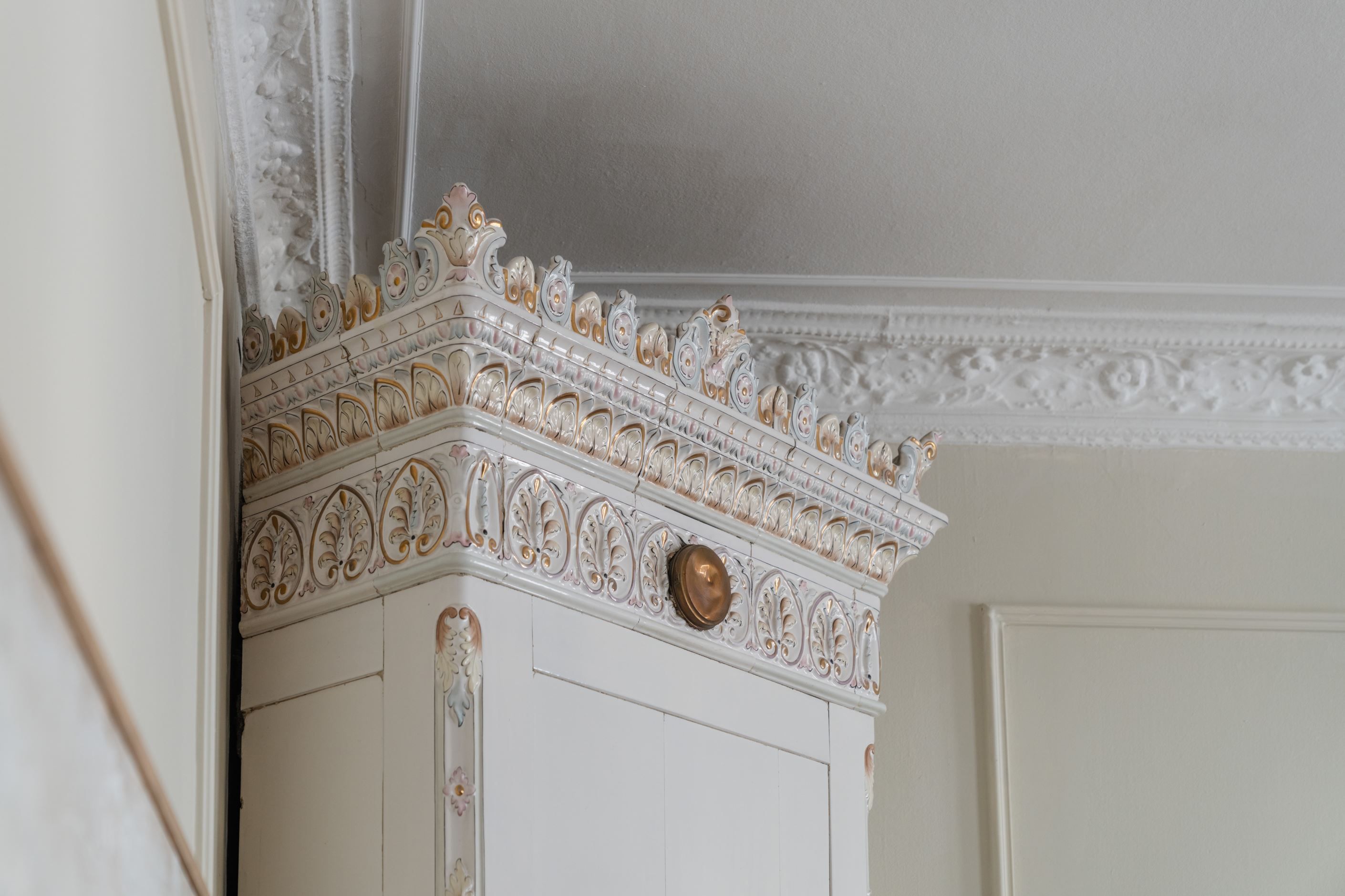 Den generösa takhöjden om ca 3,3 meter skapar en fantastisk rymd, medan vackra stuckaturer, genomgående furutiljor och tidstypiska detaljer ger bostaden en elegant och inbjudande karaktär. De höga fönstren ligger vackert i fil och släpper in ett rikligt ljusflöde som förstärker den luftiga känslan.