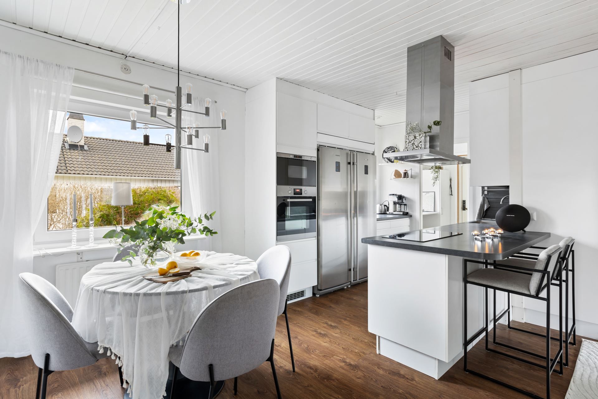 Från vardagsrummet når du en inglasad altan som förlänger säsongen och skapar en perfekt plats för frukostar i solen eller middagar under stjärnhimlen. Från ett av sovrummen leder en dörr ut till husets uteplats, där du enkelt kan smita ut med morgonkaffet eller bara njuta av lugnet i trädgården.