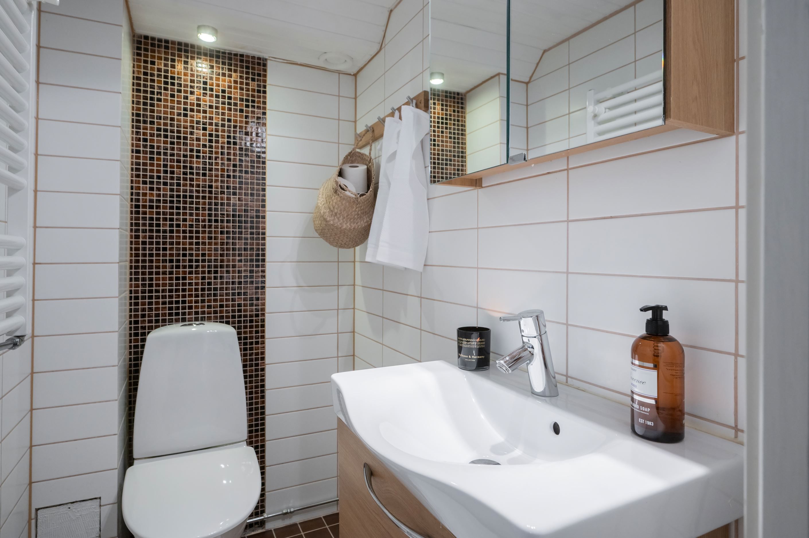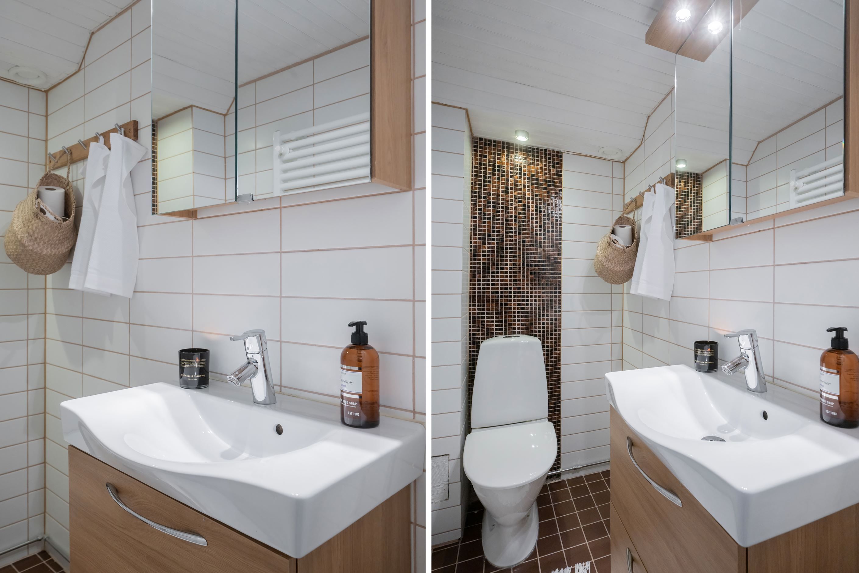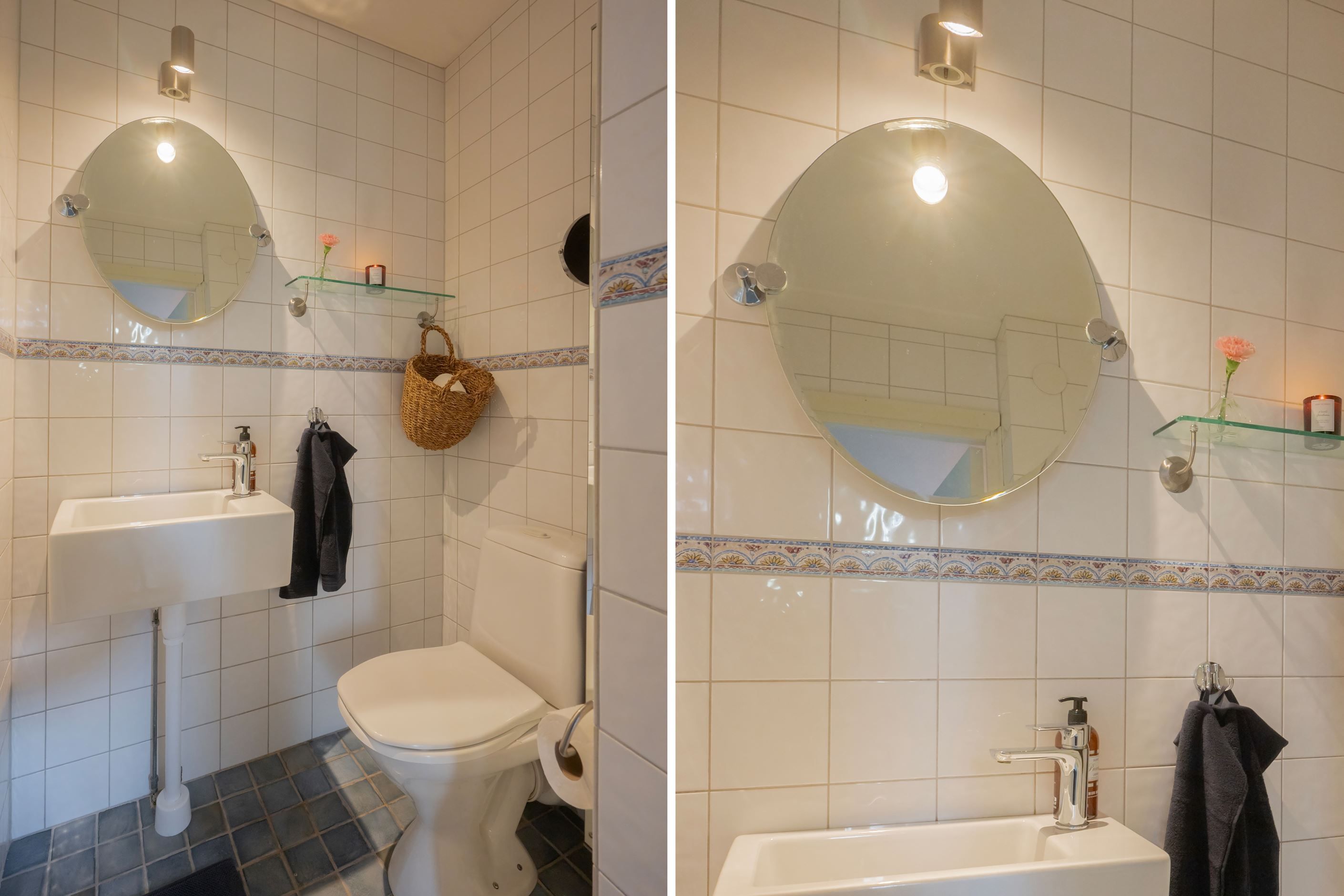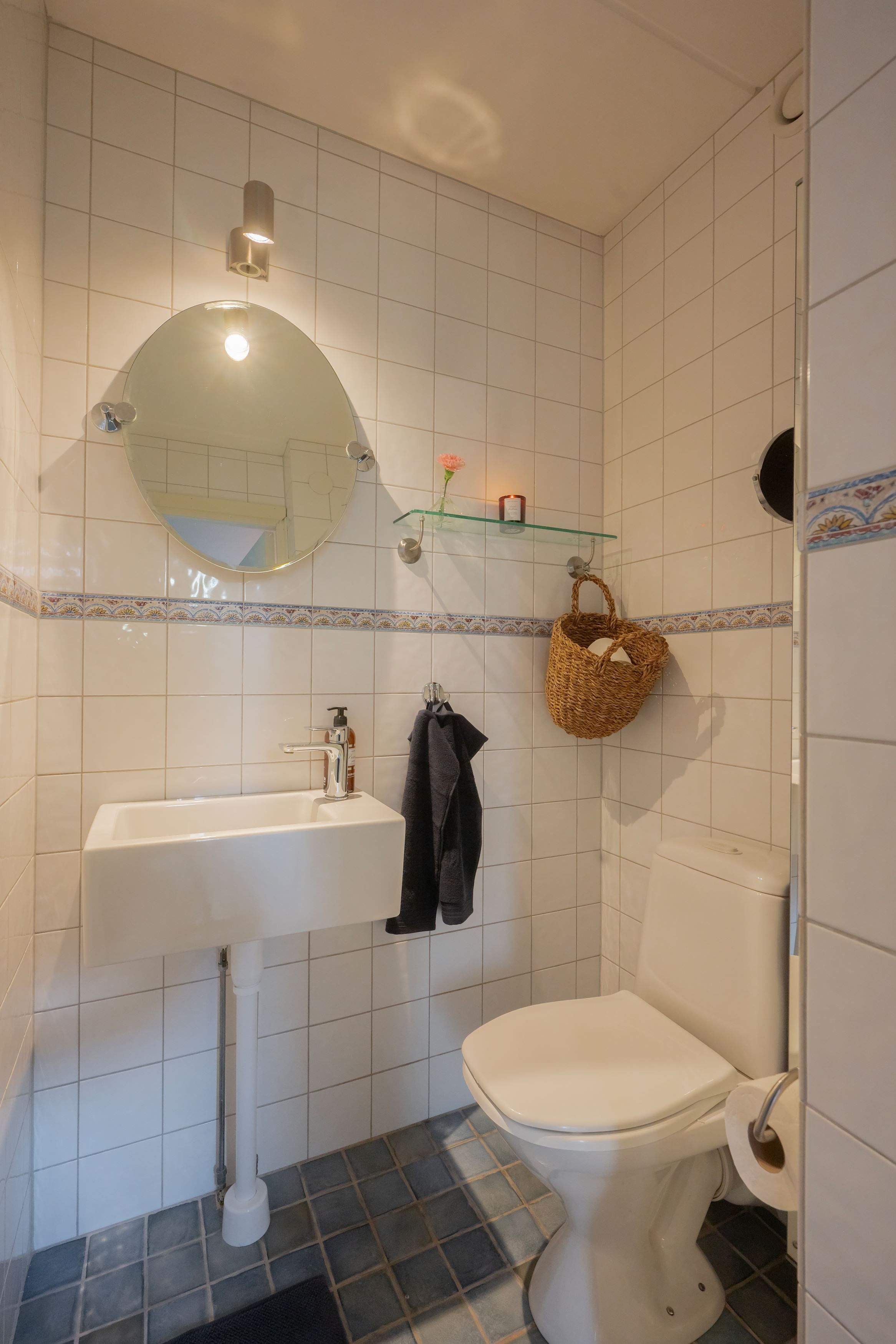 -Ett stilrent badrum med golvvärme, två separata WC samt en separat dusch