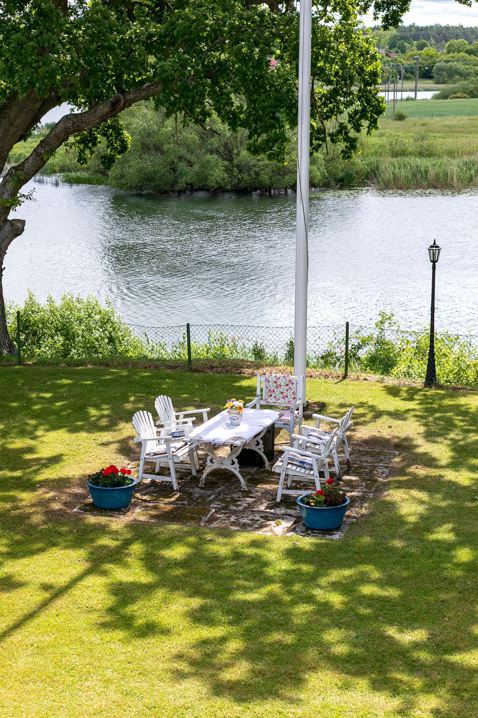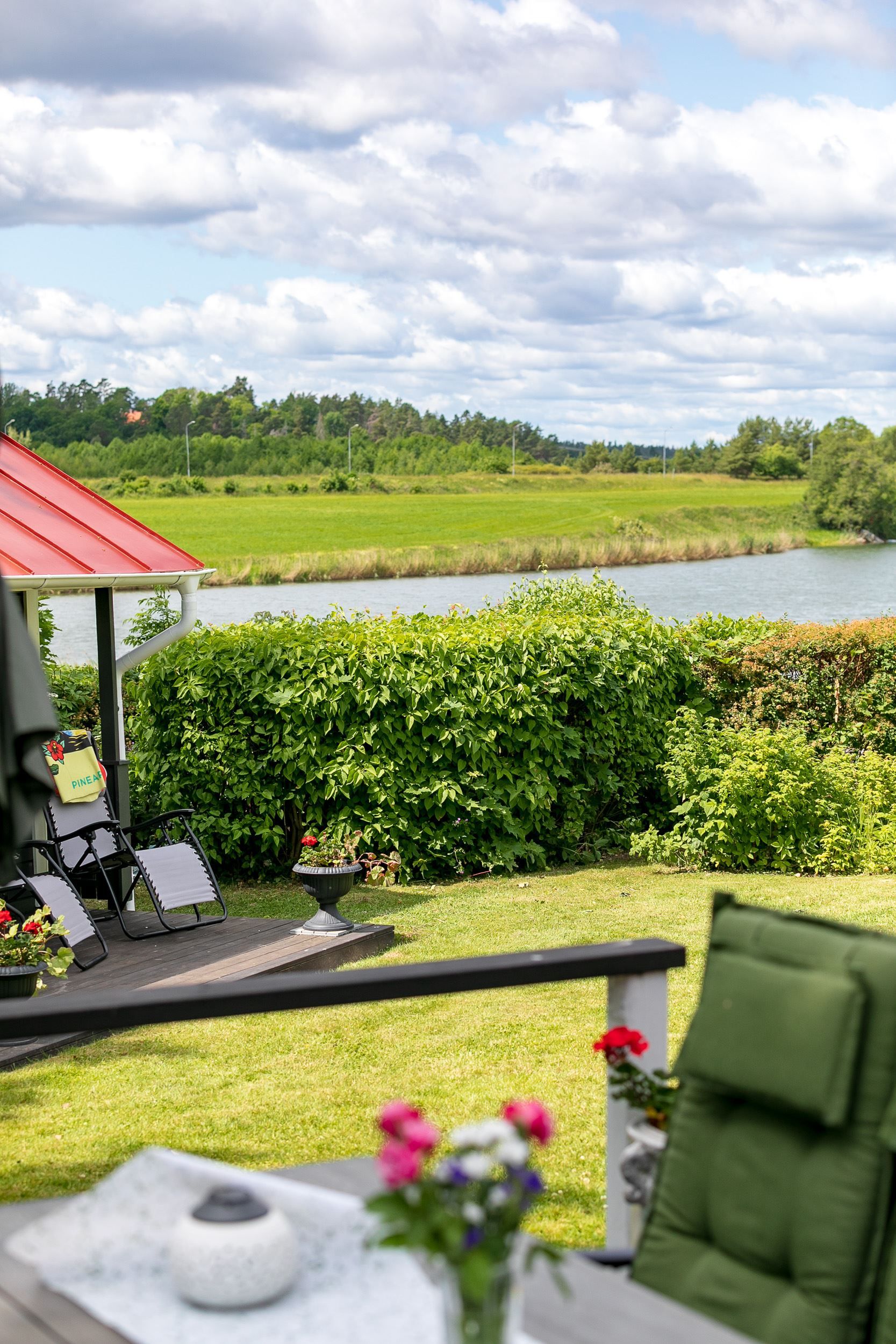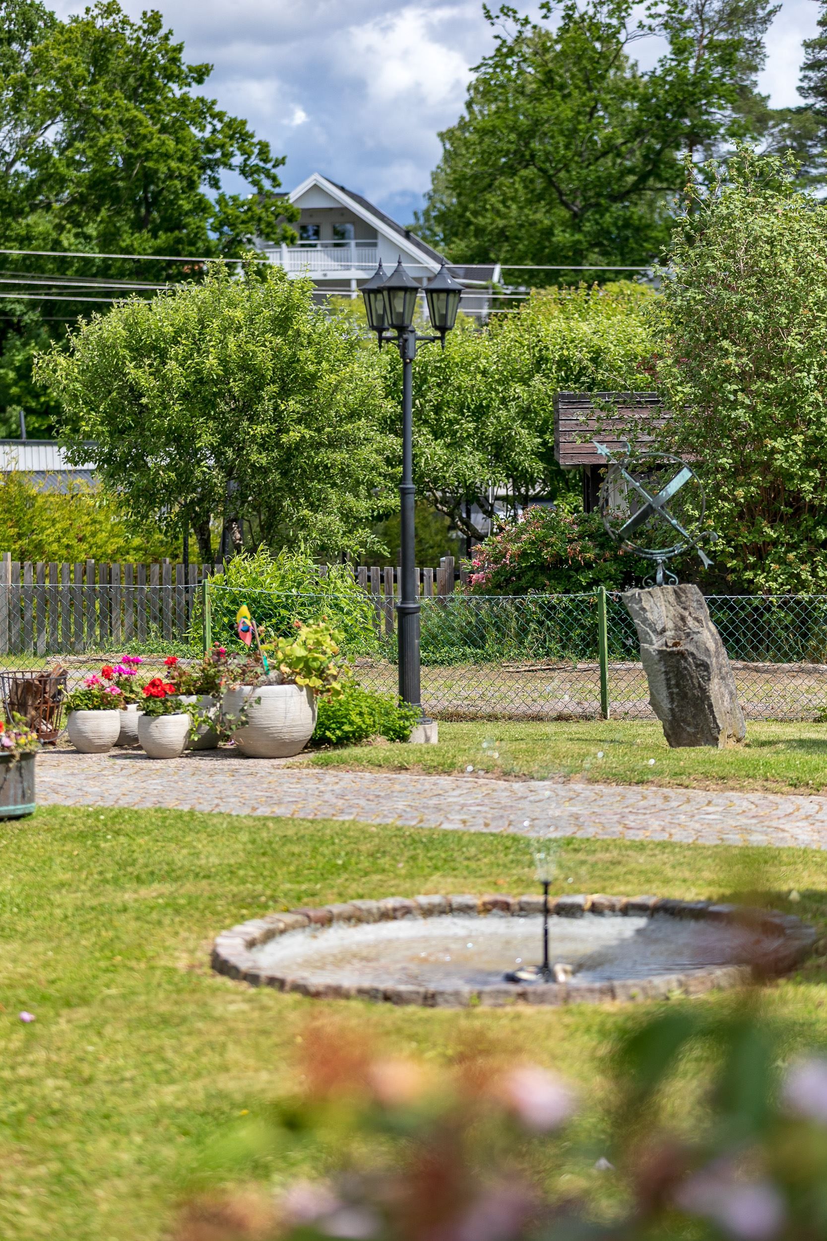 Den charmiga trädgården ramar in huset med vackra stenlagda gångar, fruktträd och prydliga planteringar. Här finns flera uteplatser för alla dygnets timmar – från morgonkaffe på altanen till sommarkvällar i badtunnan eller vid den egna bryggan.