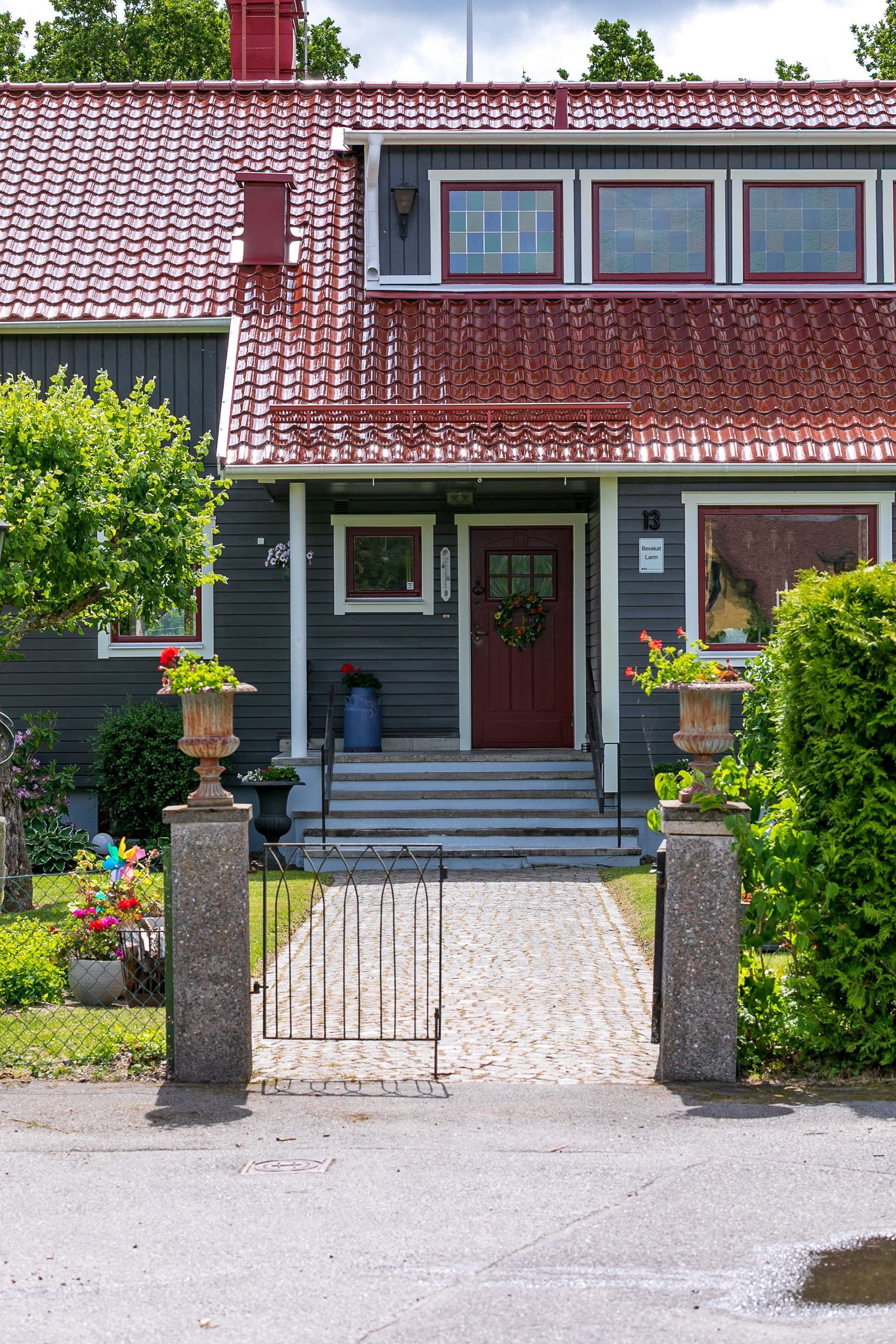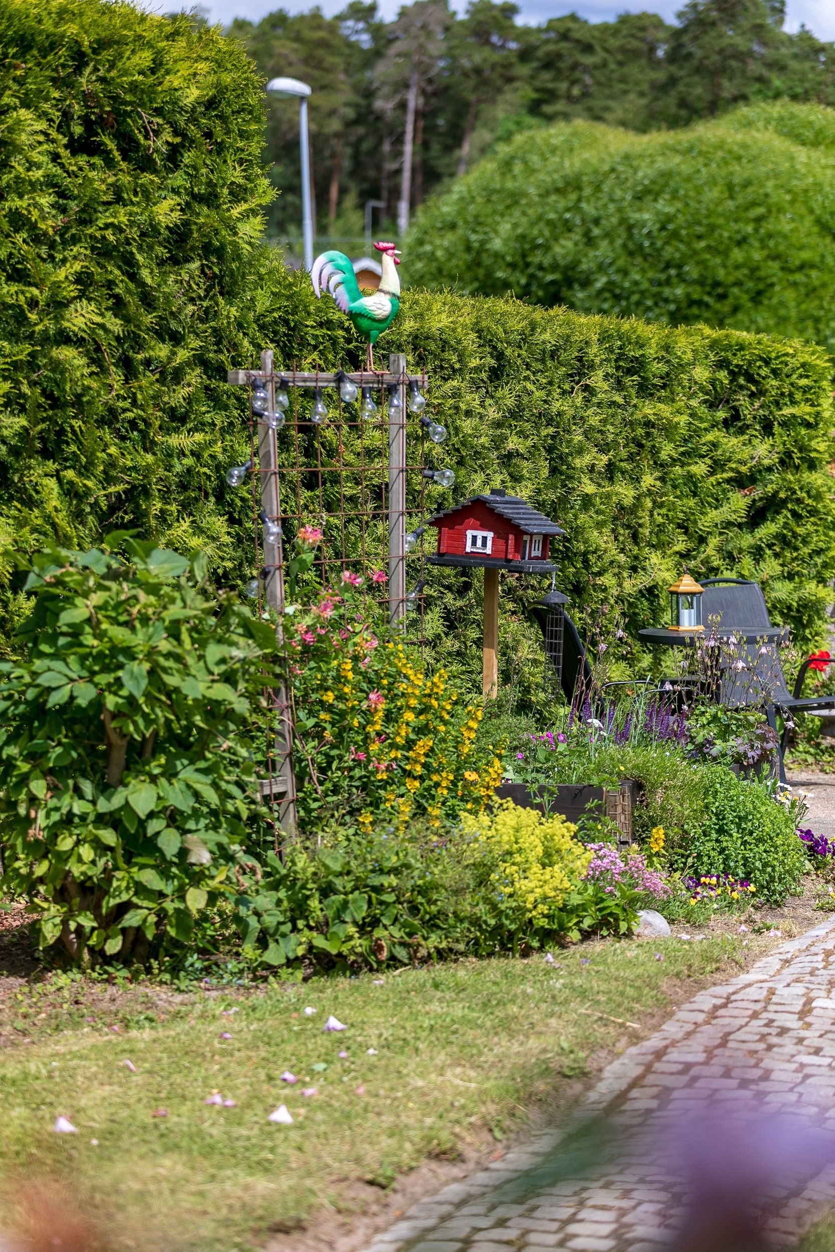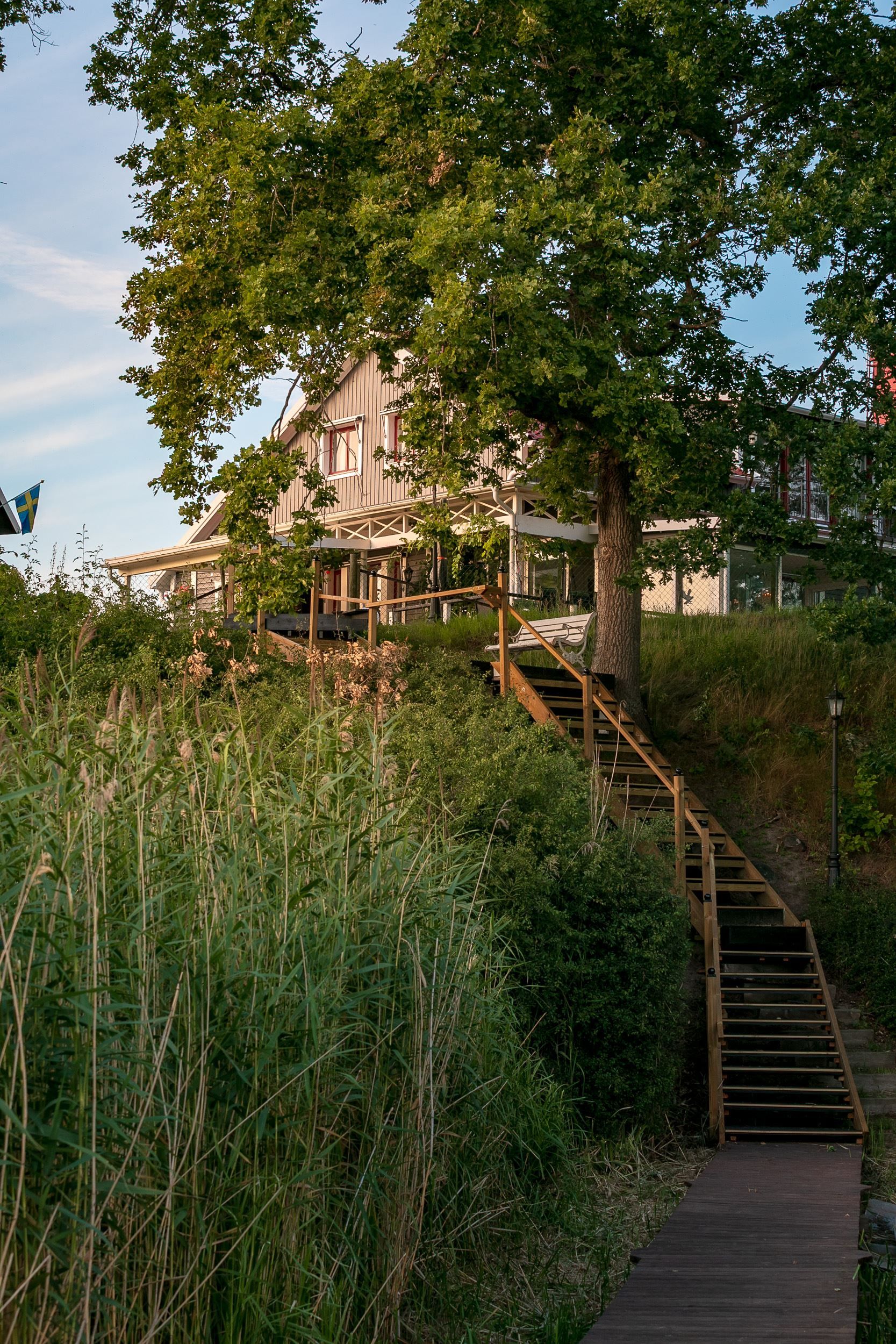 Den charmiga trädgården ramar in huset med vackra stenlagda gångar, fruktträd och prydliga planteringar. Här finns flera uteplatser för alla dygnets timmar – från morgonkaffe på altanen till sommarkvällar i badtunnan eller vid den egna bryggan.