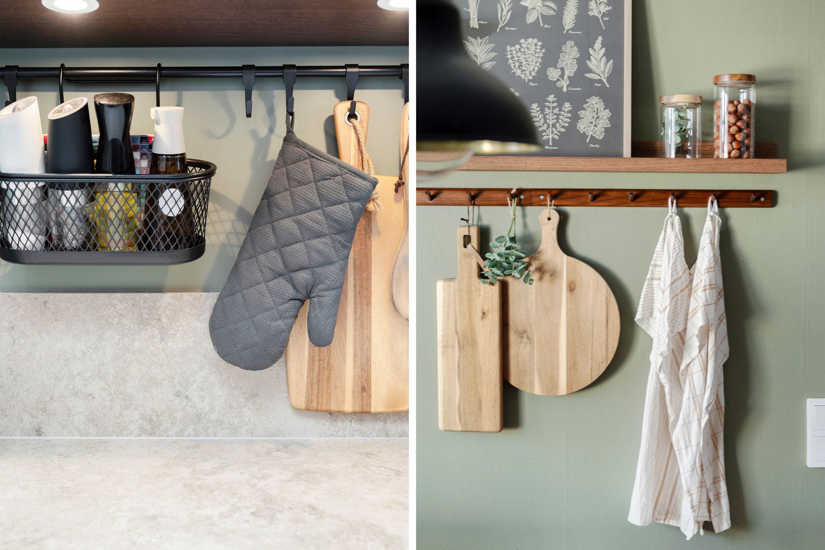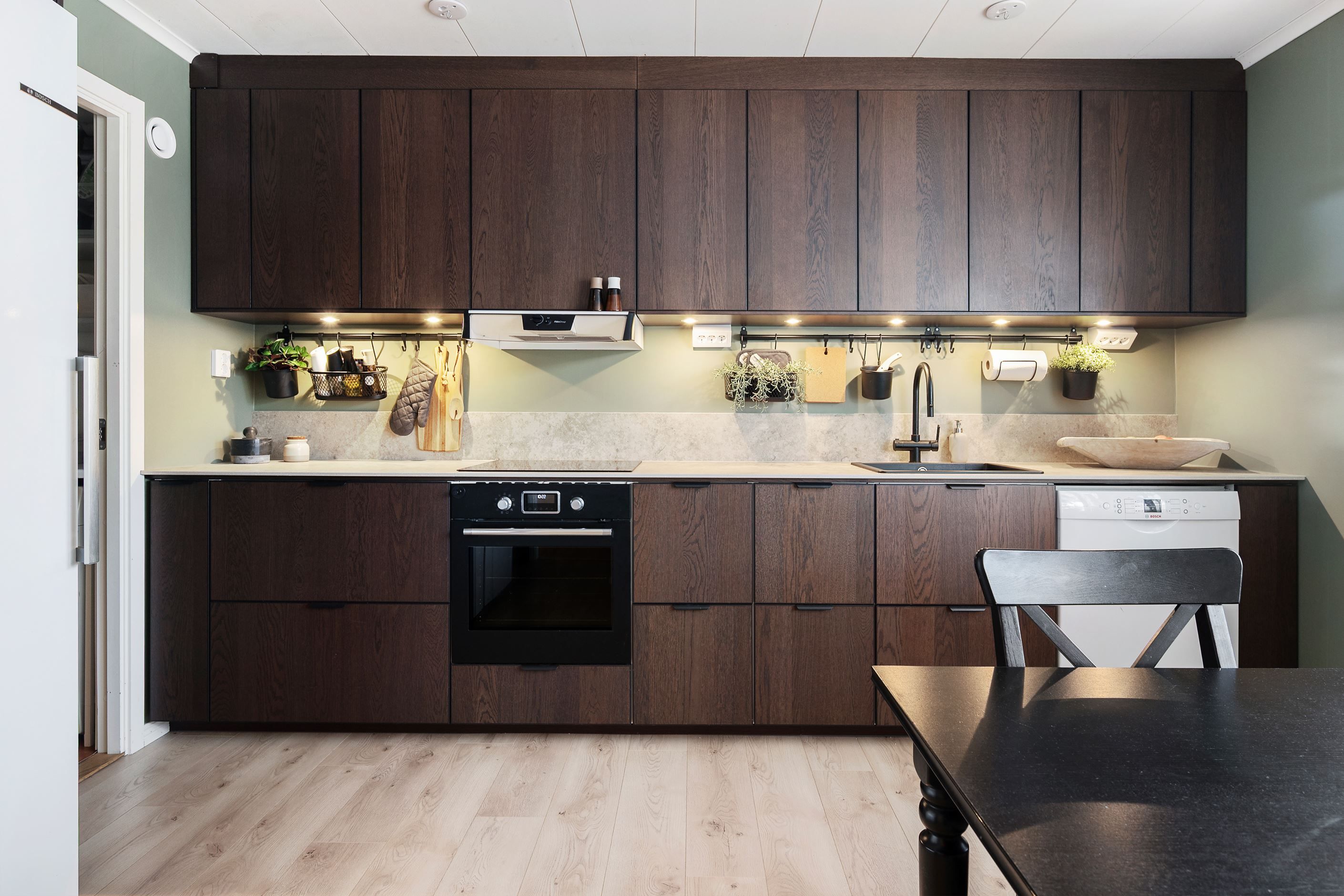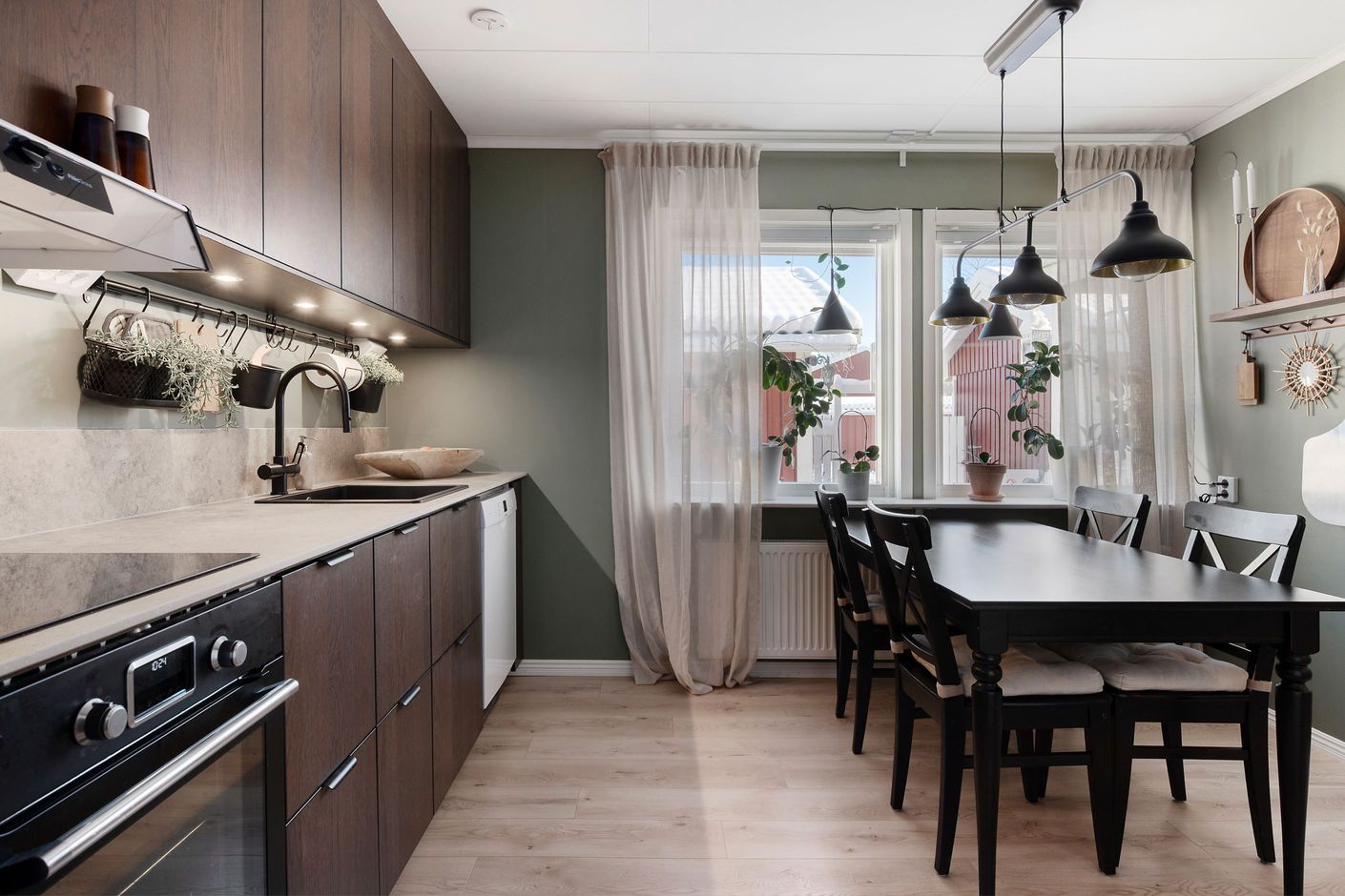 Det nyrenoverade köket är hemmets självklara samlingspunkt – modernt, funktionellt och smakfullt utformat med goda arbetsytor och förvaring. Dom stilenliga köksskåpen i mörk träimitation och den ljust grå stenskivan skapar en vacker kontrakt tillsammans med dom svarta, minimalistiska beslagen.