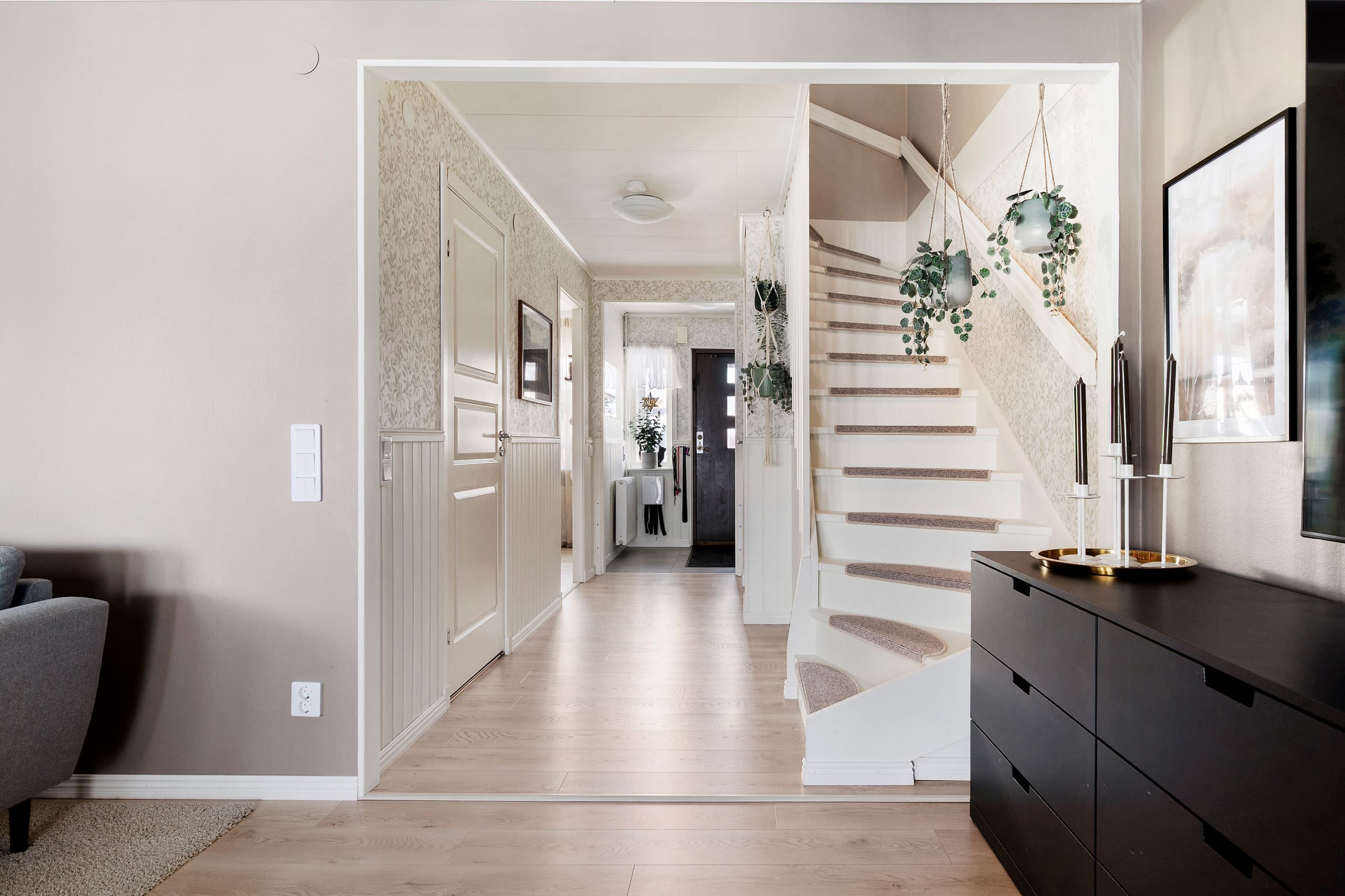Entrén välkomnar med en nyrenoverad hall med behaglig golvvärme och platsbyggda garderober som erbjuder generös, snygg och smart förvaring. Redan här infinner sig känslan av kvalitet och omtanke i varje detalj.