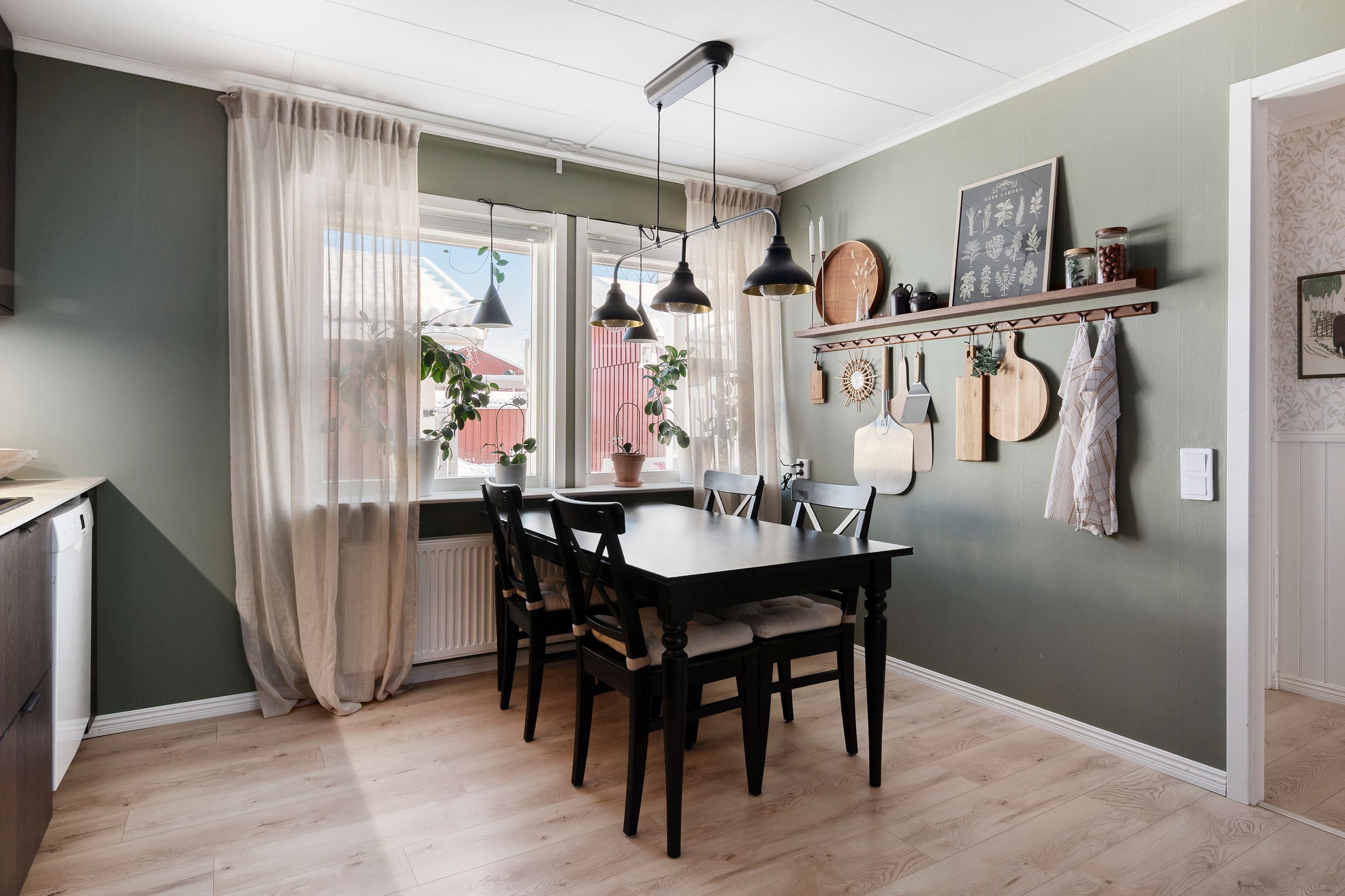 Här finns plats för både vardagsmiddagar och trevliga sammankomster med familj och vänner invid det stora fönsterpartiet.