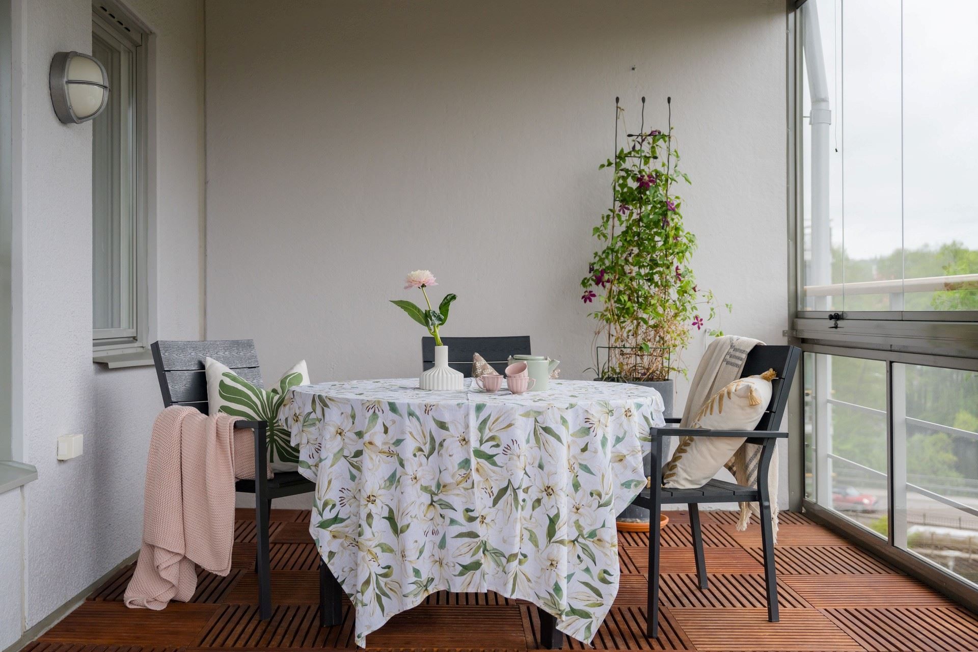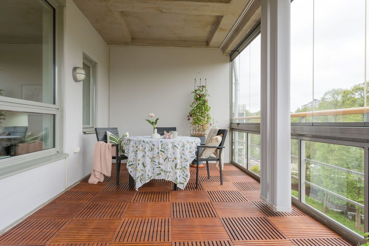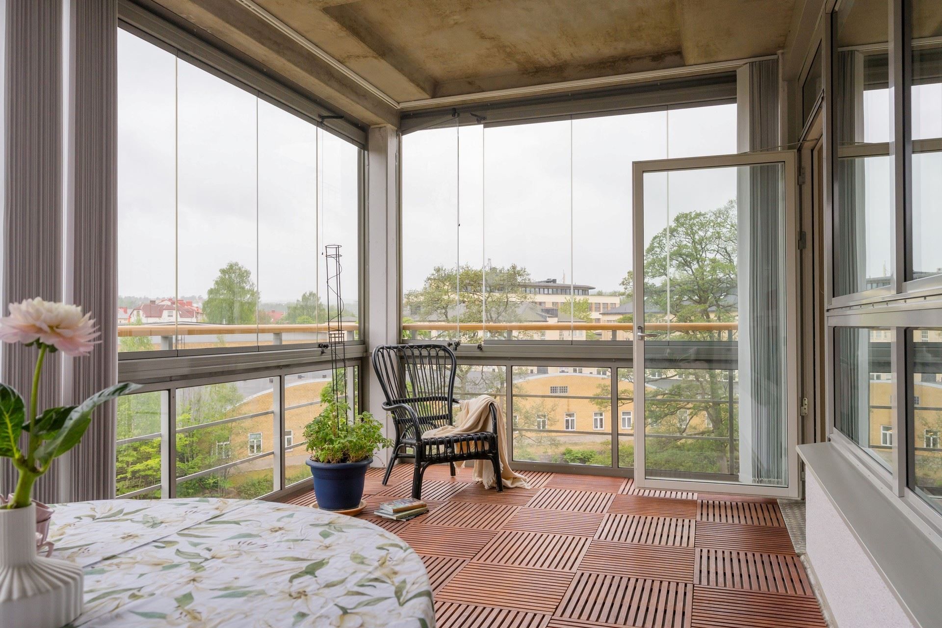 Stor inglasad balkong i insynsskyddat läge och härlig eftermiddagssol