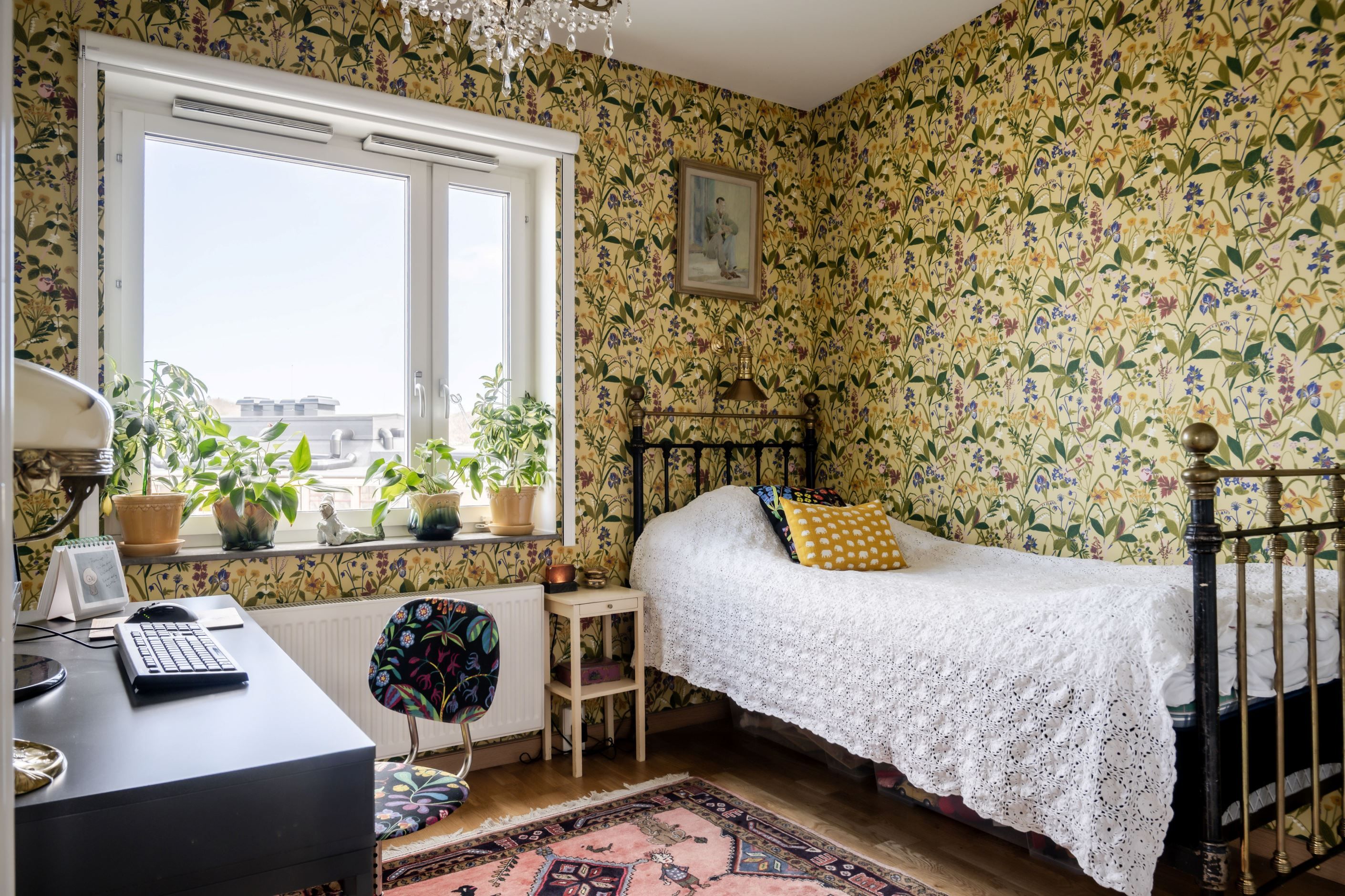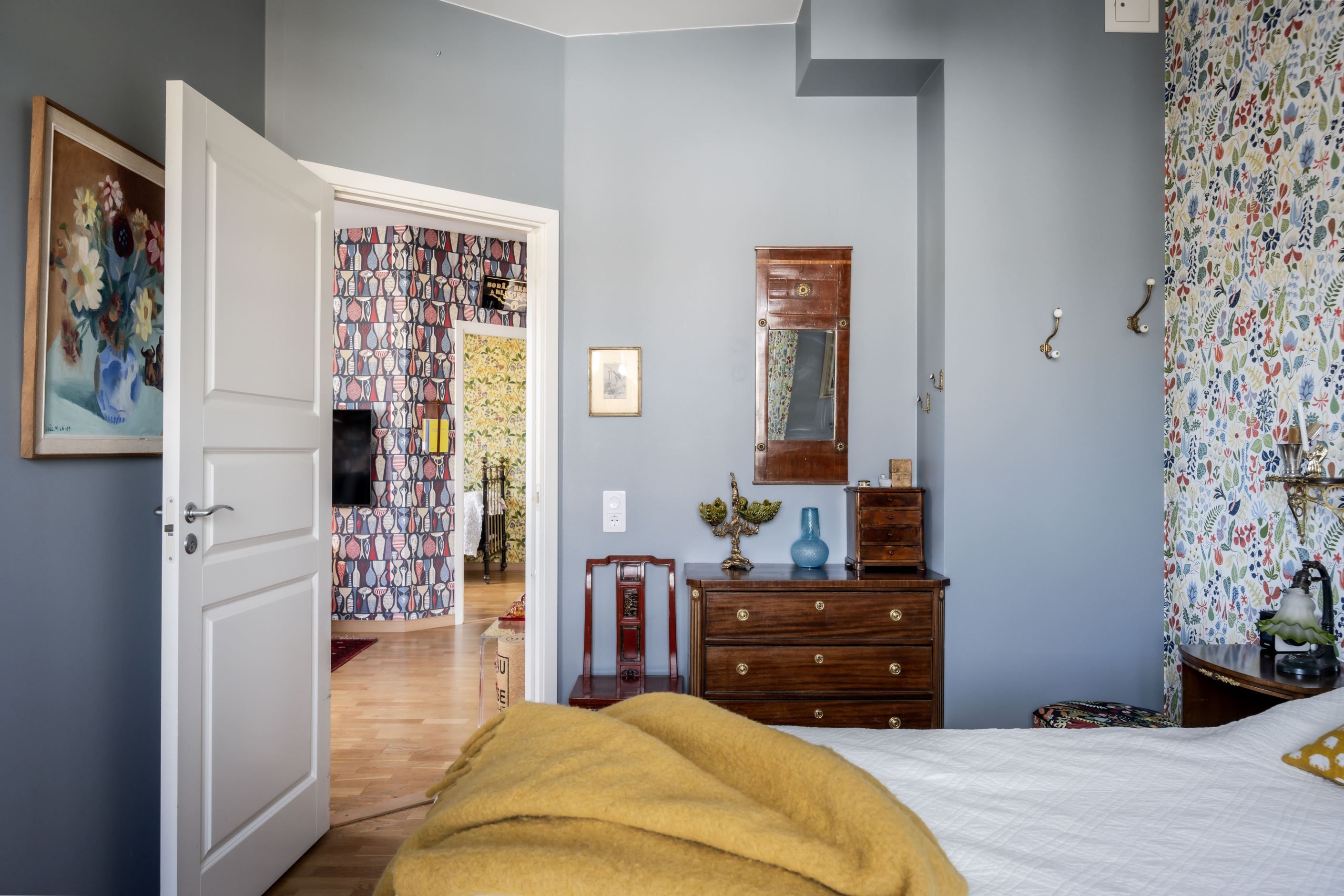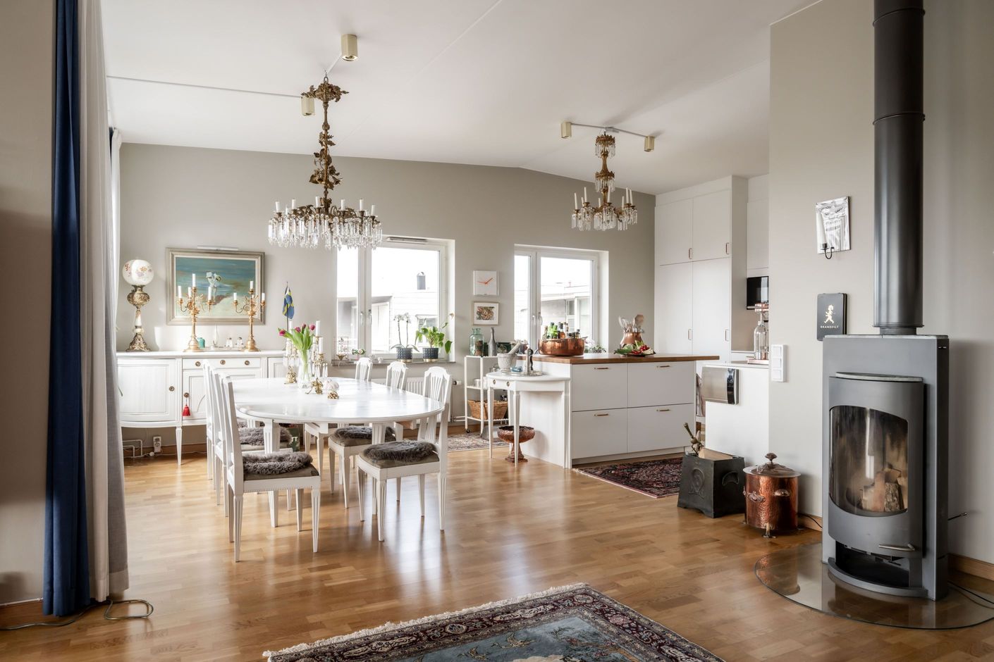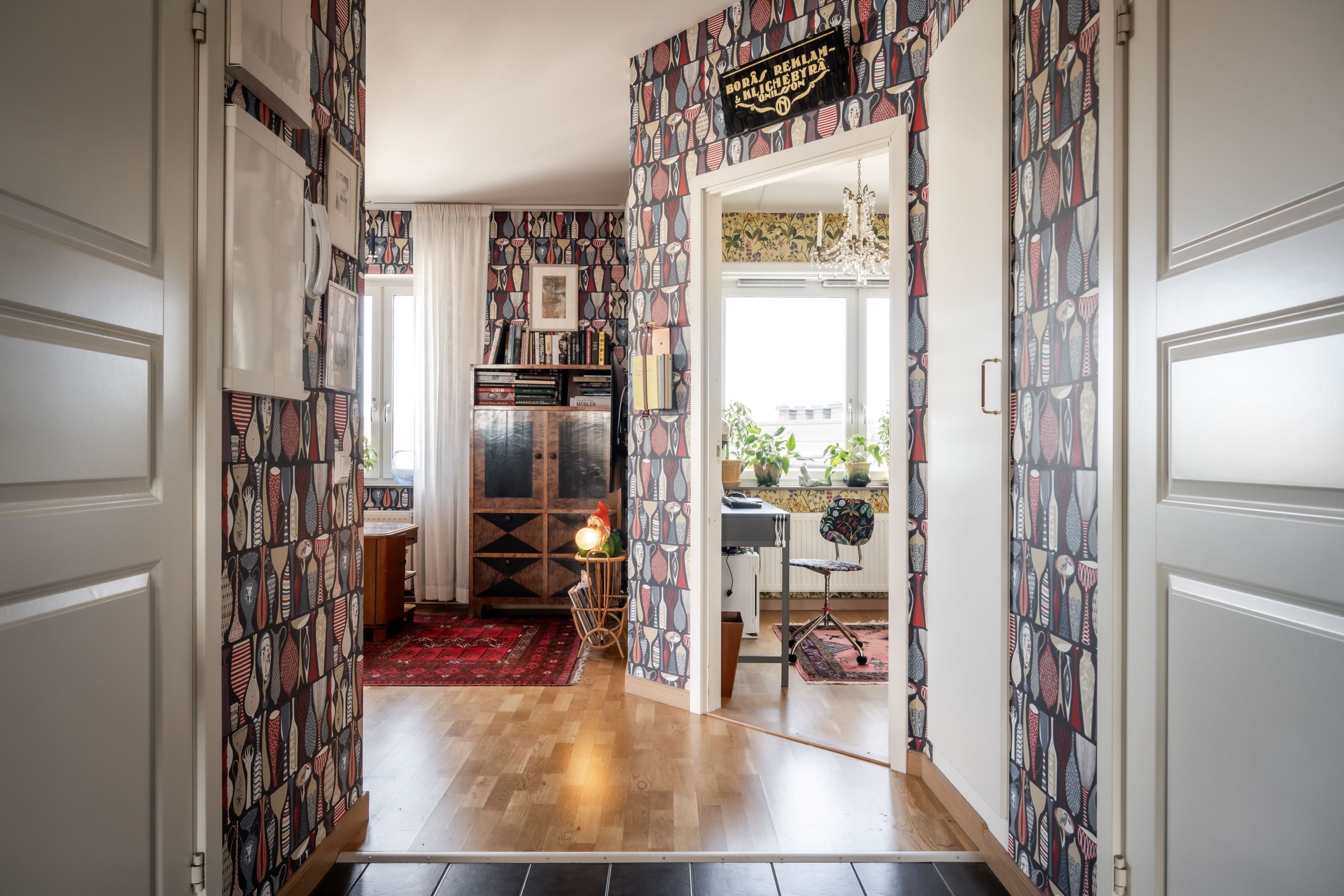 Lägenheten har en naturlig öppen planlösning, högt i tak och stora fönsterpartier släpper in ljuset. Vardagsrum, matplats och kök flyter liksom ihop på ett sömlöst vis. Här är trevligt att umgås och här finns tillräckligt gott om plats för dukning till ett stort gäng gäster. Du har två rymliga sovrum, med möjlighet till ett tredje, en stor walk-in-closet, två badrum och en mysig braskamin. Ett färgglatt hem med tapeter med mönster från svenska designers som Stig Lindberg och Gocken Jobs. Bostaden upplevs tyst med extra isolerade fönster.