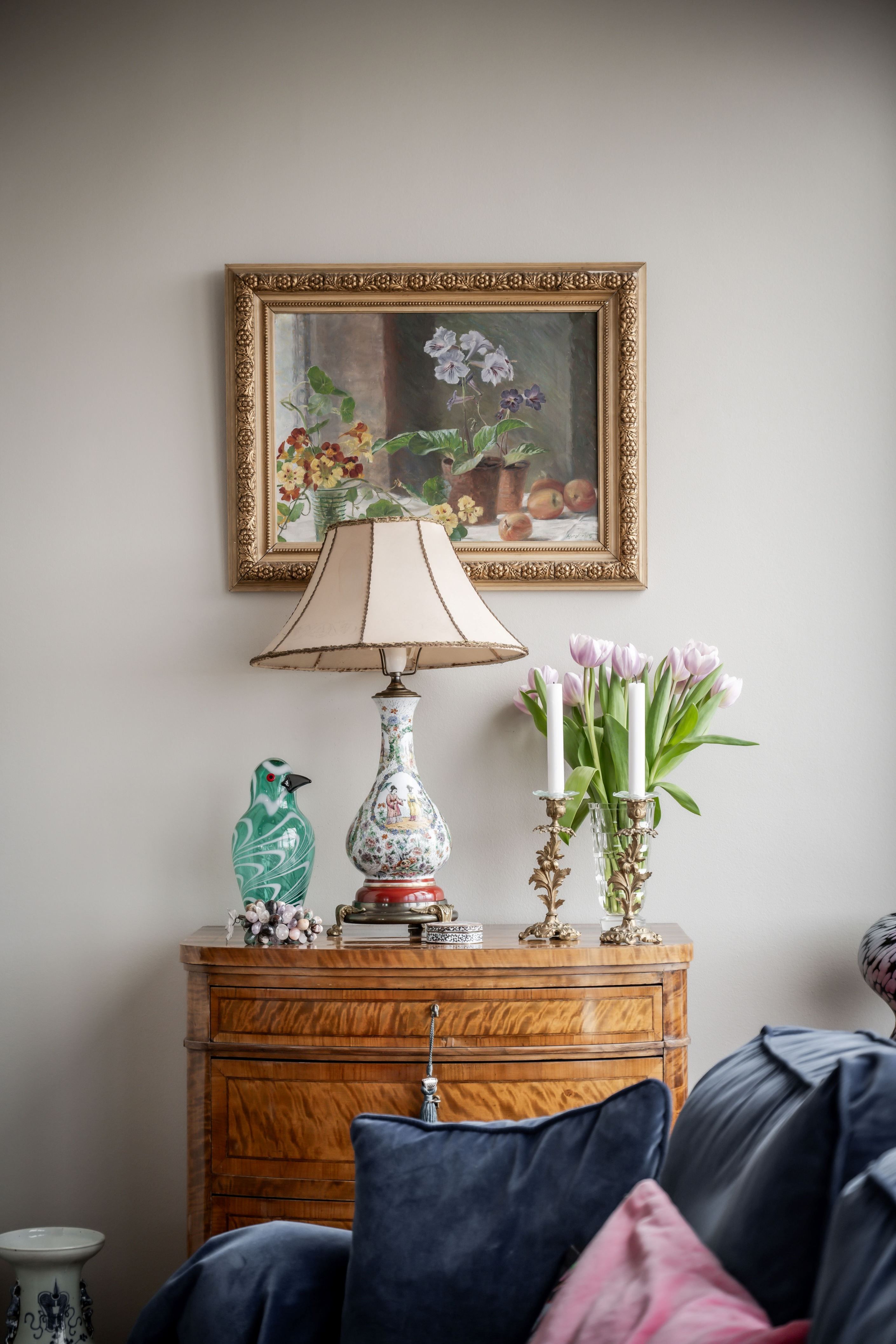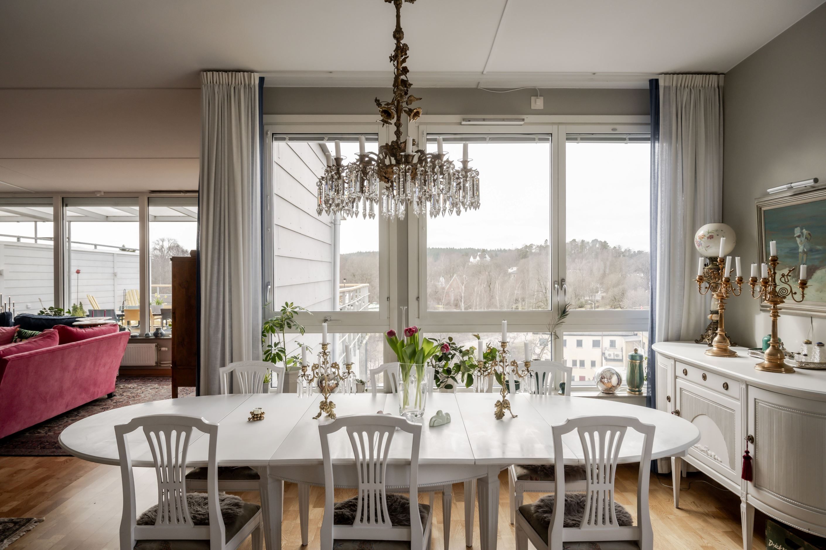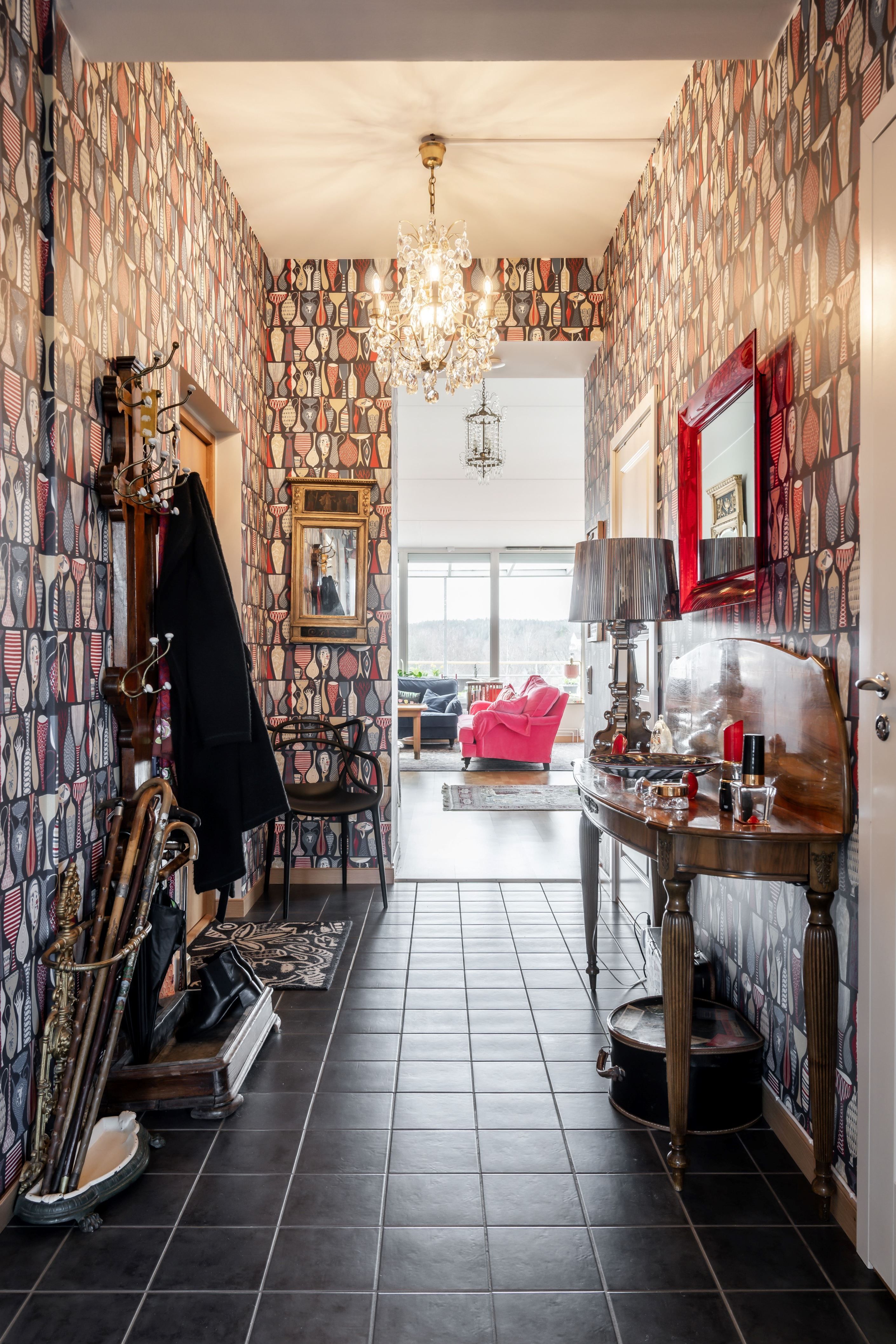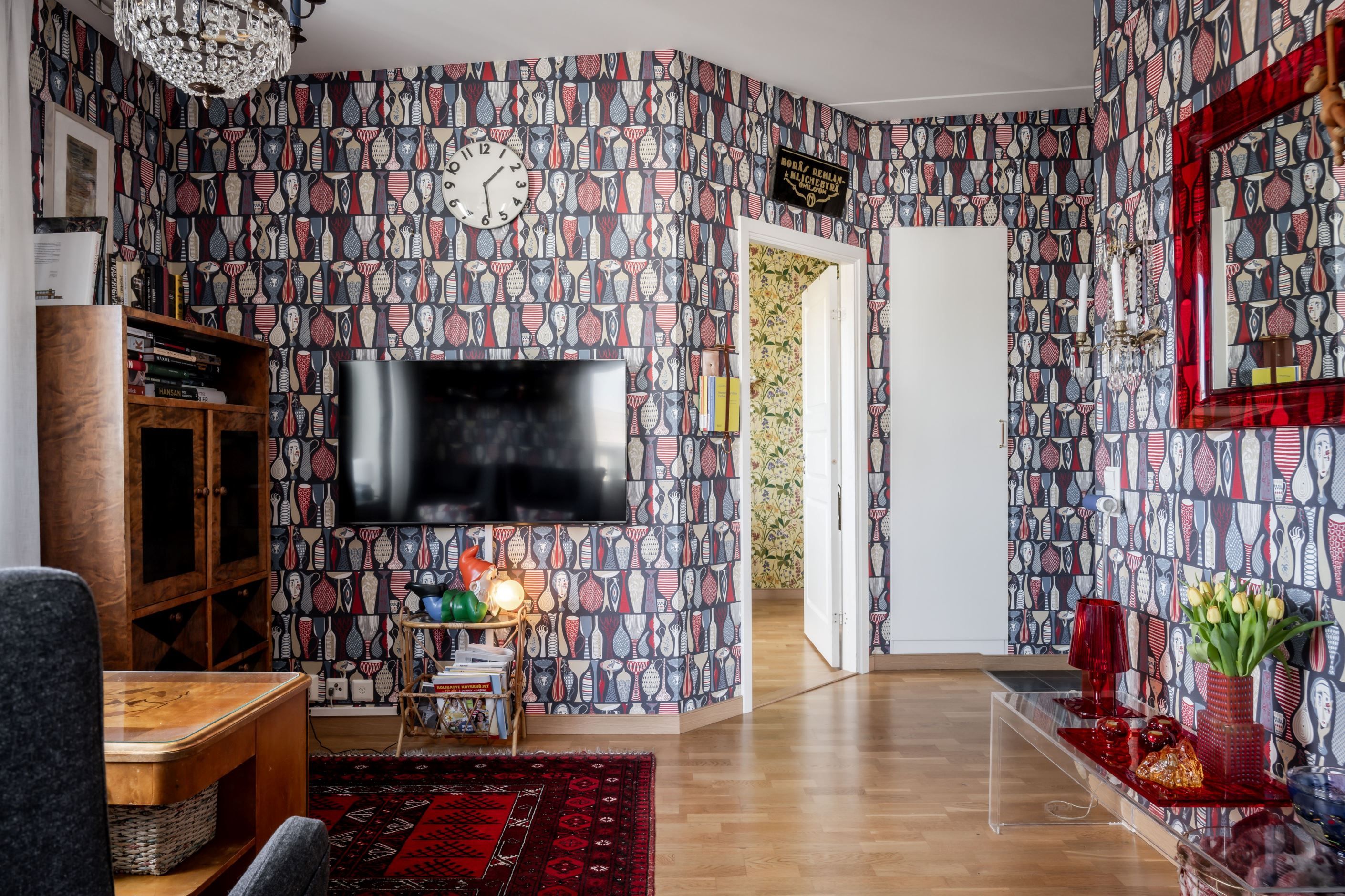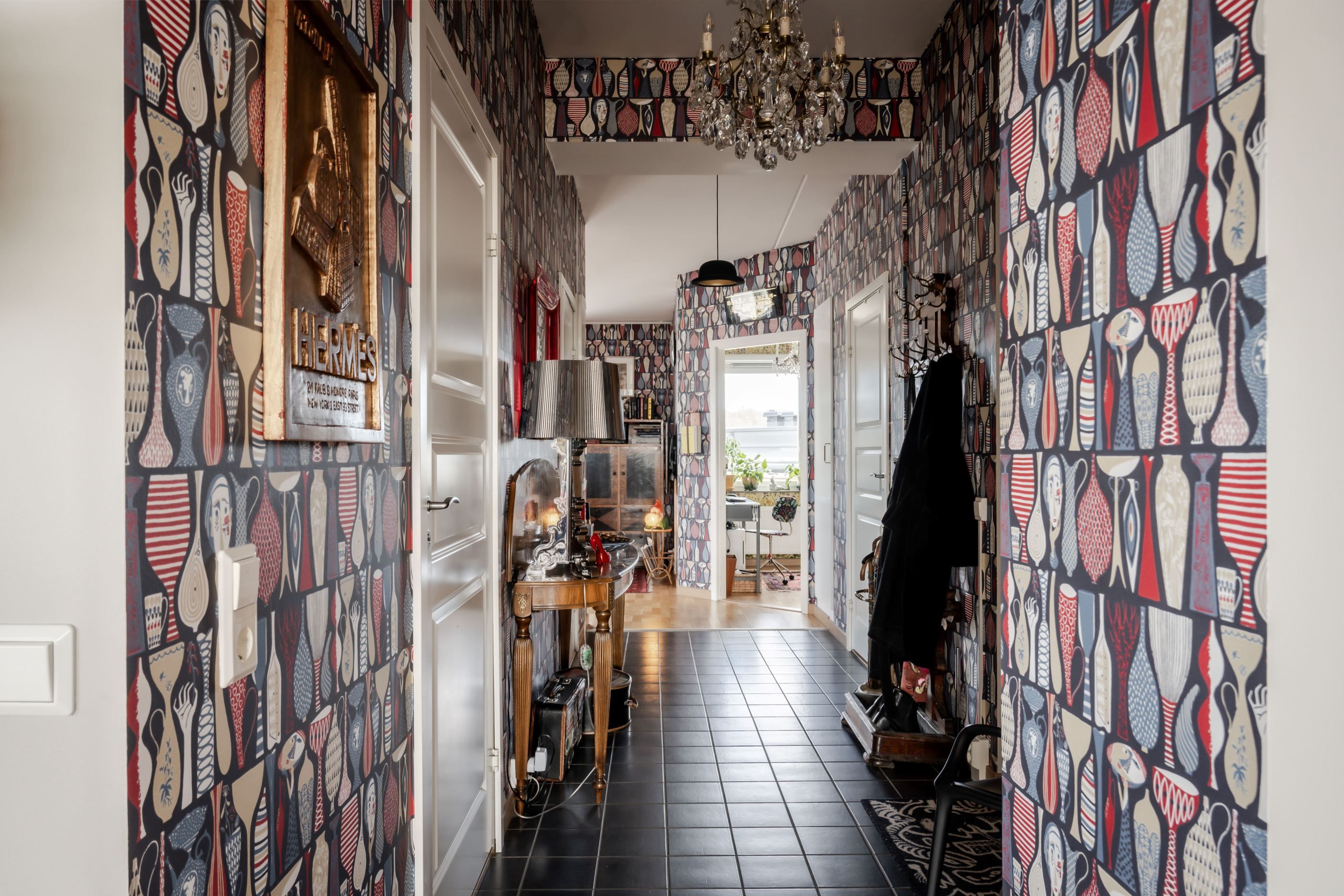 Lägenheten har en naturlig öppen planlösning, högt i tak och stora fönsterpartier släpper in ljuset. Vardagsrum, matplats och kök flyter liksom ihop på ett sömlöst vis. Här är trevligt att umgås och här finns tillräckligt gott om plats för dukning till ett stort gäng gäster. Du har två rymliga sovrum, med möjlighet till ett tredje, en stor walk-in-closet, två badrum och en mysig braskamin. Ett färgglatt hem med tapeter med mönster från svenska designers som Stig Lindberg och Gocken Jobs. Bostaden upplevs tyst med extra isolerade fönster.