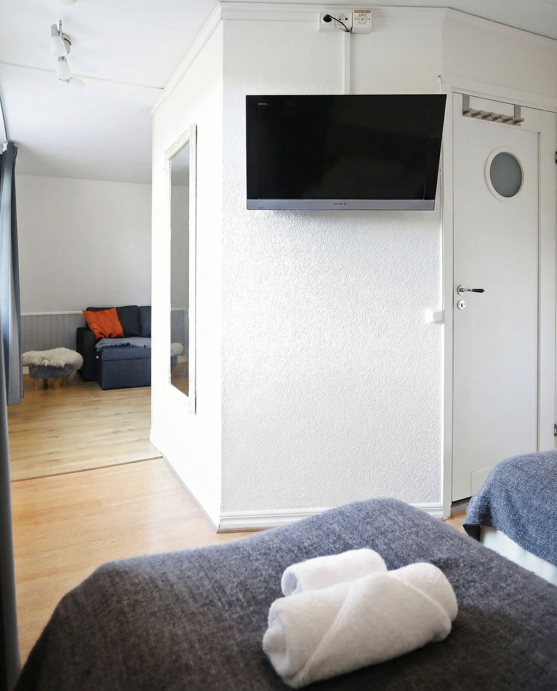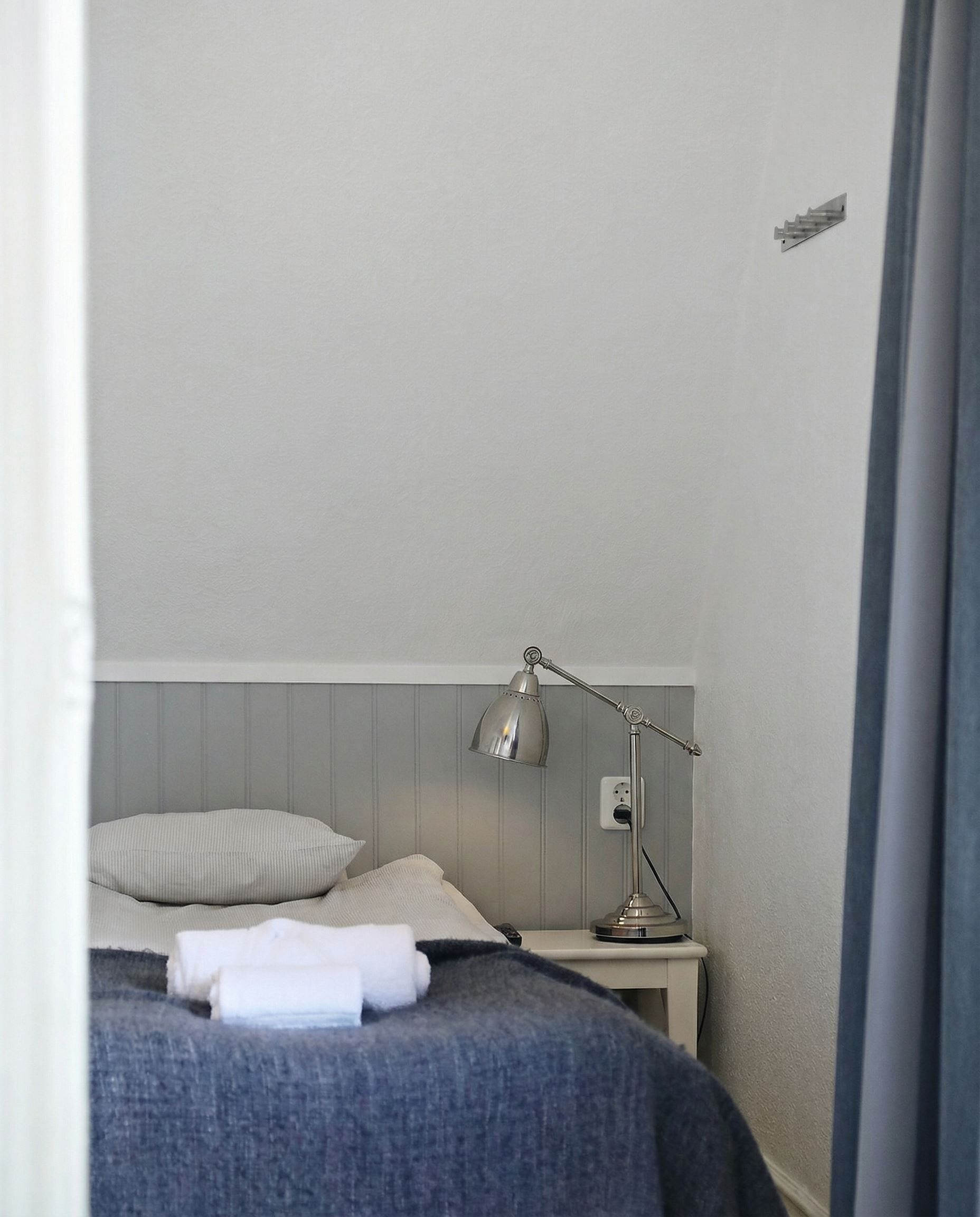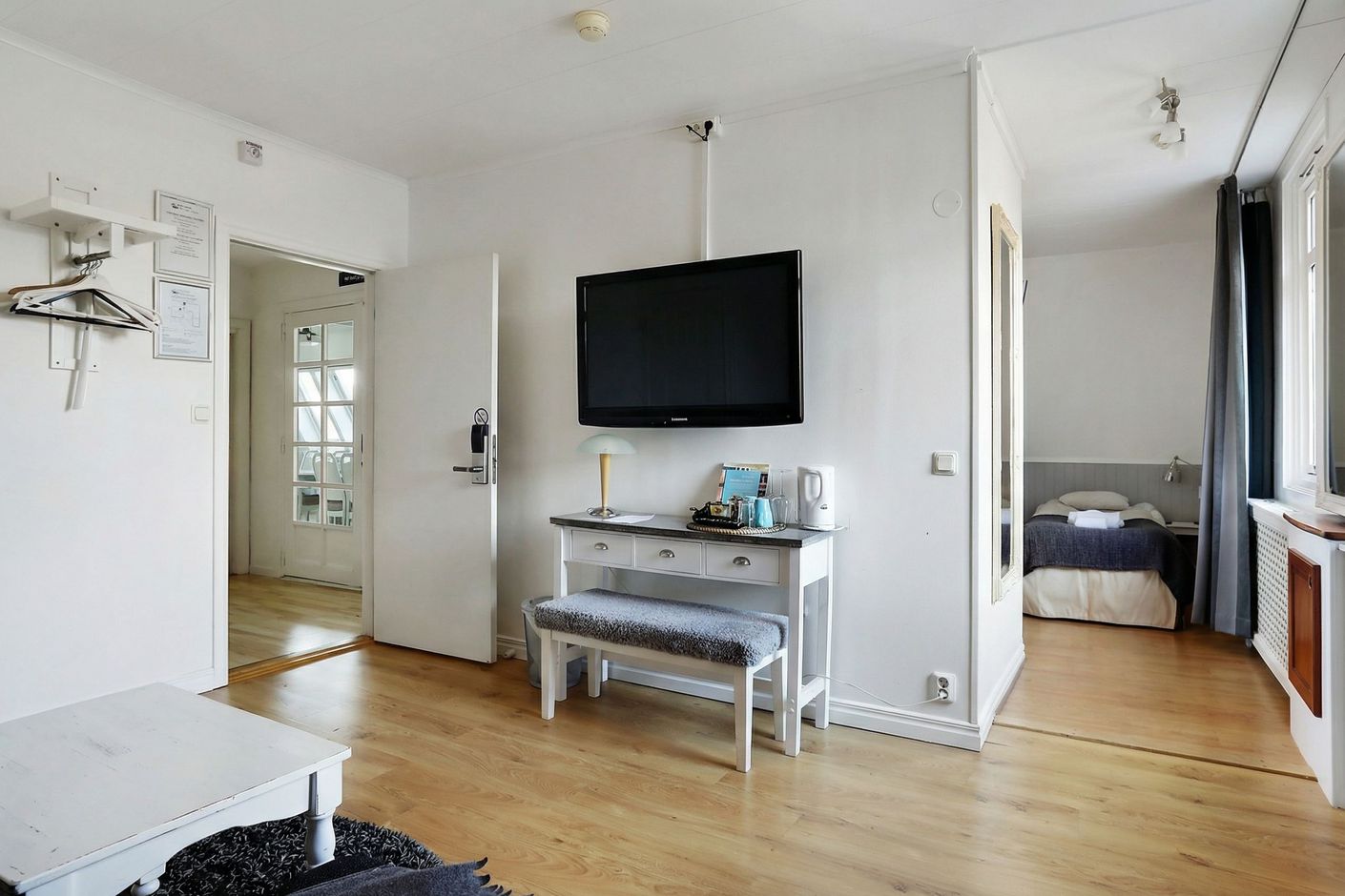 Här erbjuds ett av de större rummen på Tjörns Havspensionat, med en planlösning som ger en tydlig boendekänsla snarare än ett traditionellt hotellrum. Du välkomnas in i ett generöst allrum med bäddsoffa och plats för umgänge. De två fönstren ger ett fint ljusinsläpp och skapar en ljus och trivsam atmosfär.