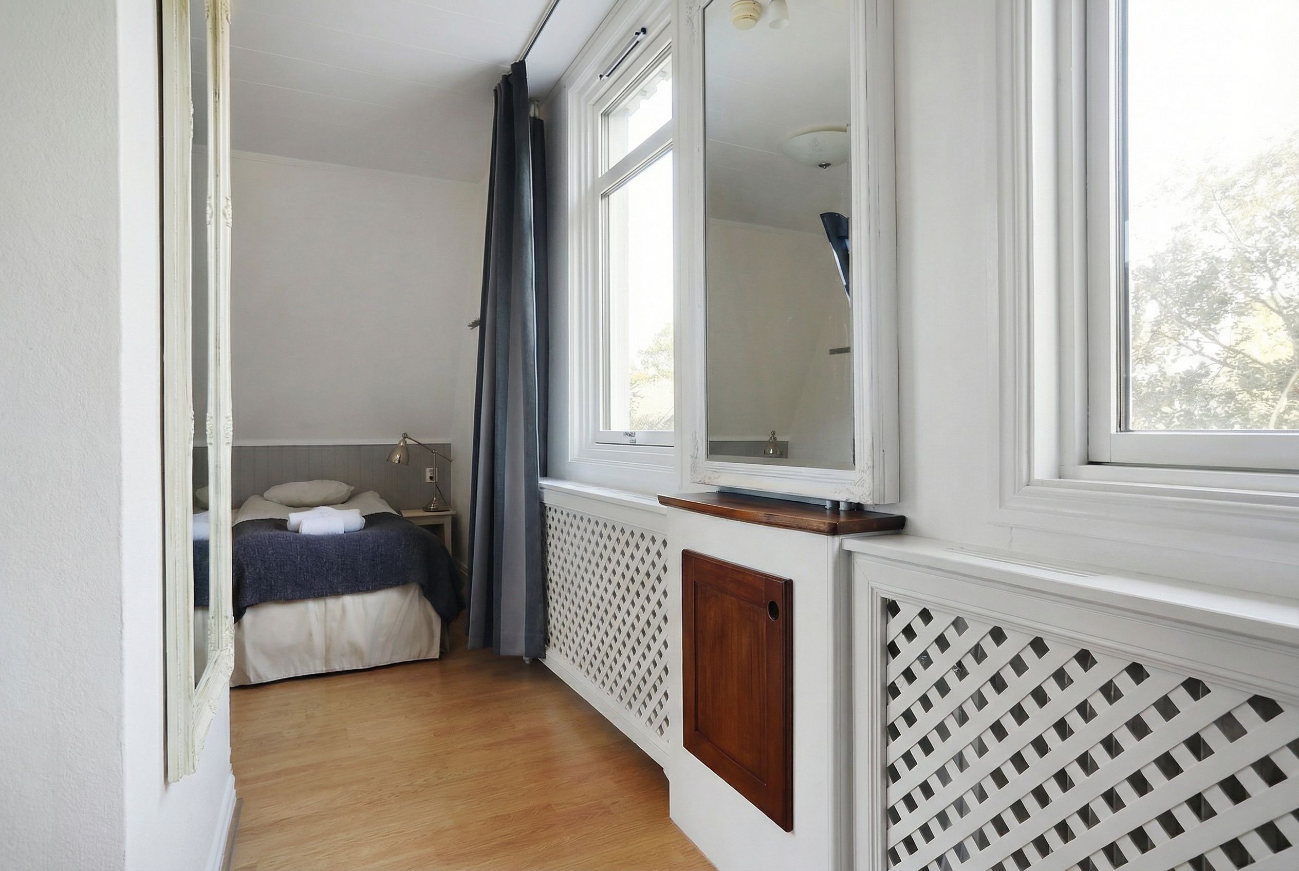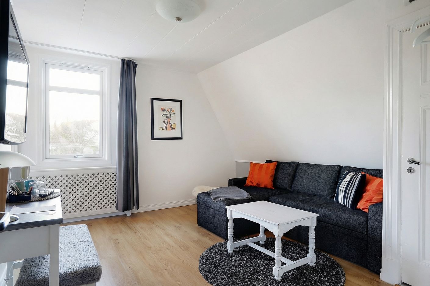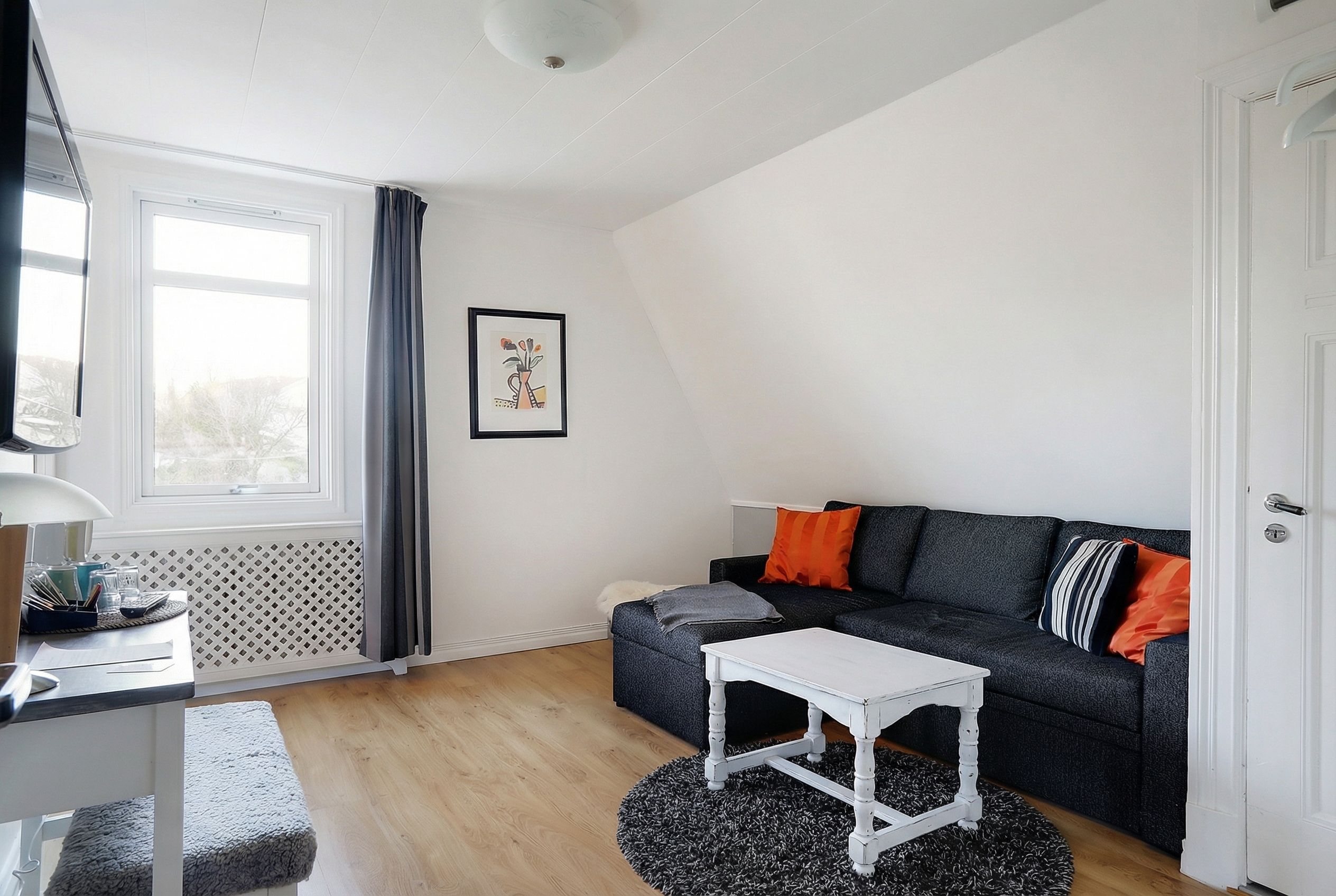 Här erbjuds ett av de större rummen på Tjörns Havspensionat, med en planlösning som ger en tydlig boendekänsla snarare än ett traditionellt hotellrum. Du välkomnas in i ett generöst allrum med bäddsoffa och plats för umgänge. De två fönstren ger ett fint ljusinsläpp och skapar en ljus och trivsam atmosfär.
